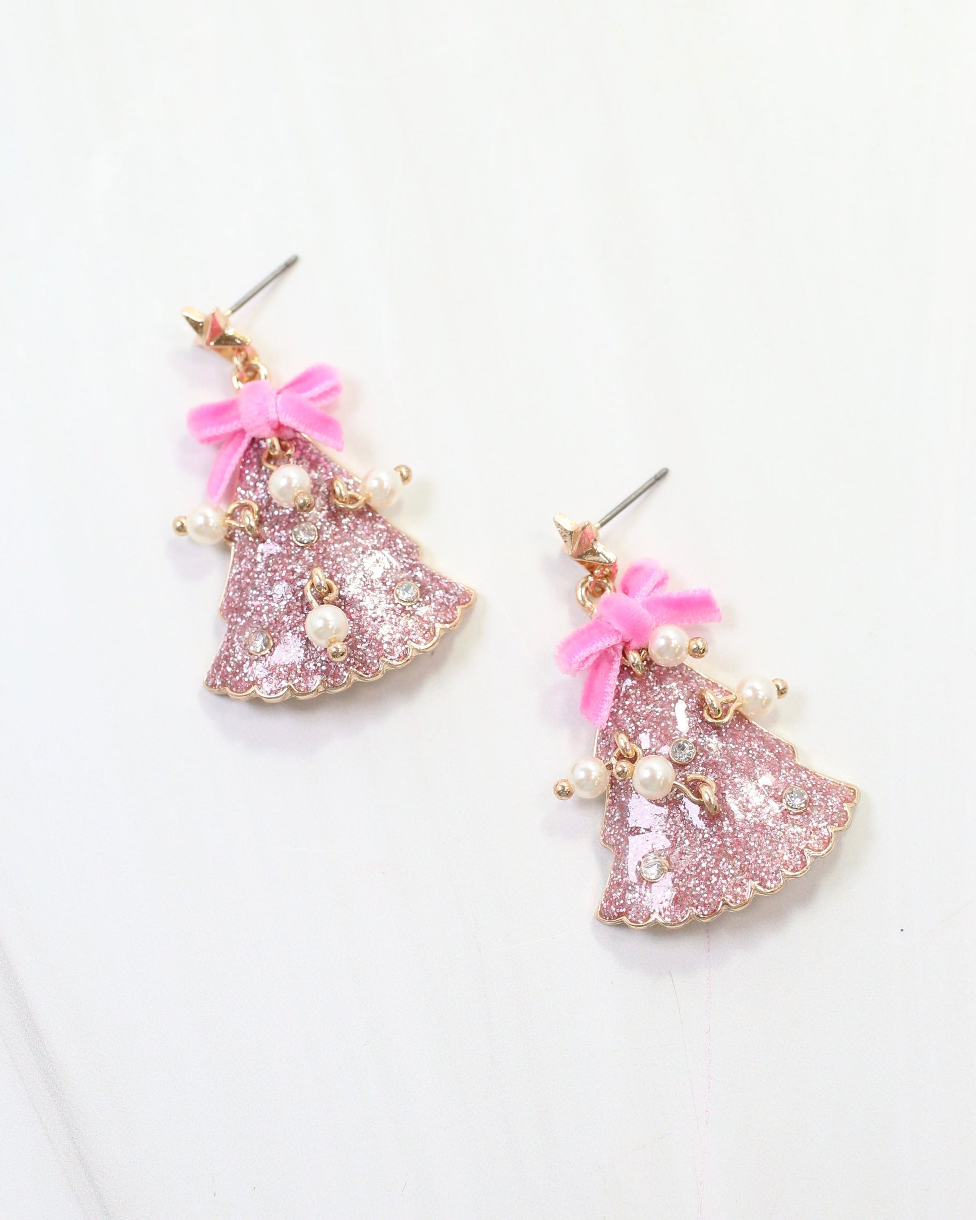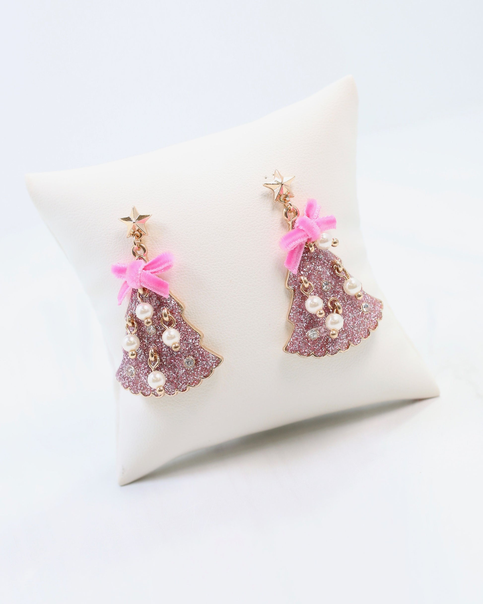 Celebrate the season with these fashionable Christmas Tree Earrings in pink enamel. Featuring sparkling clear crystal stones, elegant dangling pearls, and a plush velvet bow, each earring is topped with a charming star post for a festive finish. Perfect for adding a touch of holiday sparkle to any outfit.