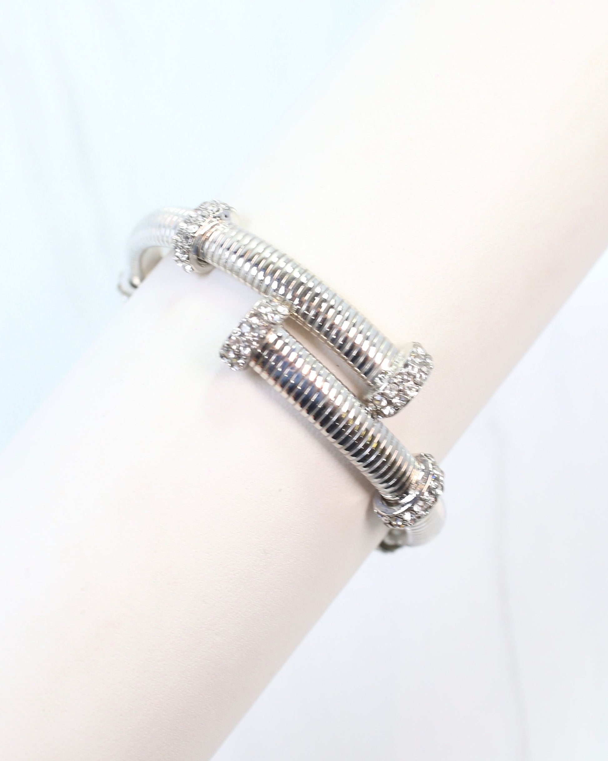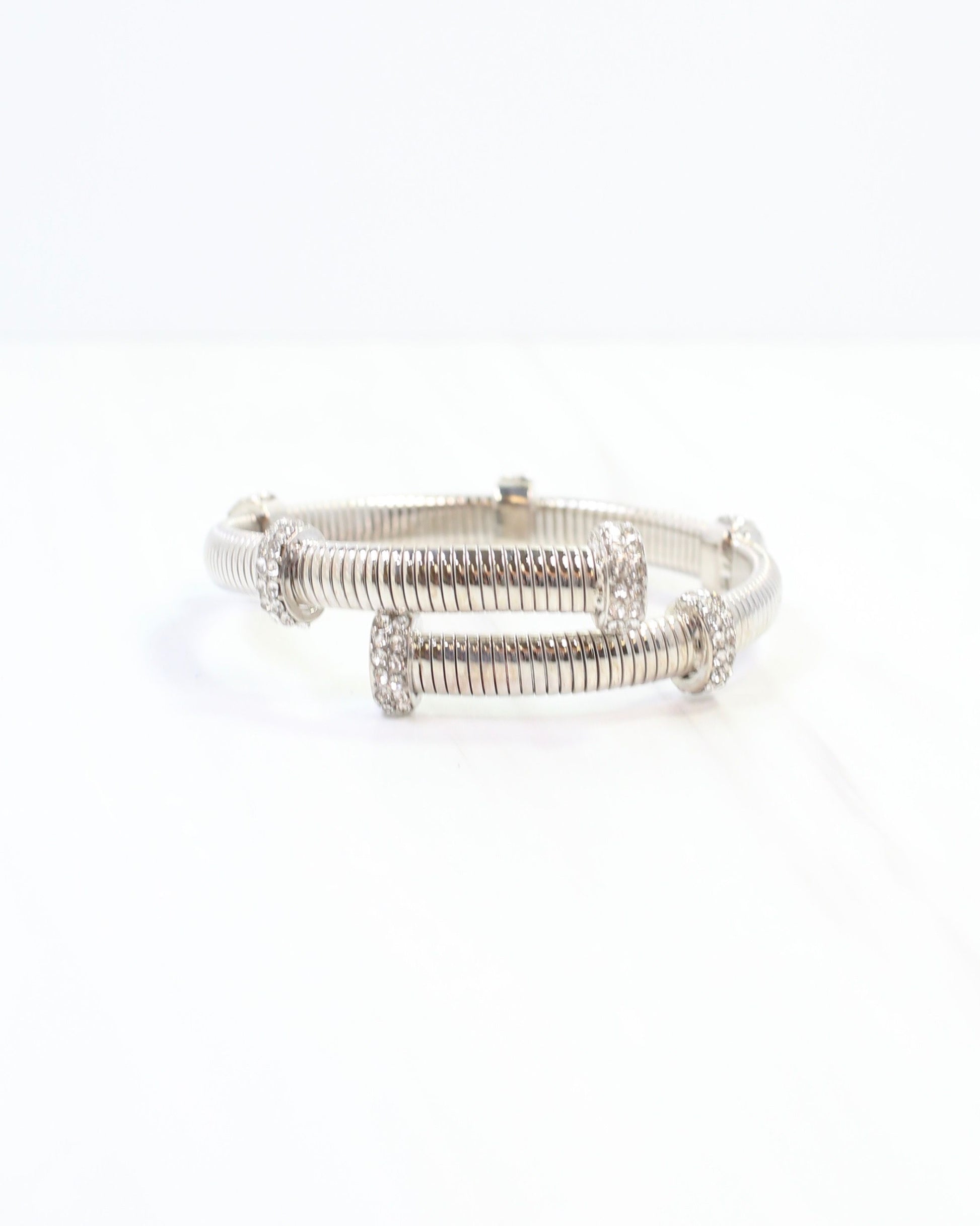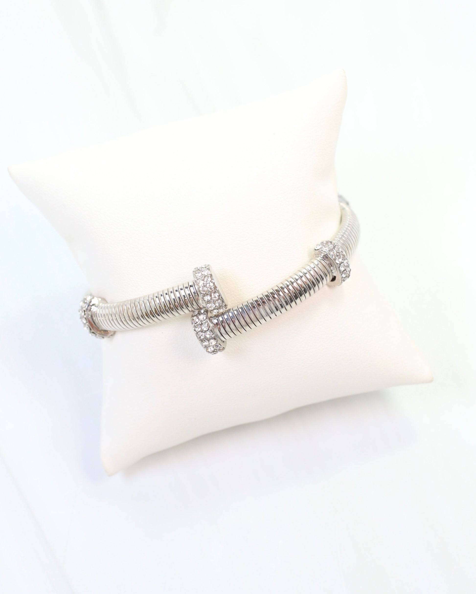 Shine bright every day with the Clayton Crystal Coil Bracelet in Silver! This flexible ribbed wide coil wraps comfortably around your wrist, sparkling with pave station details all around. It’s the perfect playful touch to add a little glimmer to any outfit, anytime.