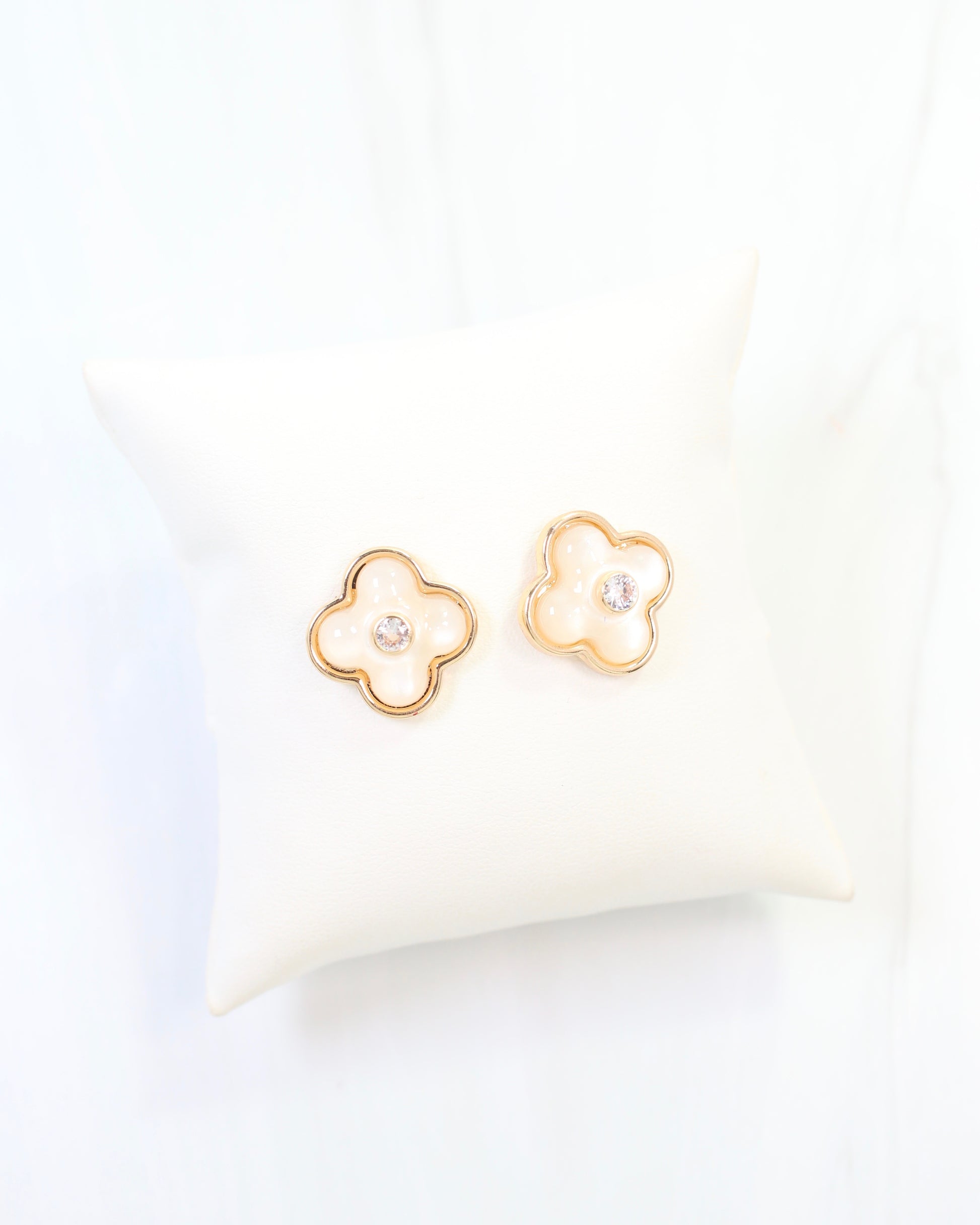 The Colby Clover Stud Mother of Pearl features a stunning pearl centerpiece encircled by a sleek gold edge, with a sparkling diamond set in the center. This fashionable stud blends timeless elegance with modern design, perfect for adding a refined touch to any outfit.