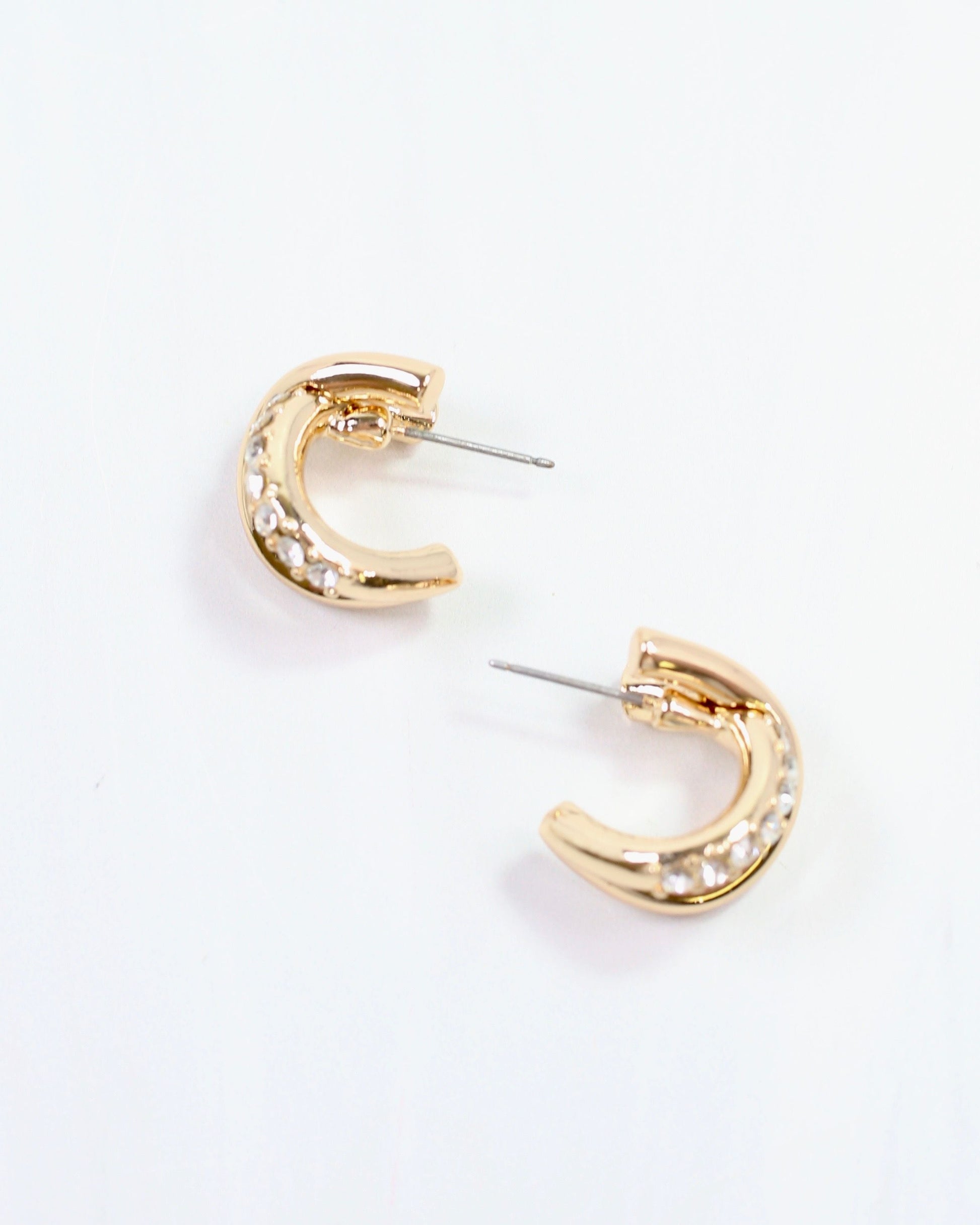 The Coleridge Criss Cross Hoop Earring in Gold features a gold-tone X design with one side adorned by pave czs and the other smooth gold, adding a stylish and modern accent to any look.