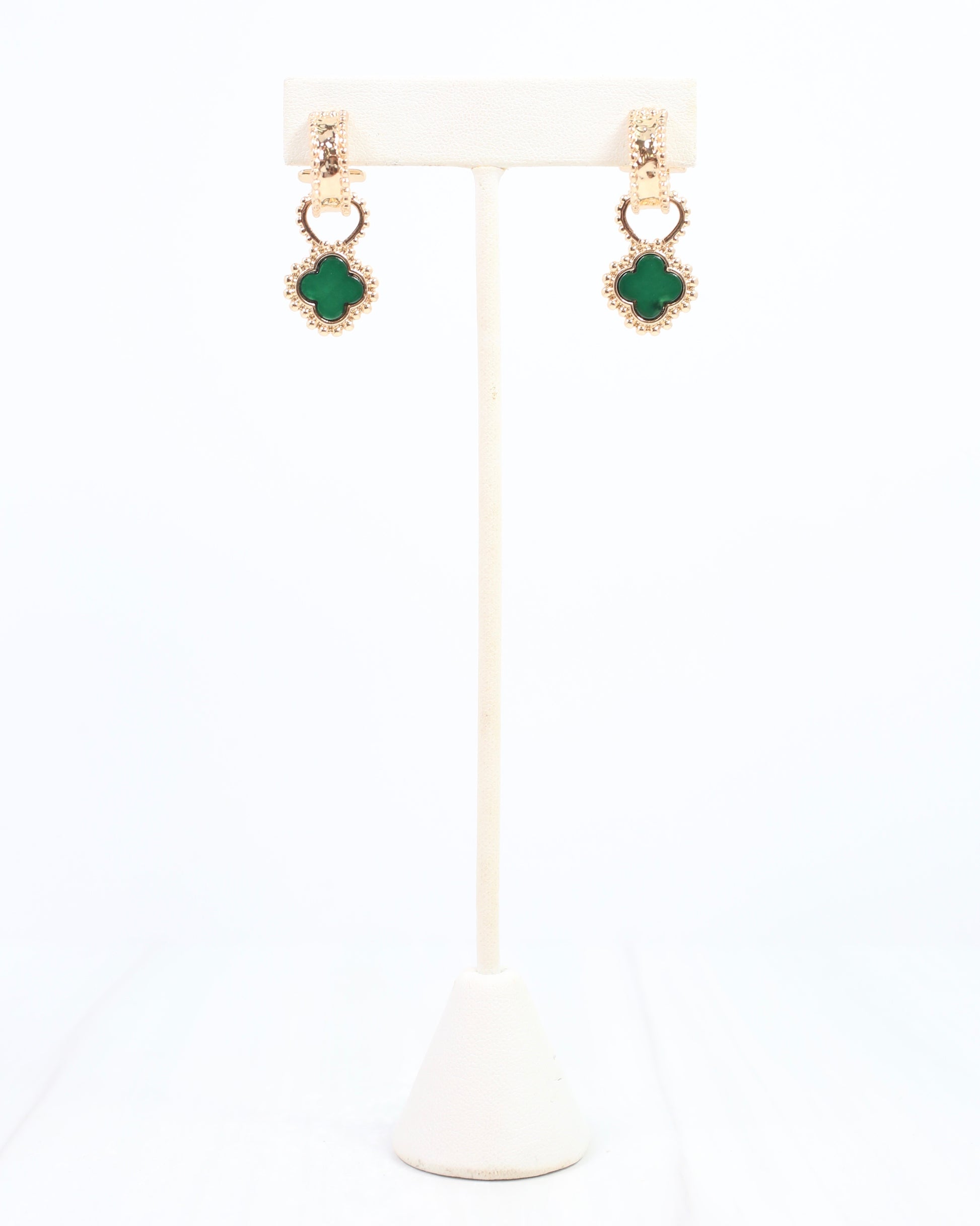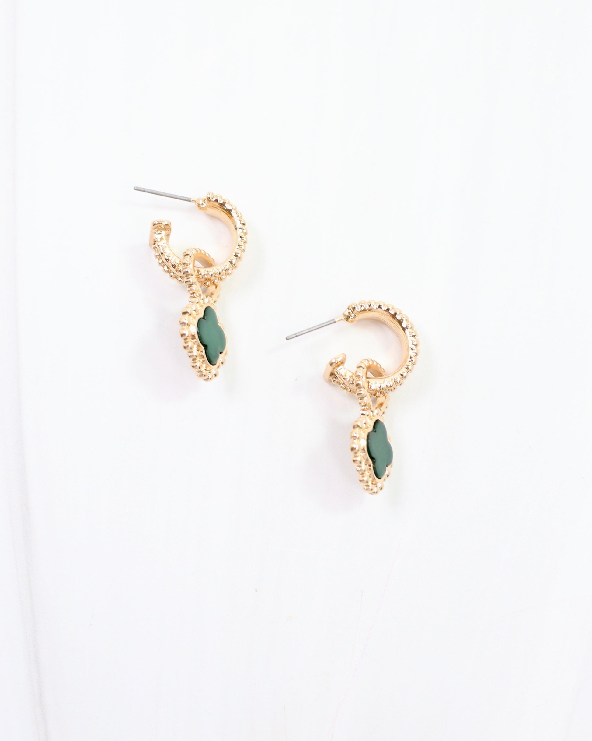 Elevate your everyday look with the Condaleasa Clover Hoop in green. These beautifully textured huggie earrings feature a delicate clover design, adding a touch of charm and sophistication. Perfect for daily wear, they blend subtle elegance with modern style to complement any outfit effortlessly.