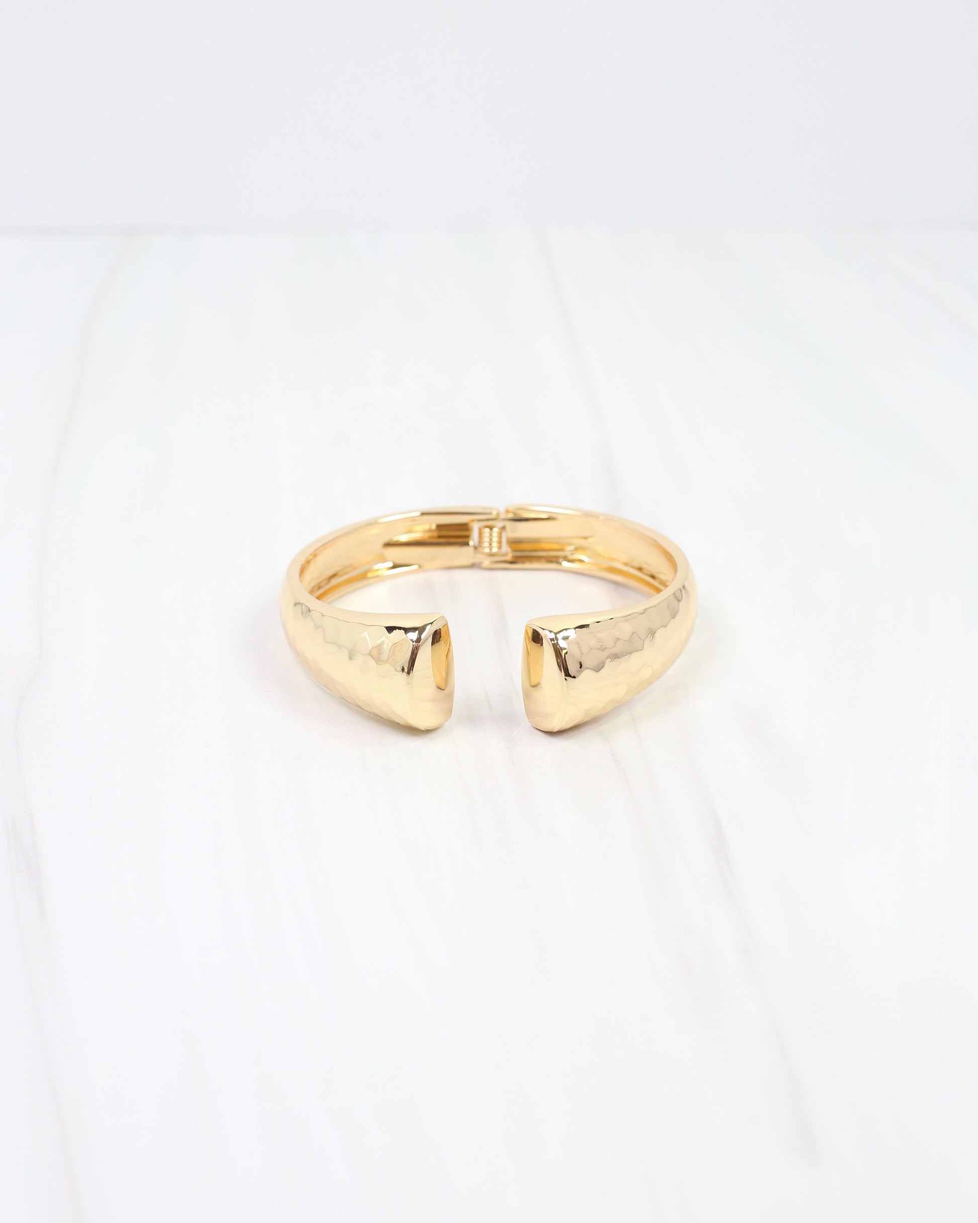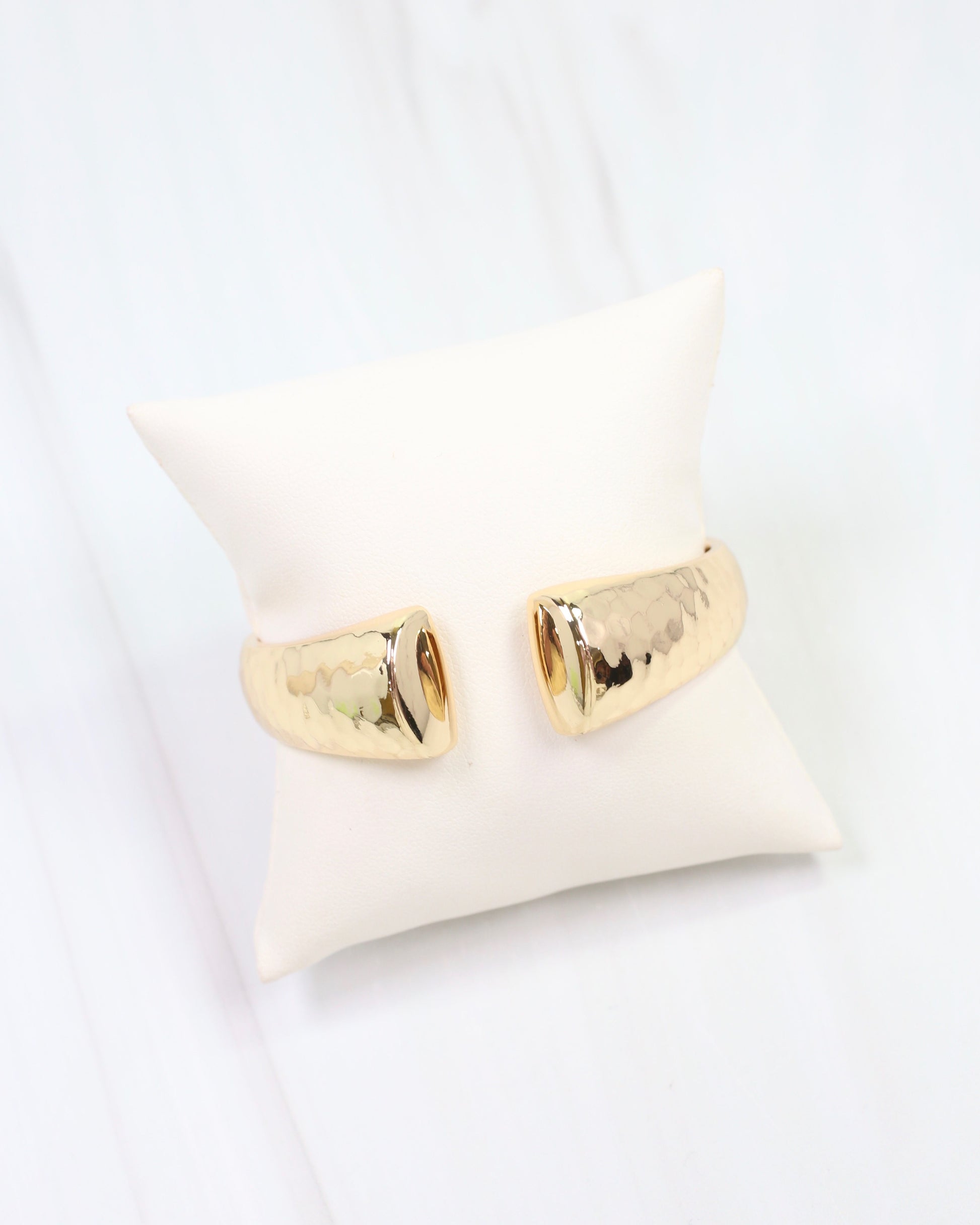 The Corning Hammered Open Cuff Bracelet in lustrous gold features bold artisanal texture and an adjustable open design. Its hand-hammered surface creates striking dimension while the cuff silhouette makes a confident statement. An architectural piece that celebrates modern craftsmanship.