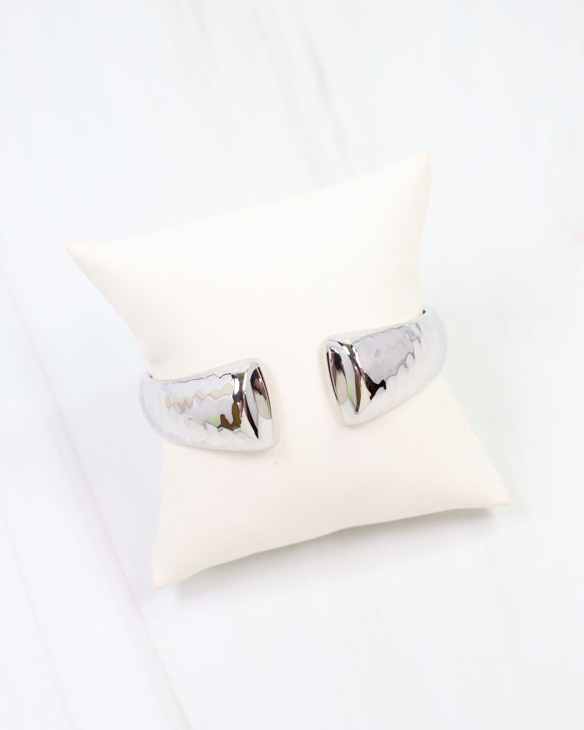 The Corning Hammered Open Cuff Bracelet in gleaming silver showcases striking textured detailing with an adjustable open cuff design. Its artisanal hammered finish reflects light beautifully, creating visual depth and movement. A contemporary statement piece that exudes refined edge.