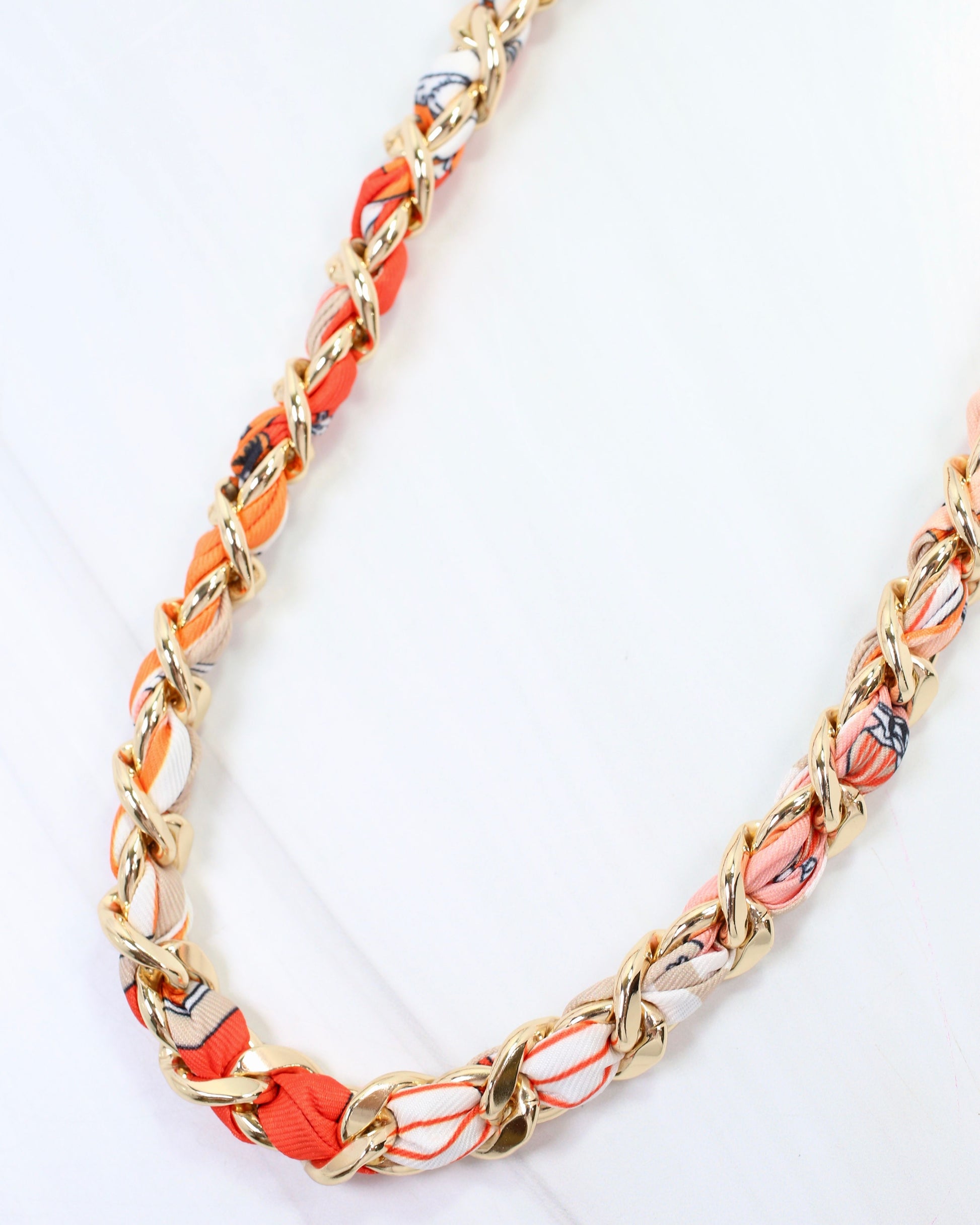 The Corydon Braided Chain Scarf Necklace in Orange brings a vibrant, playful vibe with its braided chain and soft scarf blend. This fun accessory adds a burst of color and texture, perfect for energizing your outfit with a stylish, cheerful flair.