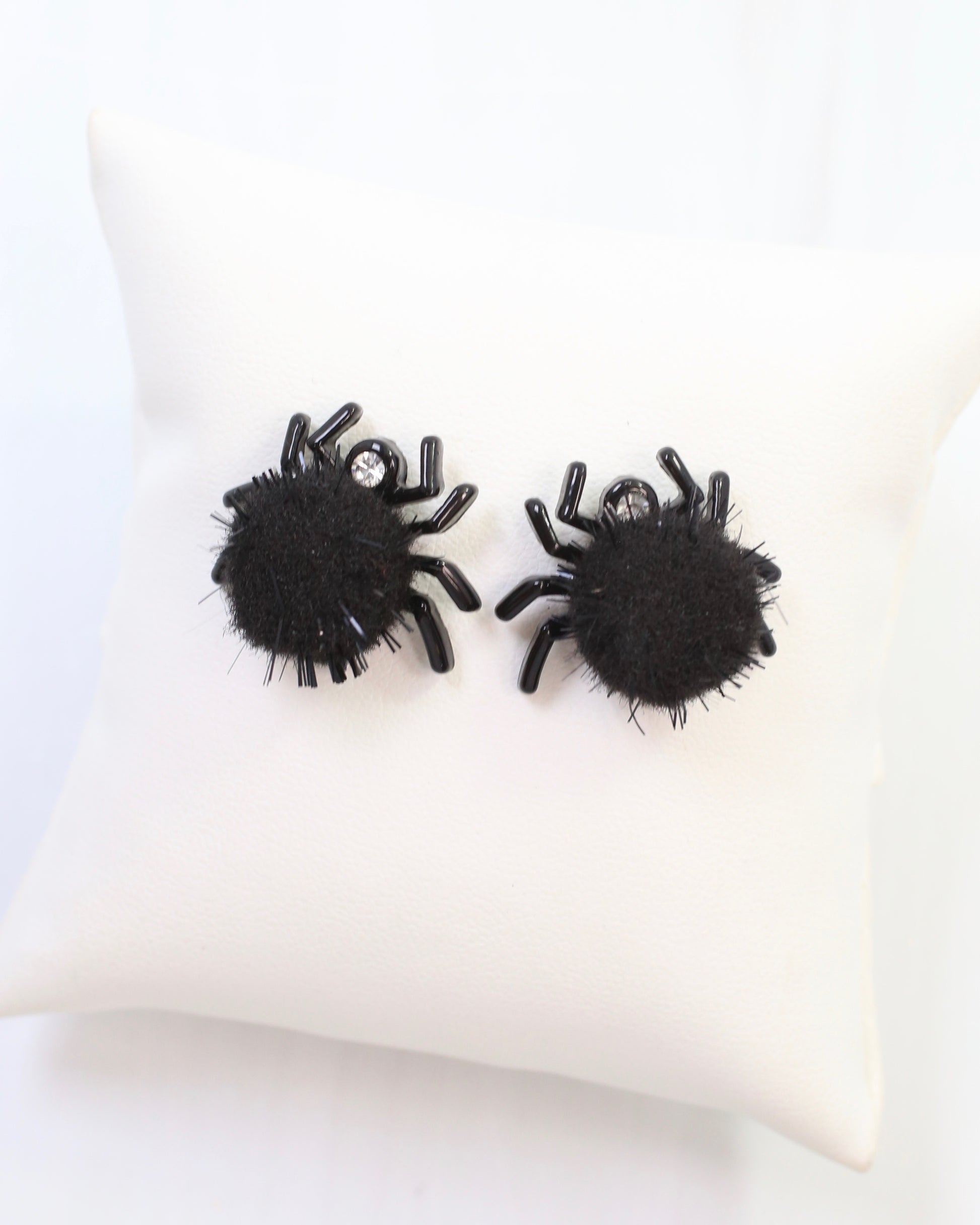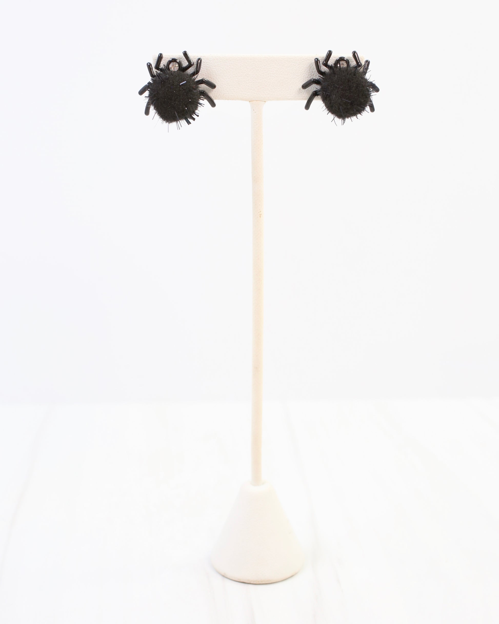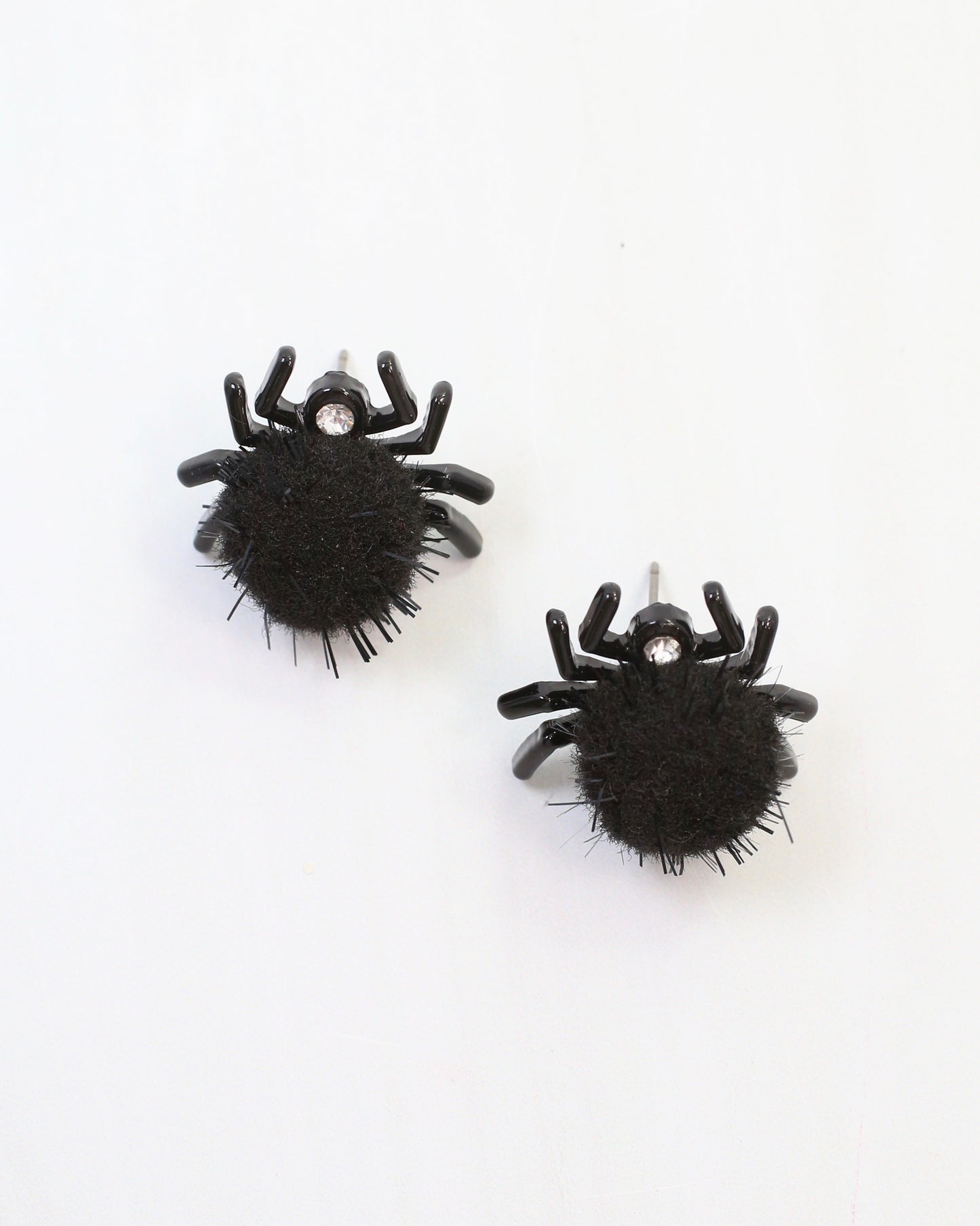 The Creepy Crawley Spider Stud Earring in Black features a fuzzy pom pom body, acrylic legs, and a crystal head. This fun, lightweight stud adds a stylish Halloween touch to any outfit.