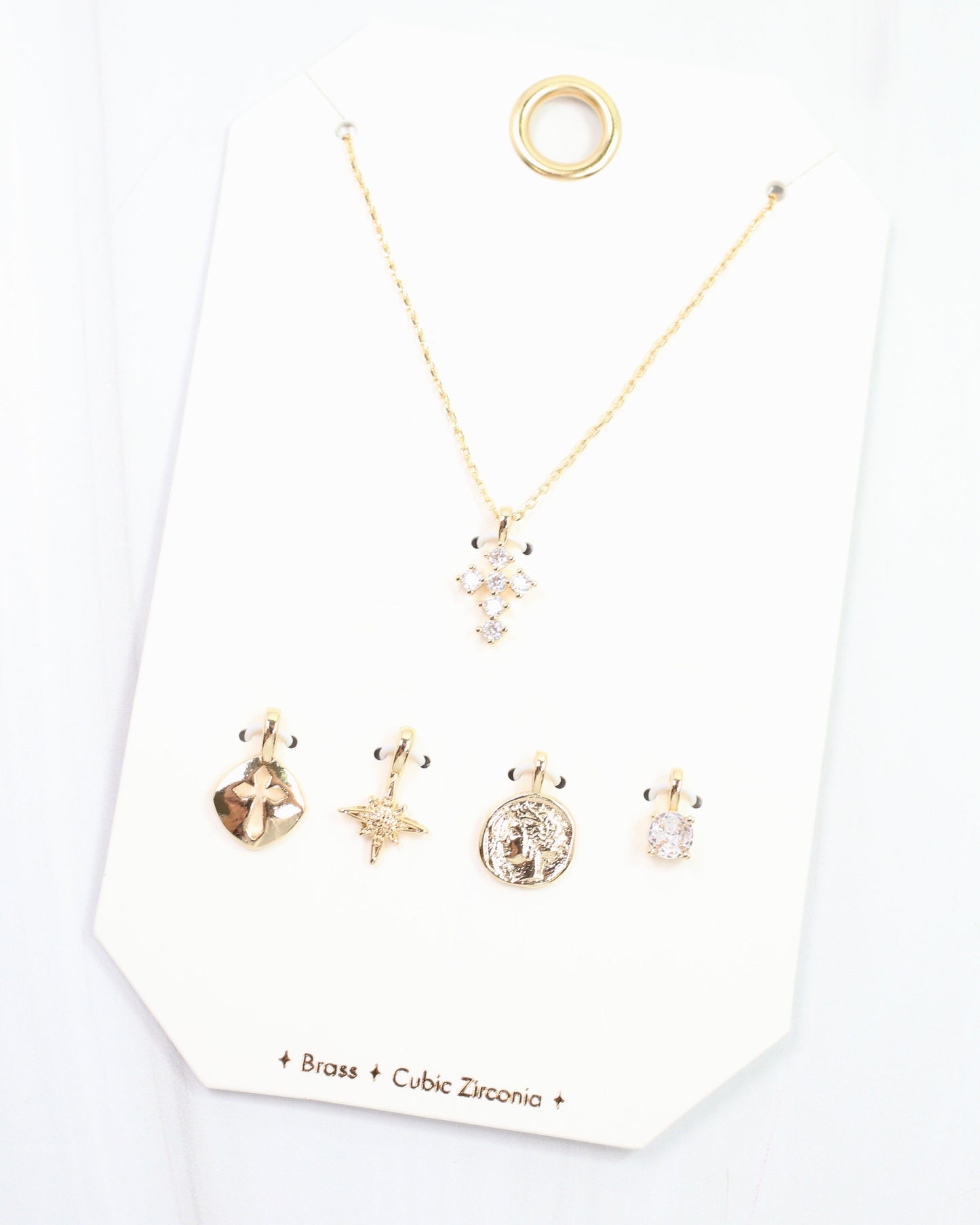 Add a touch of sparkle and charm to your look with this playful gold necklace set. Featuring a delicate chain adorned with five unique charms—a cz cross, open cross, coin, solitaire, and starburst—it's perfect for mixing and matching or wearing all together for a fun, layered vibe.