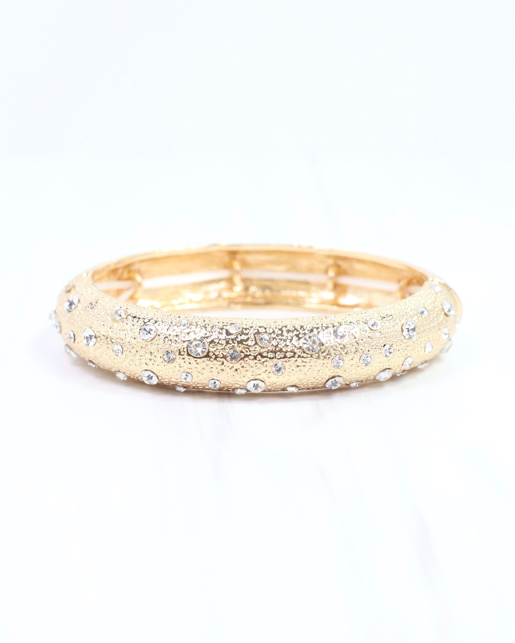 Elevate your style with the Danice Textured Gold Bracelet featuring delicate cz accents. This stretch bangle combines a unique textured gold finish with subtle clear stones for a chic, fashionable look. Its flexible design ensures a comfortable fit for most wrist sizes, making it a versatile accessory for any outfit.