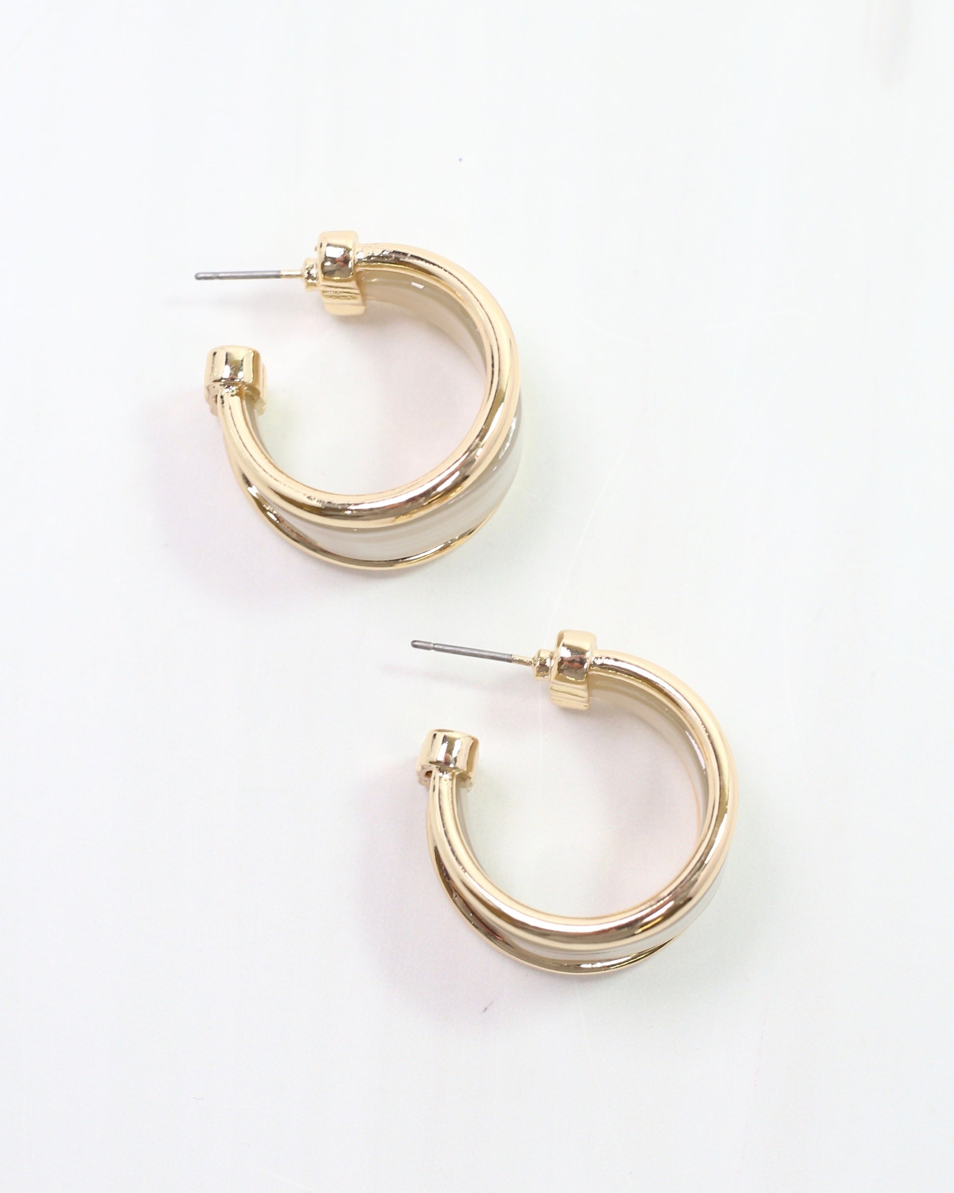 Add a splash of autumn charm to your look with these Daphne Gold Trimmed Hoop Earrings. Lightweight and effortlessly stylish, their warm grey acetate and shiny gold accents blend with any outfit, making them your go-to for cozy fall vibes. Easy to wear, impossible to ignore!