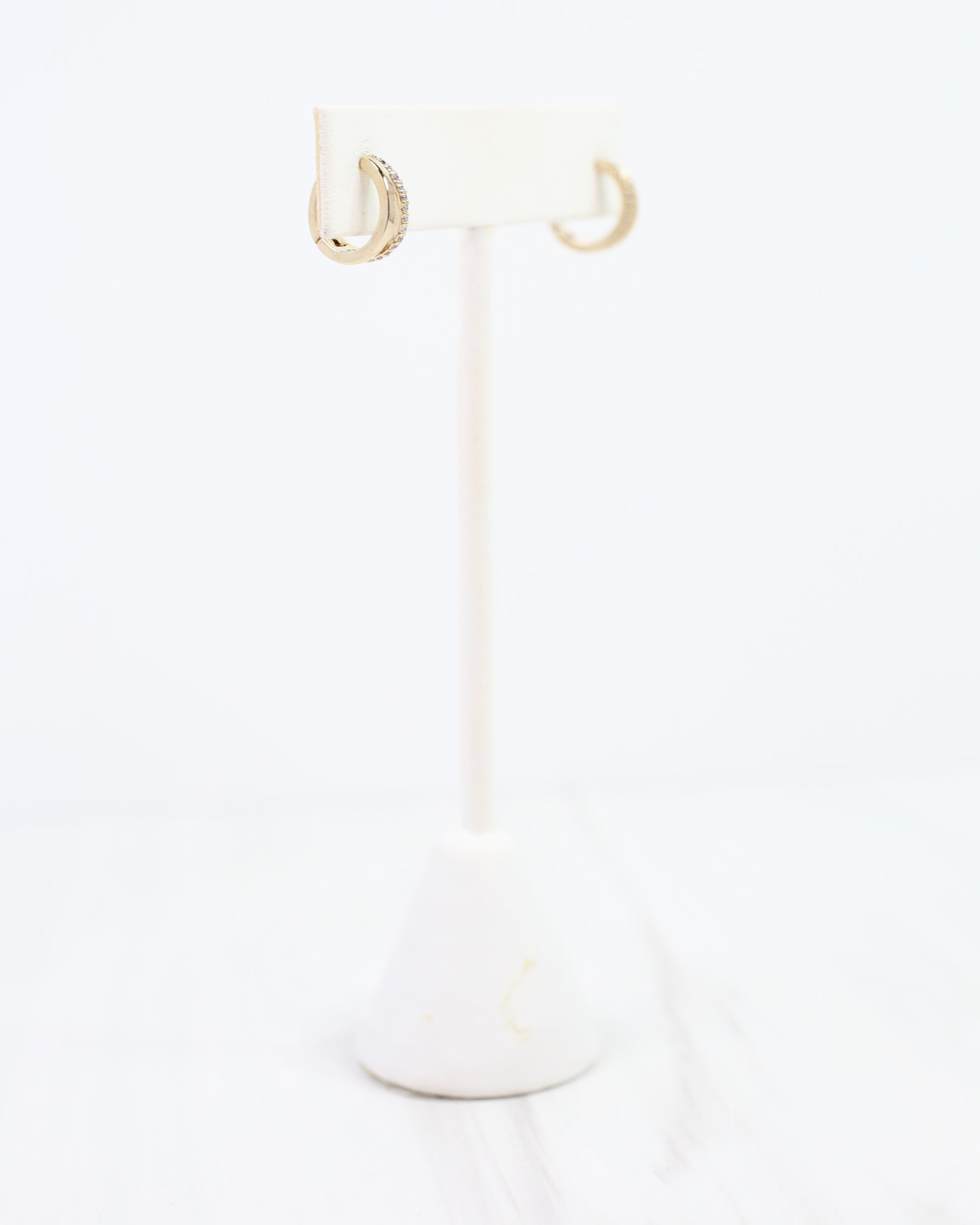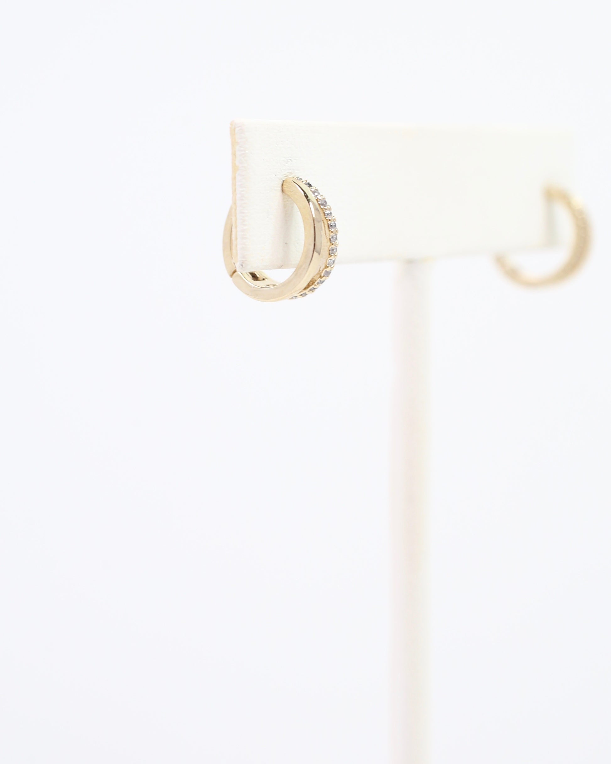 Add a dash of sparkle and shine with the Darlington Huggie Earring in Gold! This hinged huggie charms with a split-front design—one side dazzling with CZ detail, the other glowing in polished gold. Crafted from gold-dipped brass, it’s the perfect playful pop to any outfit.
