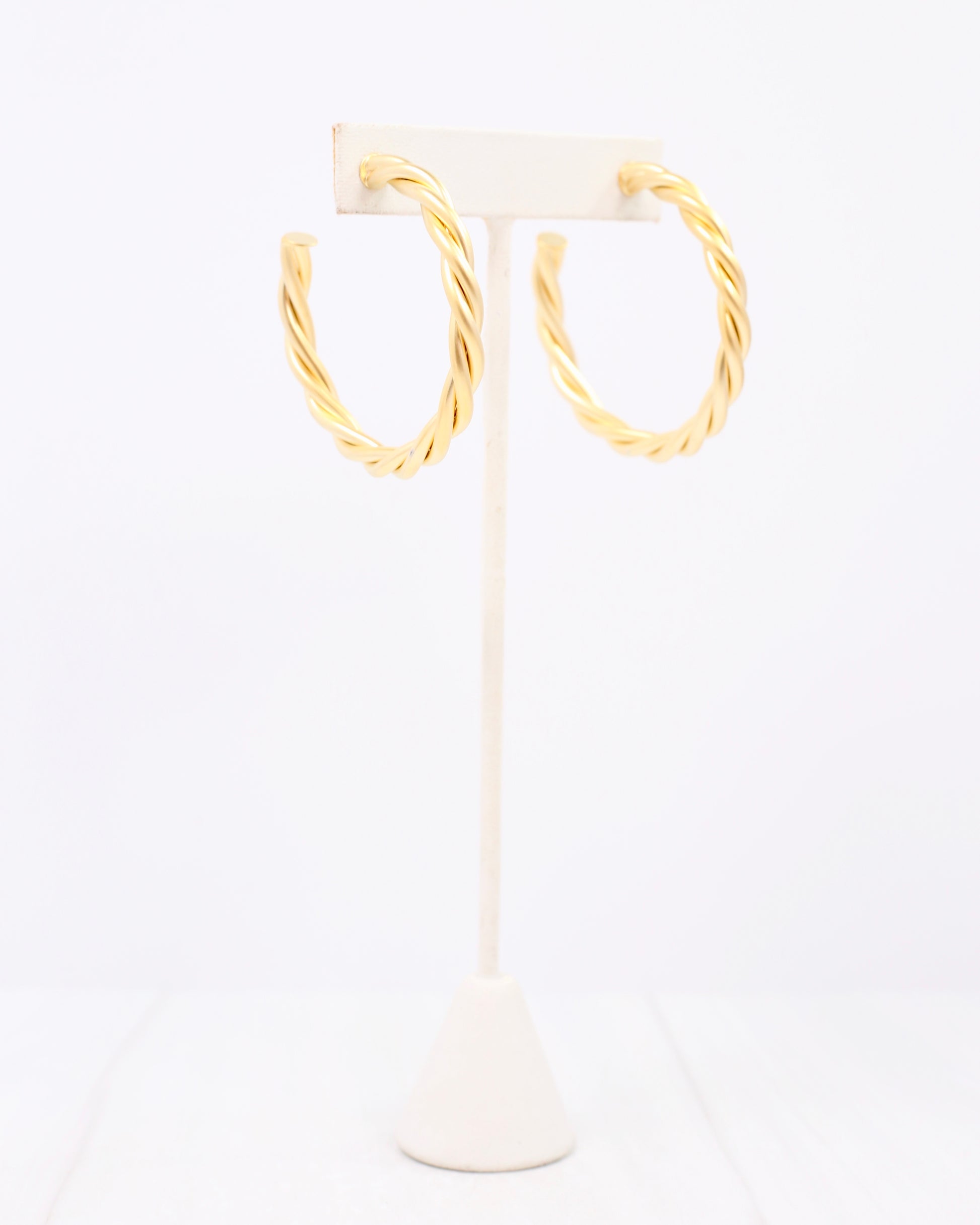The Davies Twisted Hoop Earring in 18K gold-filled matte finish adds a stylish twist to your everyday look. Durable and elegant, it’s perfect for all-day wear.