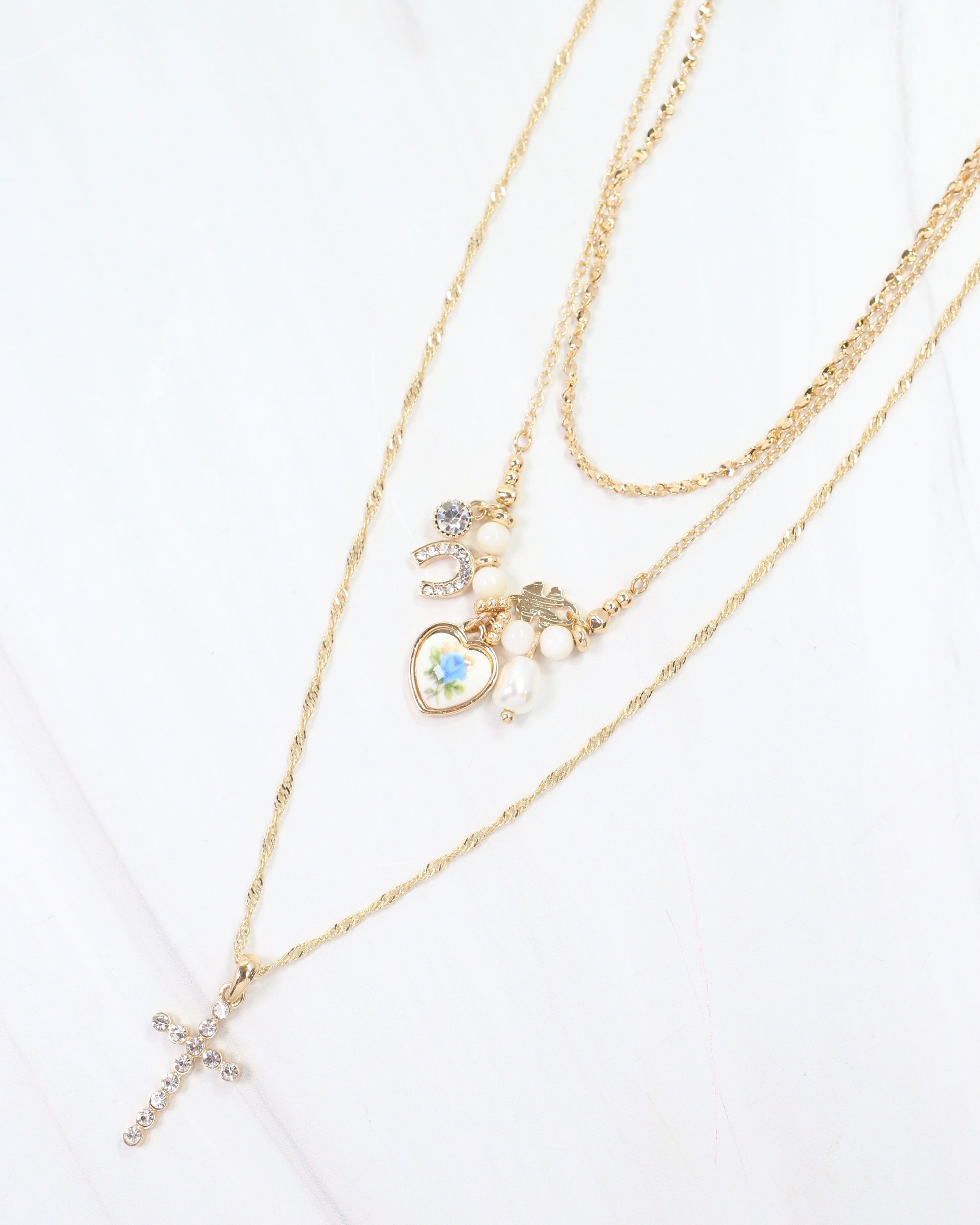 This delightful 3-layer necklace adds a playful touch to any outfit with its charming gold cross and heart charm featuring a pop of blue. Perfectly layered for you, it takes the guesswork out of styling and brings a sweet, vibrant vibe to your look.