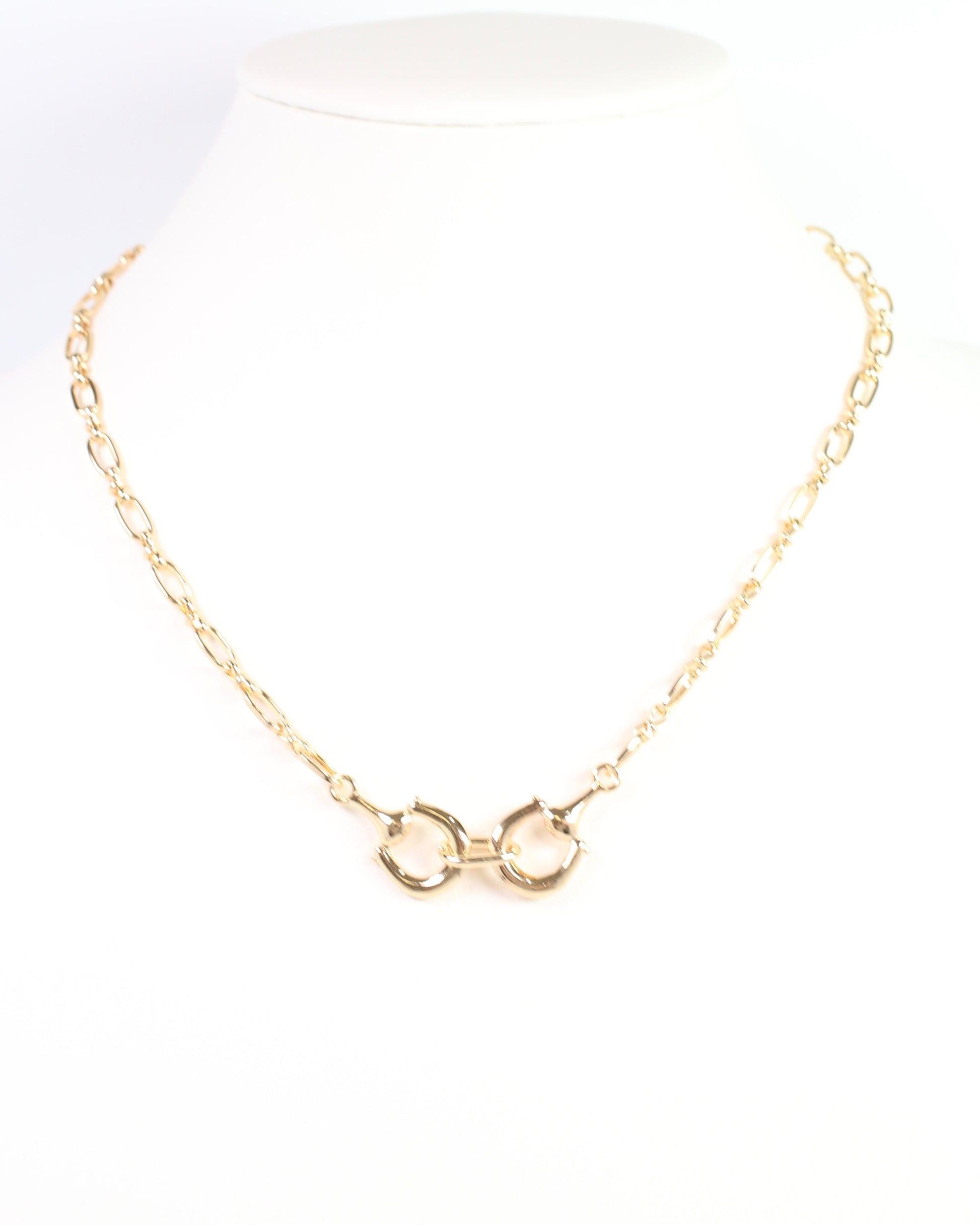 The Declan Double Horsebit Necklace Gold brings classic equestrian charm to your everyday style. Its timeless horsebit design adds a playful twist to any outfit, whether worn alone or layered for extra flair. Perfect for those who love a bit of beauty with a touch of tradition.