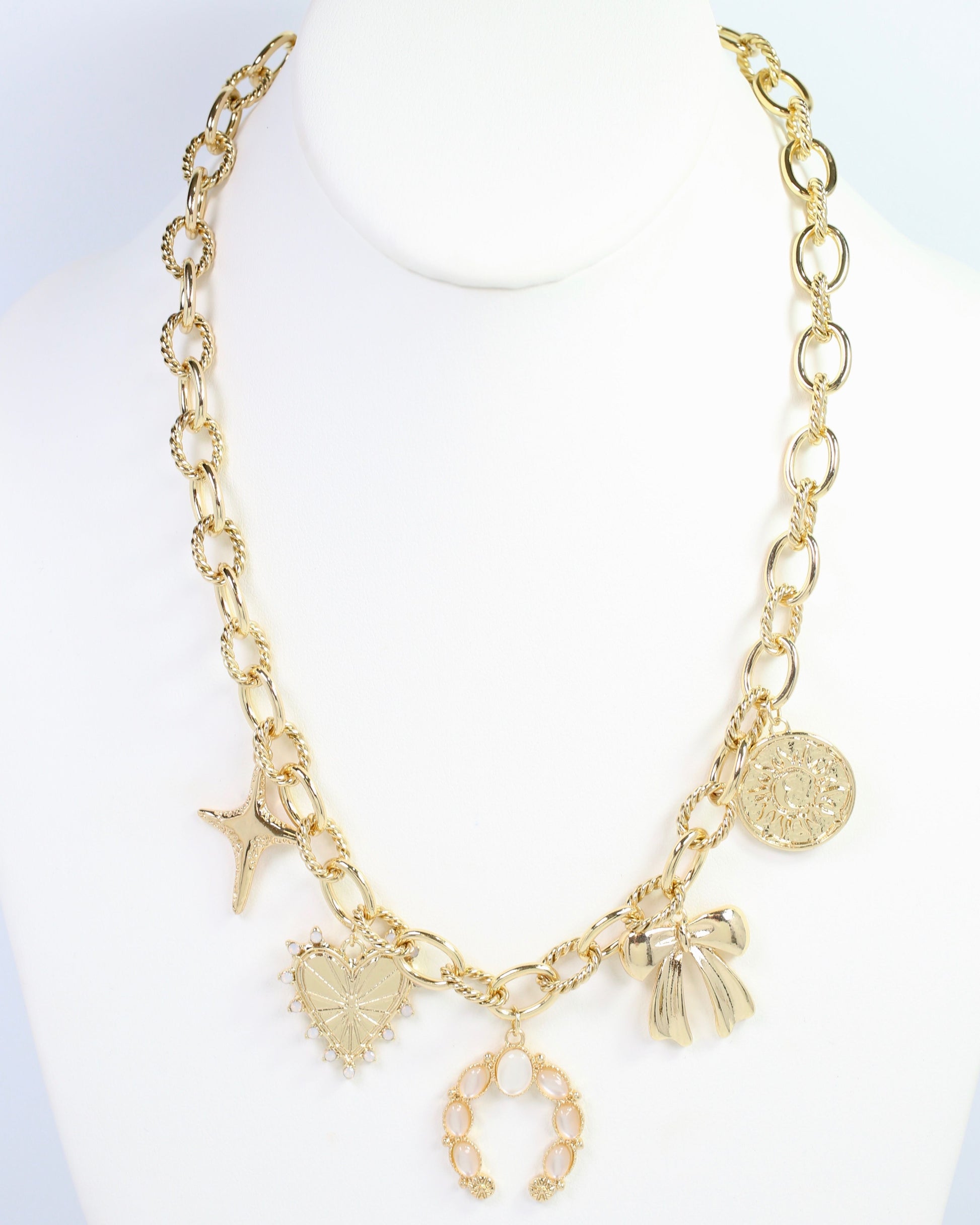 The Denver Western Charm Necklace in Gold offers a stylish blend of western-inspired charms and a warm gold finish. Perfect for adding a fashionable, rustic edge to any outfit, this necklace elevates your look with timeless elegance and modern flair.