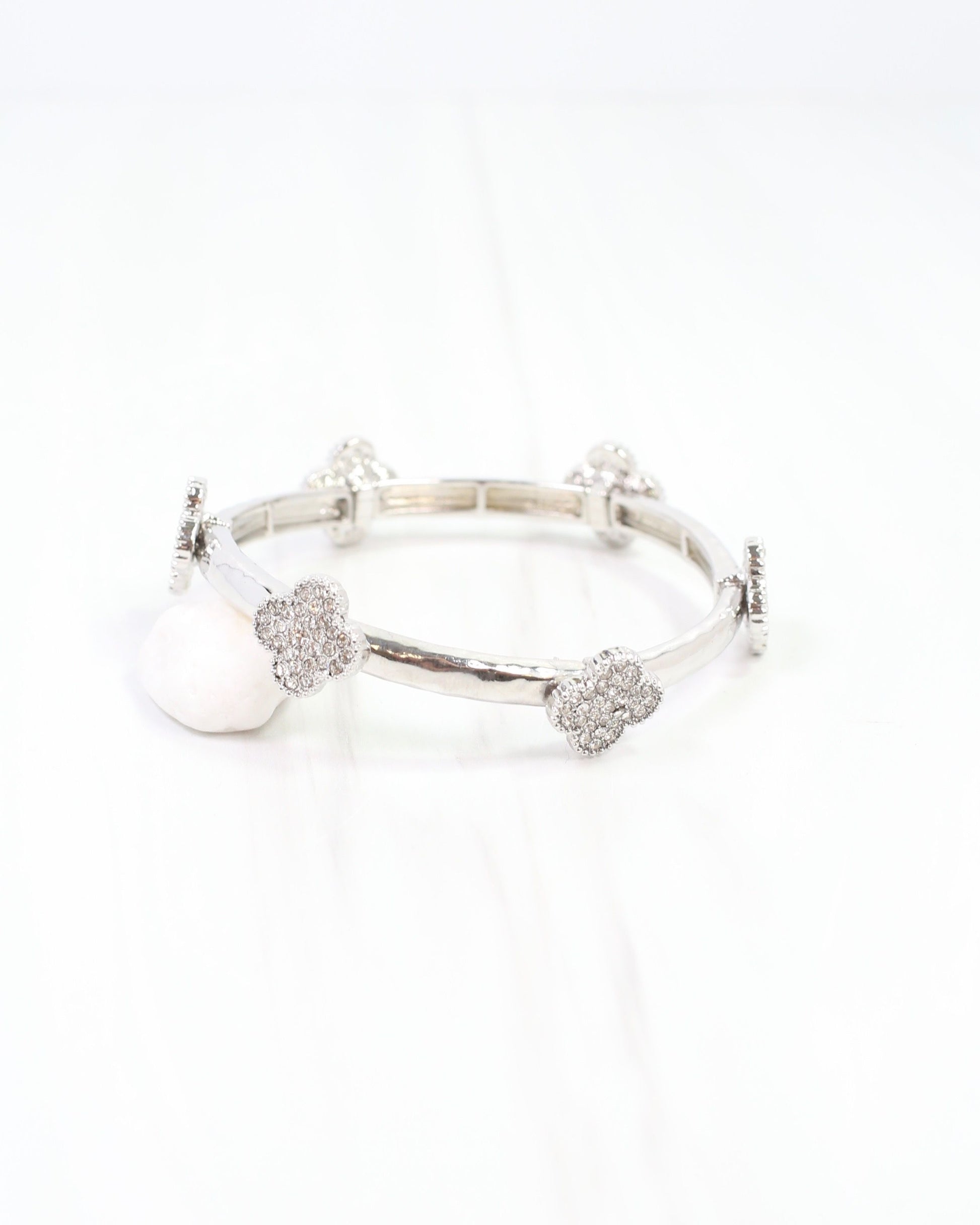This gorgeous bracelet has a shiny hammered finish and features CZ filled clover accents. This piece has a wonderful sparkly look. Pair with your favorite bracelets to fit your own style. Stretches to fit most wrists.