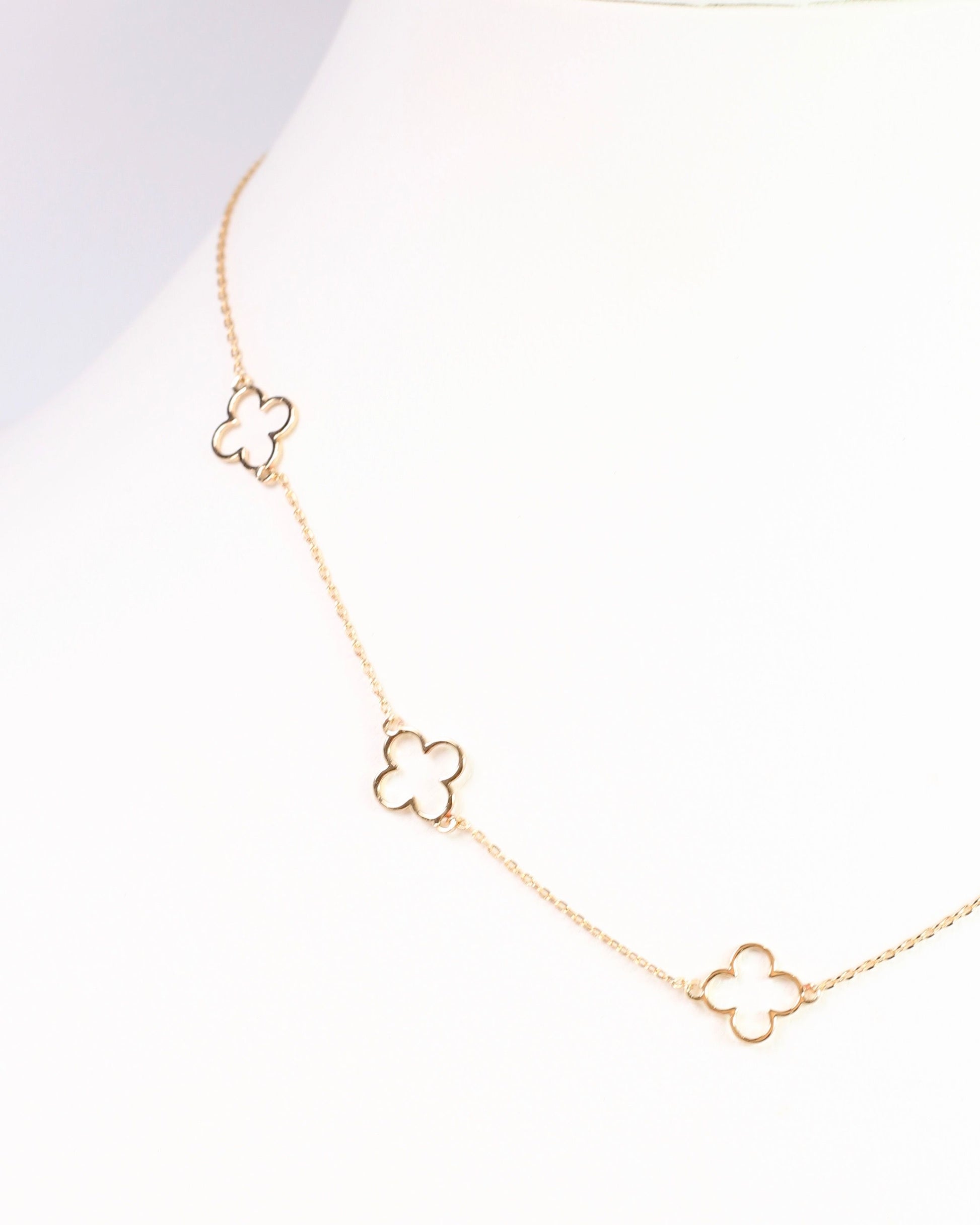 The Dovie Clover Necklace in Gold features a delicate chain adorned with thin, open clover charms, creating a charming and elegant look. Its subtle design makes it perfect for layering with other necklaces, adding a touch of sophistication to any outfit.