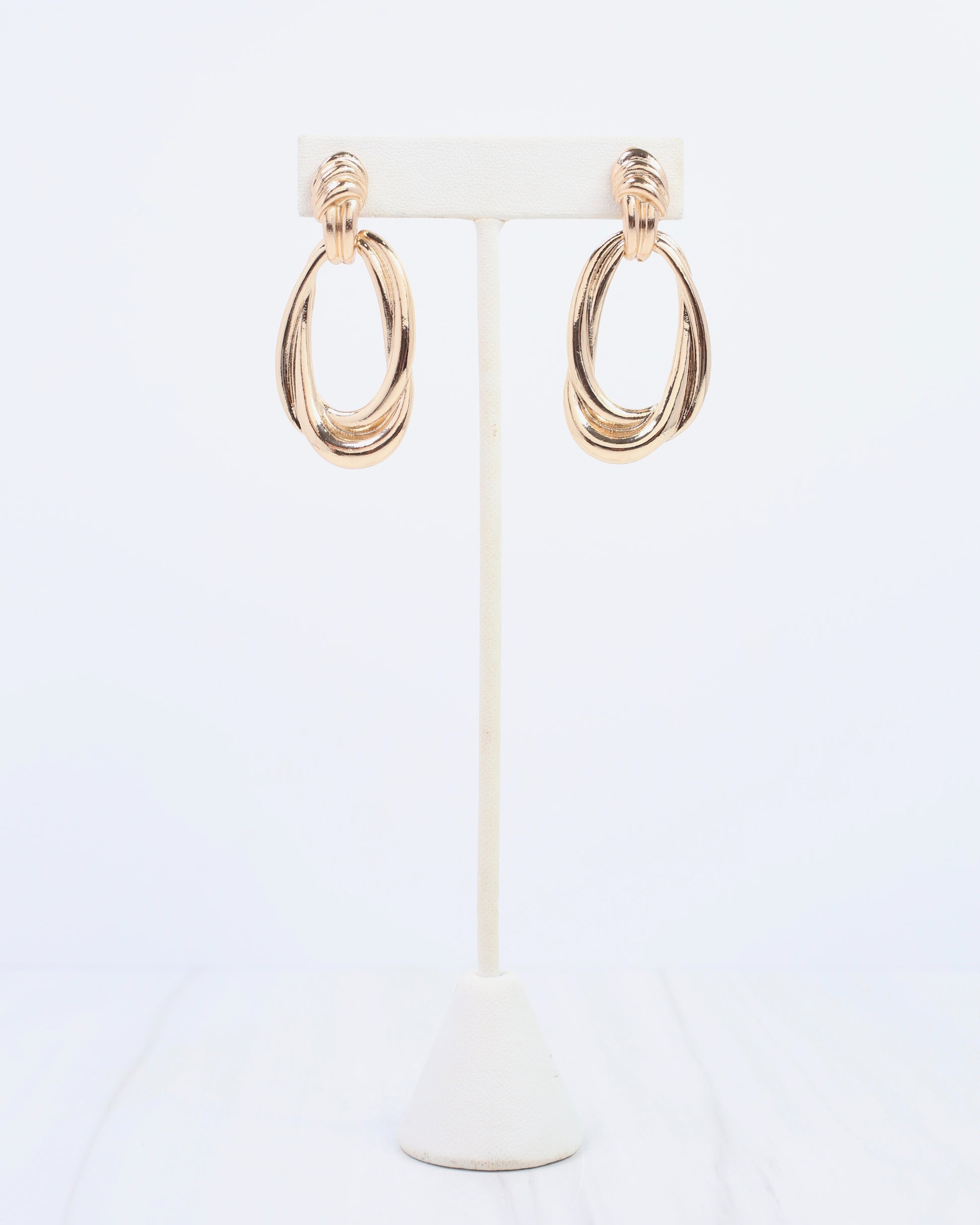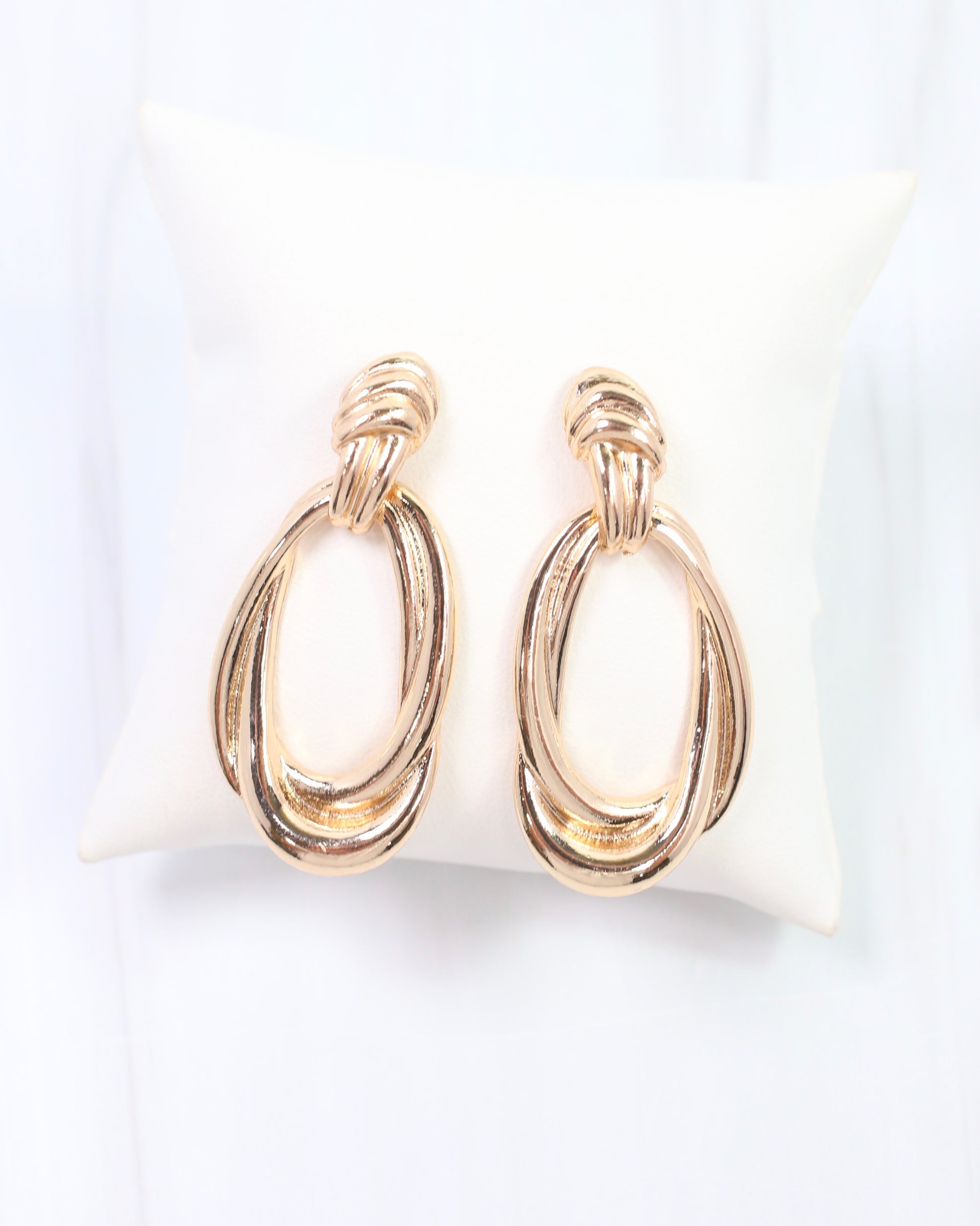 The Durango Drop Earring in Gold showcases an elongated door-knocker design with a polished, chic finish. Its secure post features a swingy drop that adds movement and modern flair, making it a stylish accessory for any fashionable look.