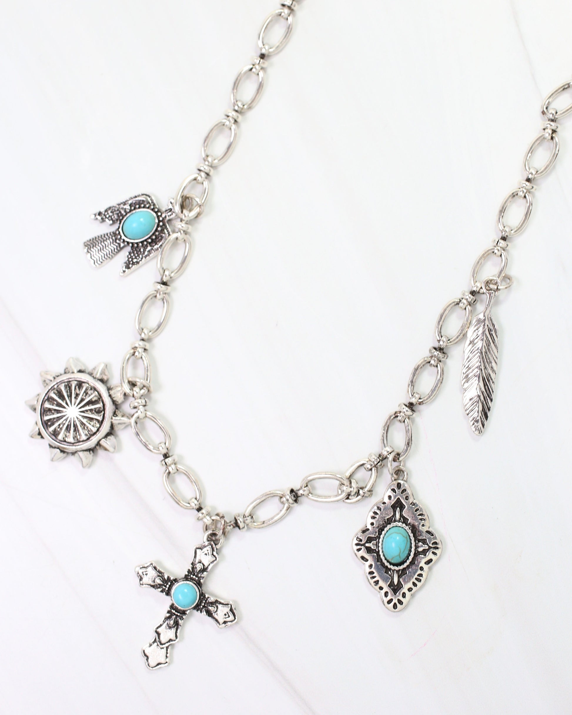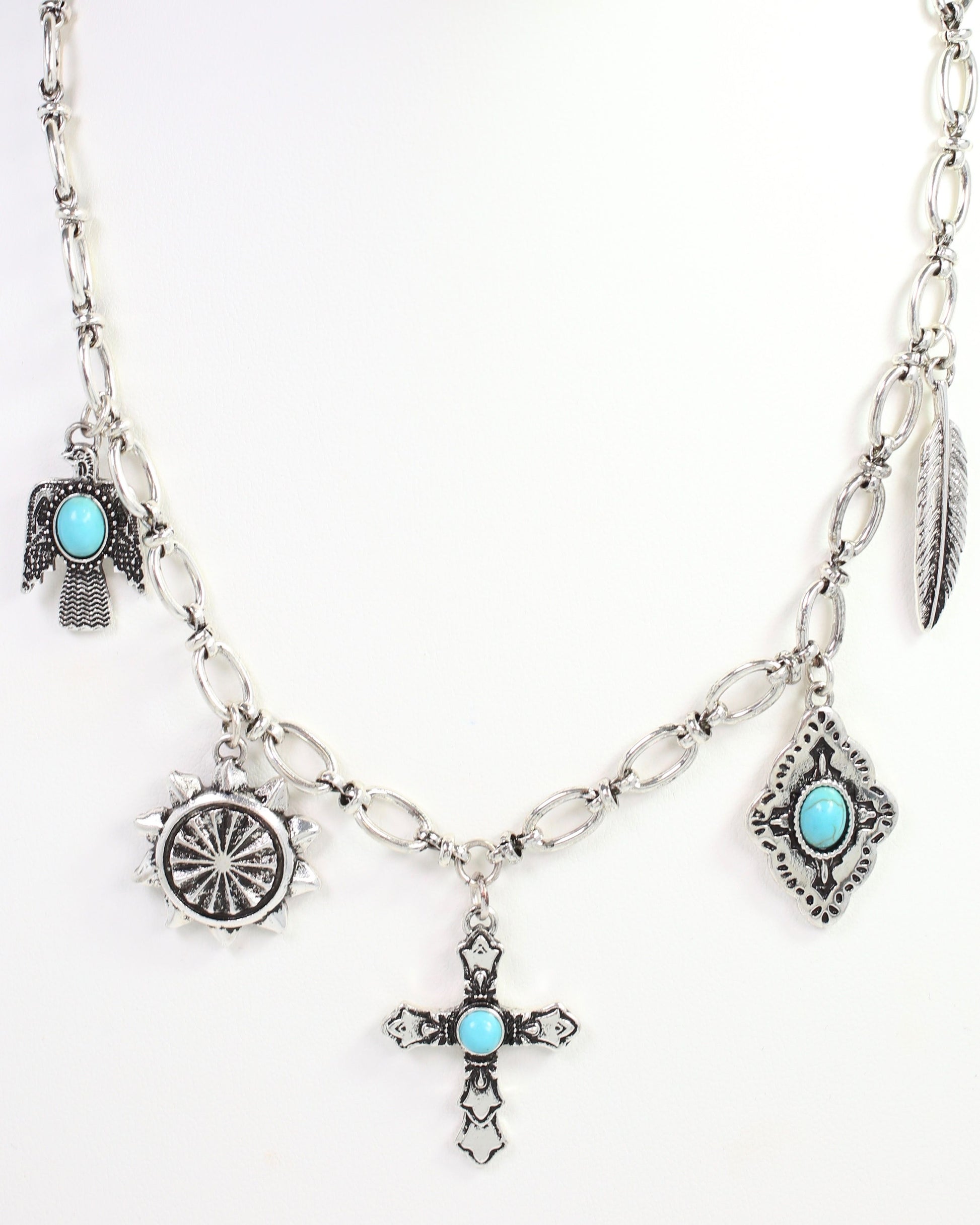 The Durango Western Charm Necklace in Silver blends classic western motifs with a sleek silver finish for a stylish accessory. Perfect for adding a trendy, rustic touch to your wardrobe, it enhances both casual and dressy looks with effortless charm.