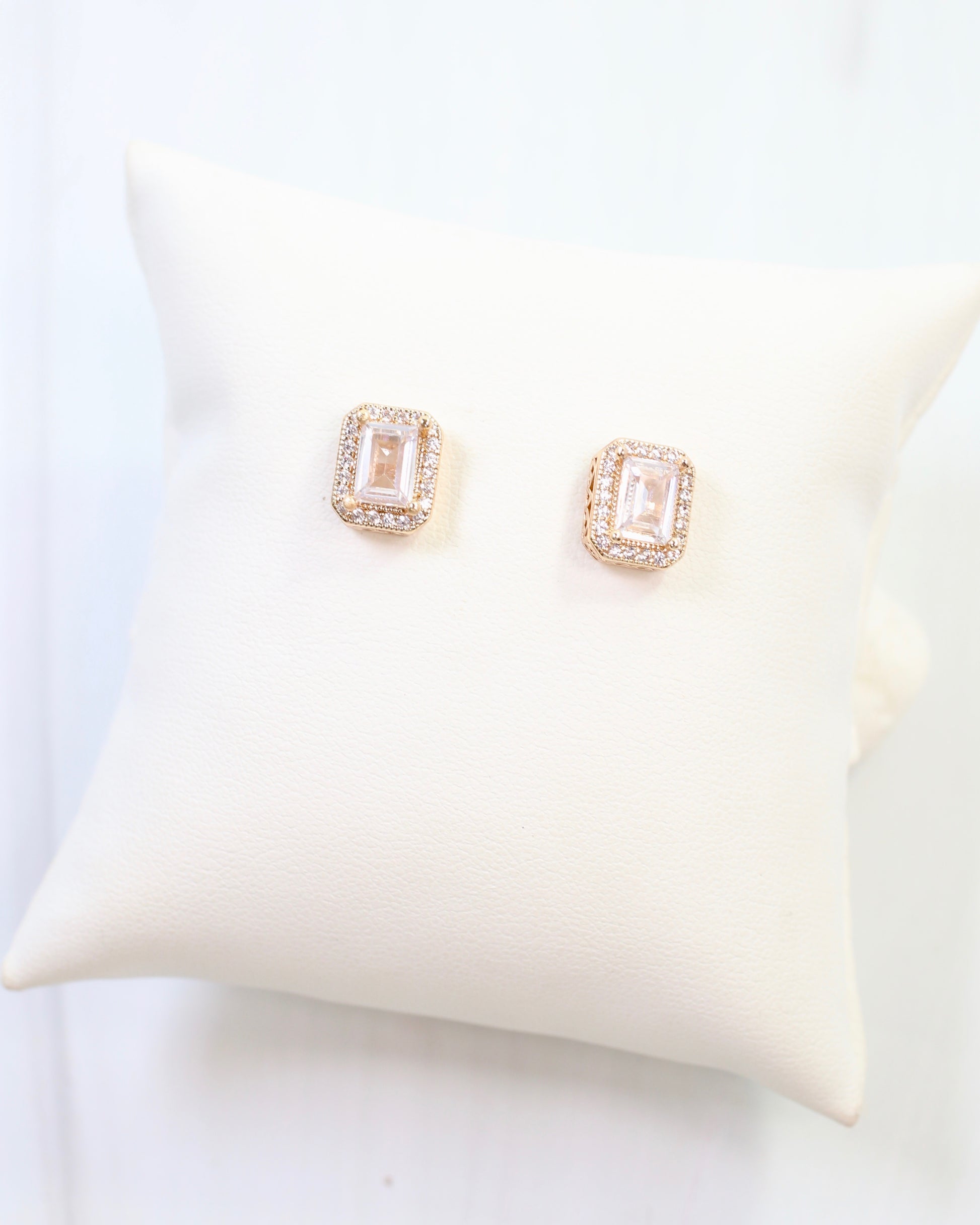 Elevate your style with the Effie Emerald Cut Crystal Stud Gold earrings. Featuring a stunning emerald-cut crystal centerpiece, framed by smaller dazzling CZ stones, these earrings add a touch of refined sparkle to any look. Perfect for both everyday elegance and special occasions, they bring timeless glamour with a modern twist.