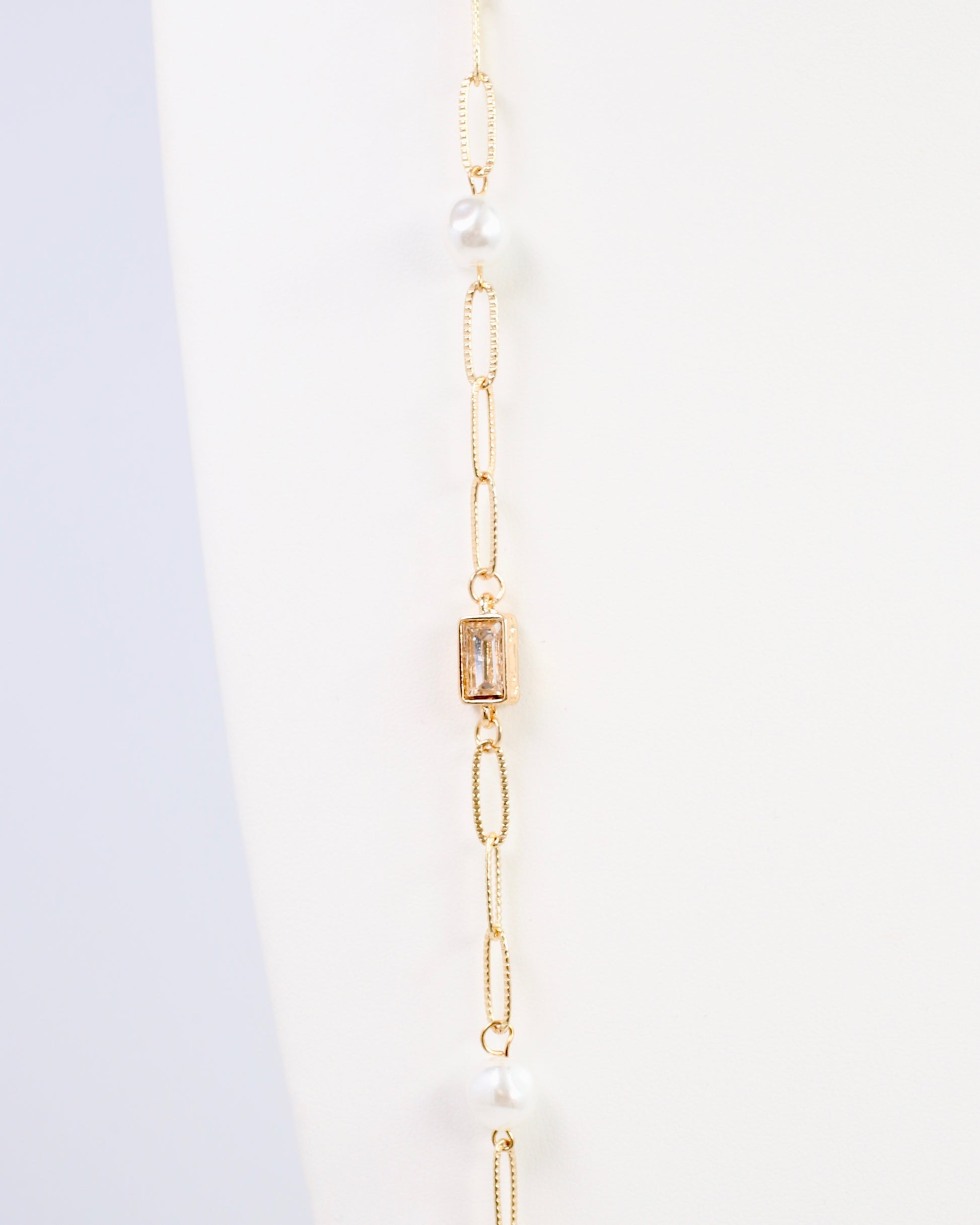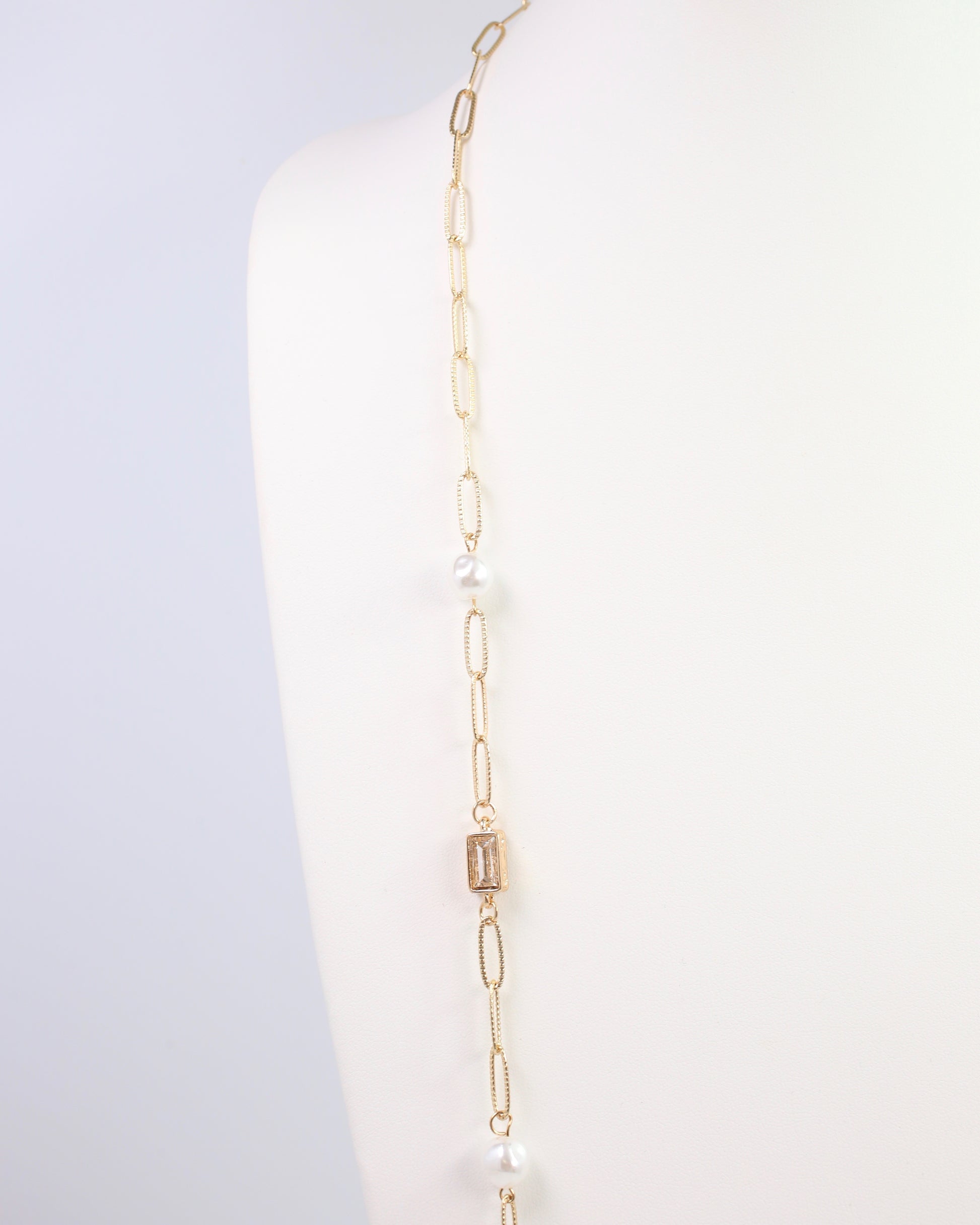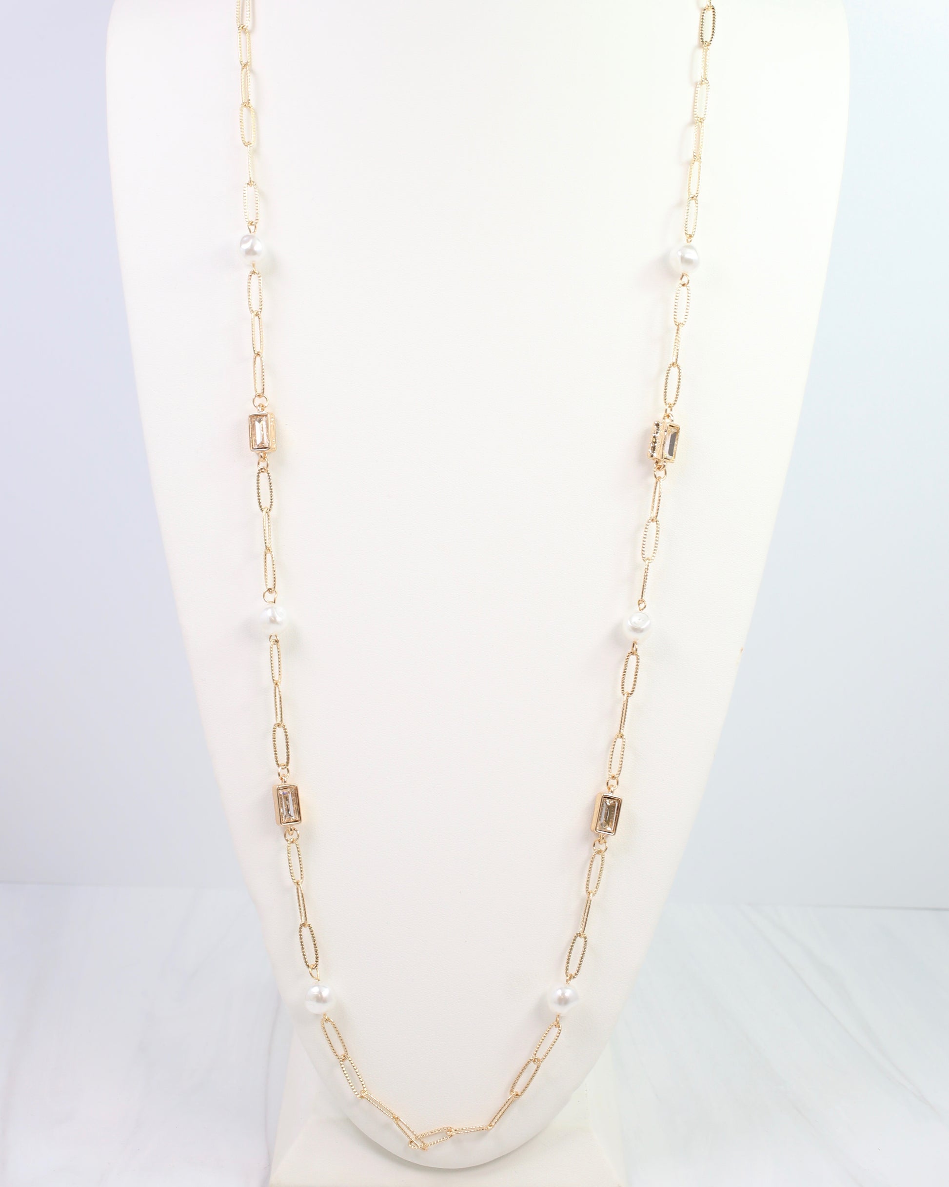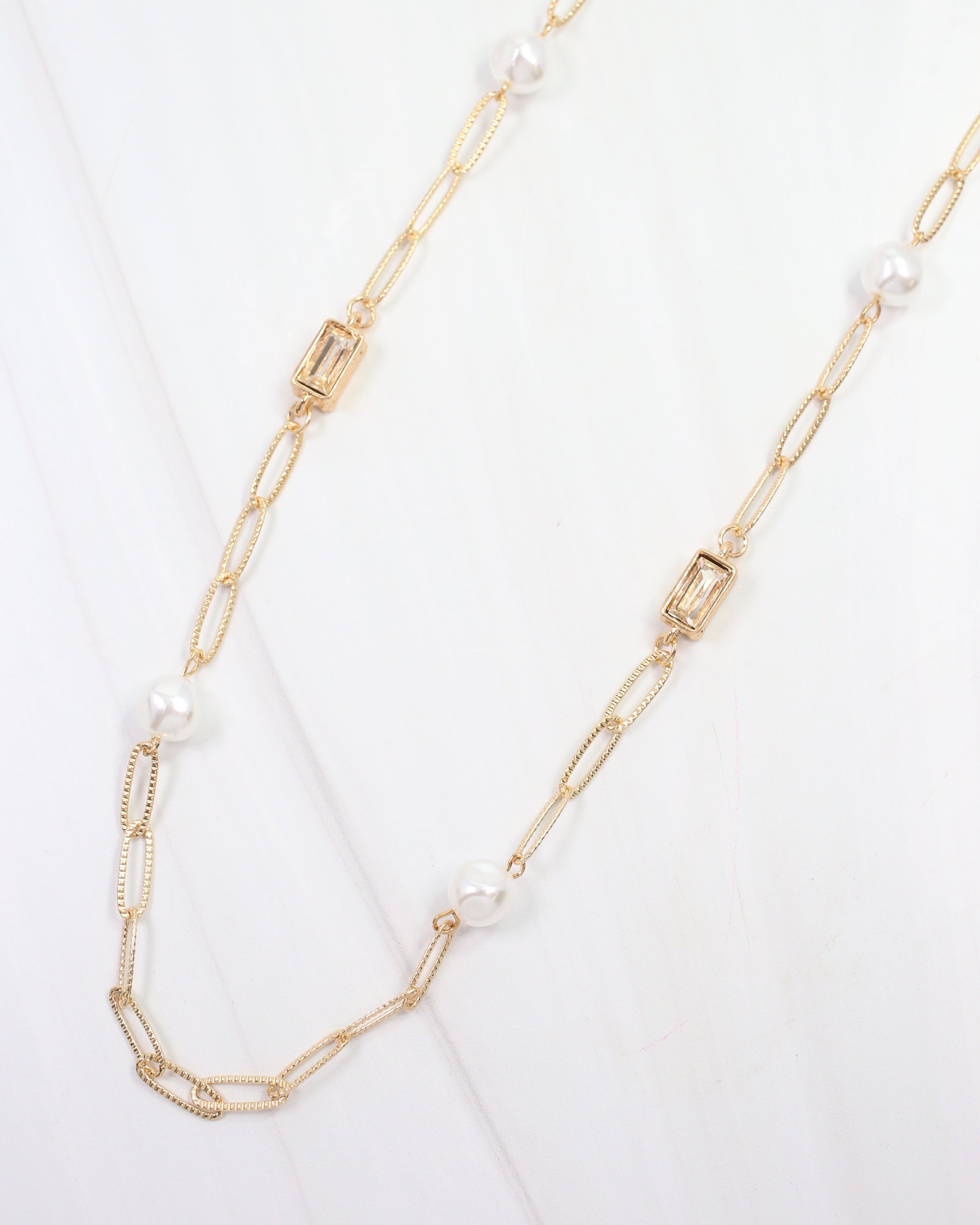 Elevate any outfit with the El Dorado Long Link Necklace Gold. Featuring lustrous pearls and sparkling rectangular crystals, this necklace adds a playful yet elegant touch. Its long length makes it ideal for layering over sweaters or your favorite tops, creating a standout statement that’s effortlessly chic.
