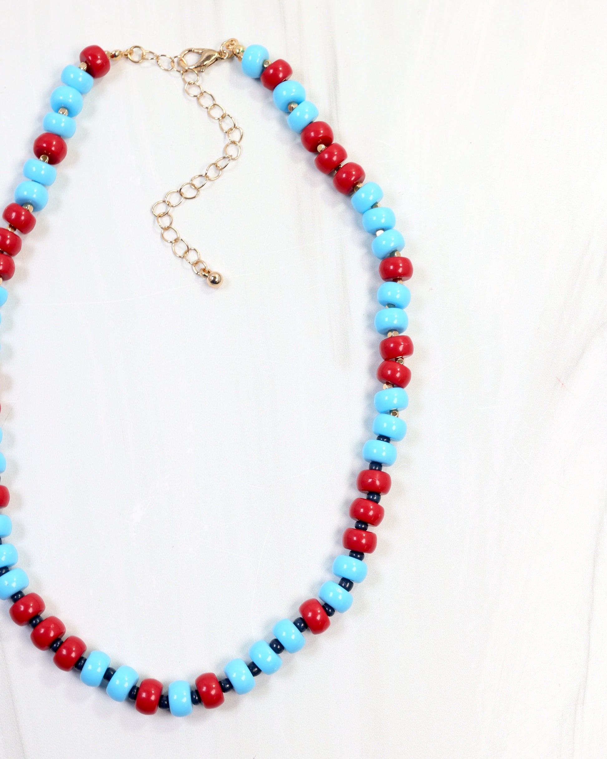 Elevate your game day look with the Ellison Stone Necklace in red and powder blue. This stylish piece shines on its own or layered with other necklaces, making it a versatile accessory to showcase your team spirit with flair. Perfect for adding a fashionable touch to any outfit while celebrating your favorite colors.