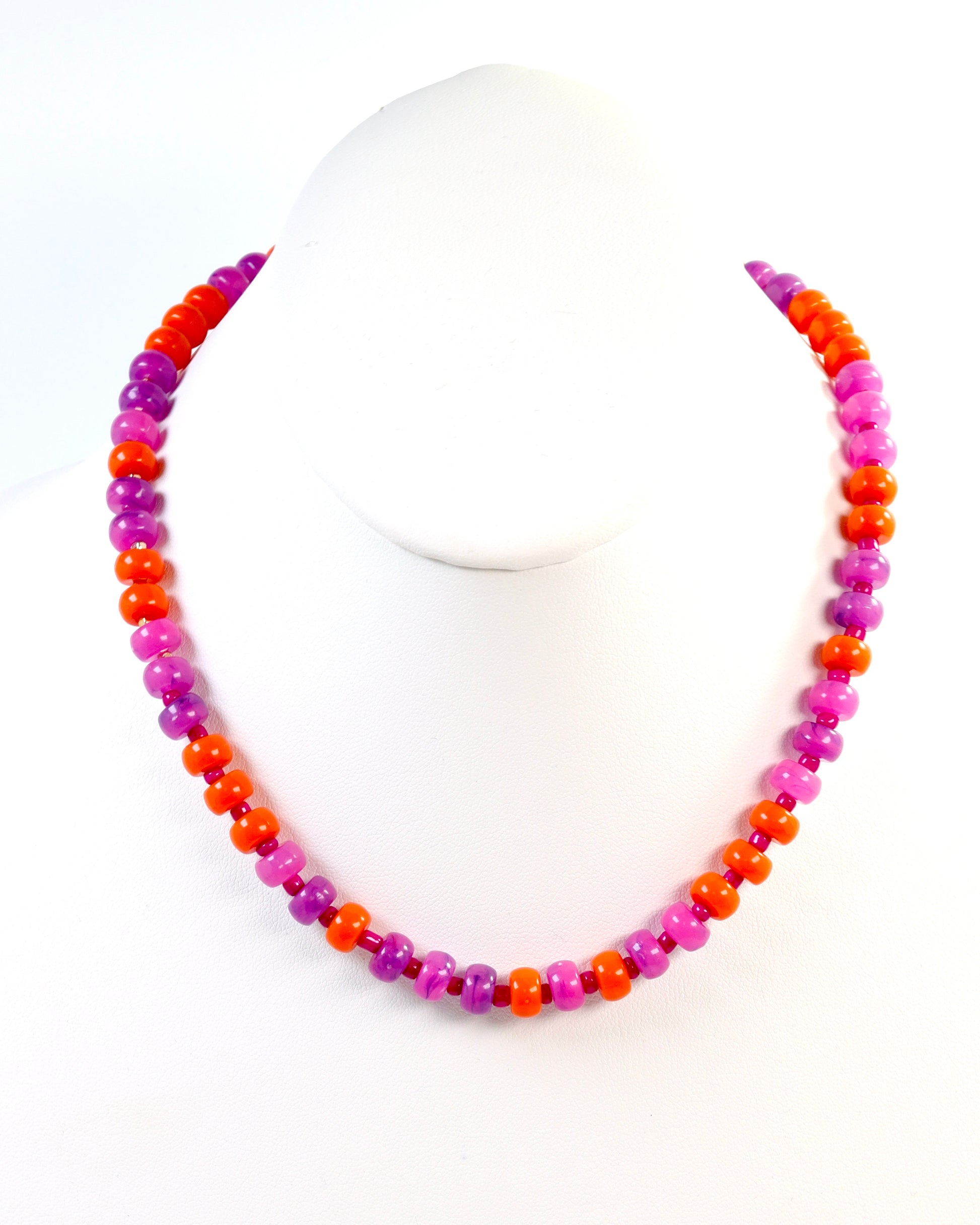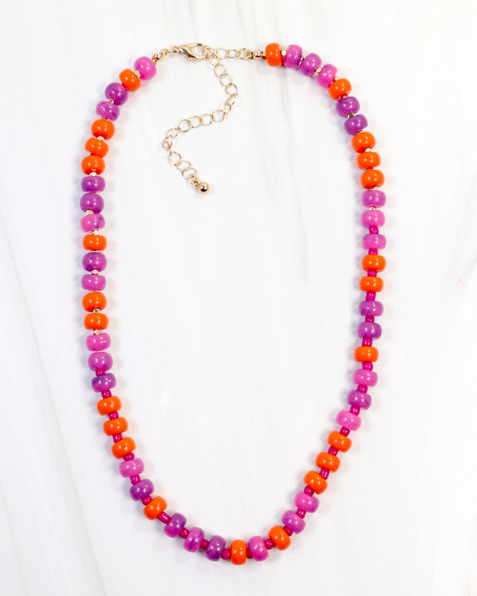 Elevate your game day look with the Ellison Stone Necklace in purple and orange. This stylish piece shines on its own or layered with other necklaces, making it a versatile accessory to showcase your team spirit with flair. Perfect for adding a fashionable touch to any outfit while celebrating your favorite colors.