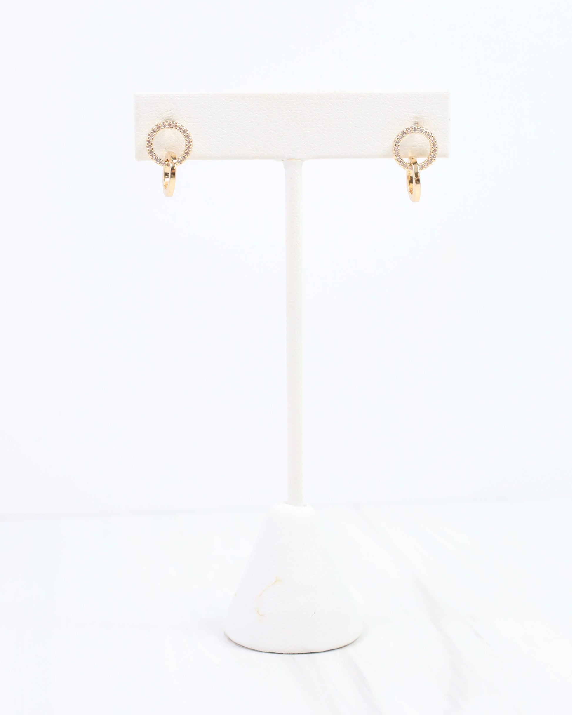Add a touch of sparkle and fun with the Emery Double Circle Stud Gold. Featuring gold-dipped brass, these playful earrings combine a pave CZ open circle stud with a shiny circle dangle that catches the light beautifully. Perfect for brightening up any outfit with a little extra shine and movement.