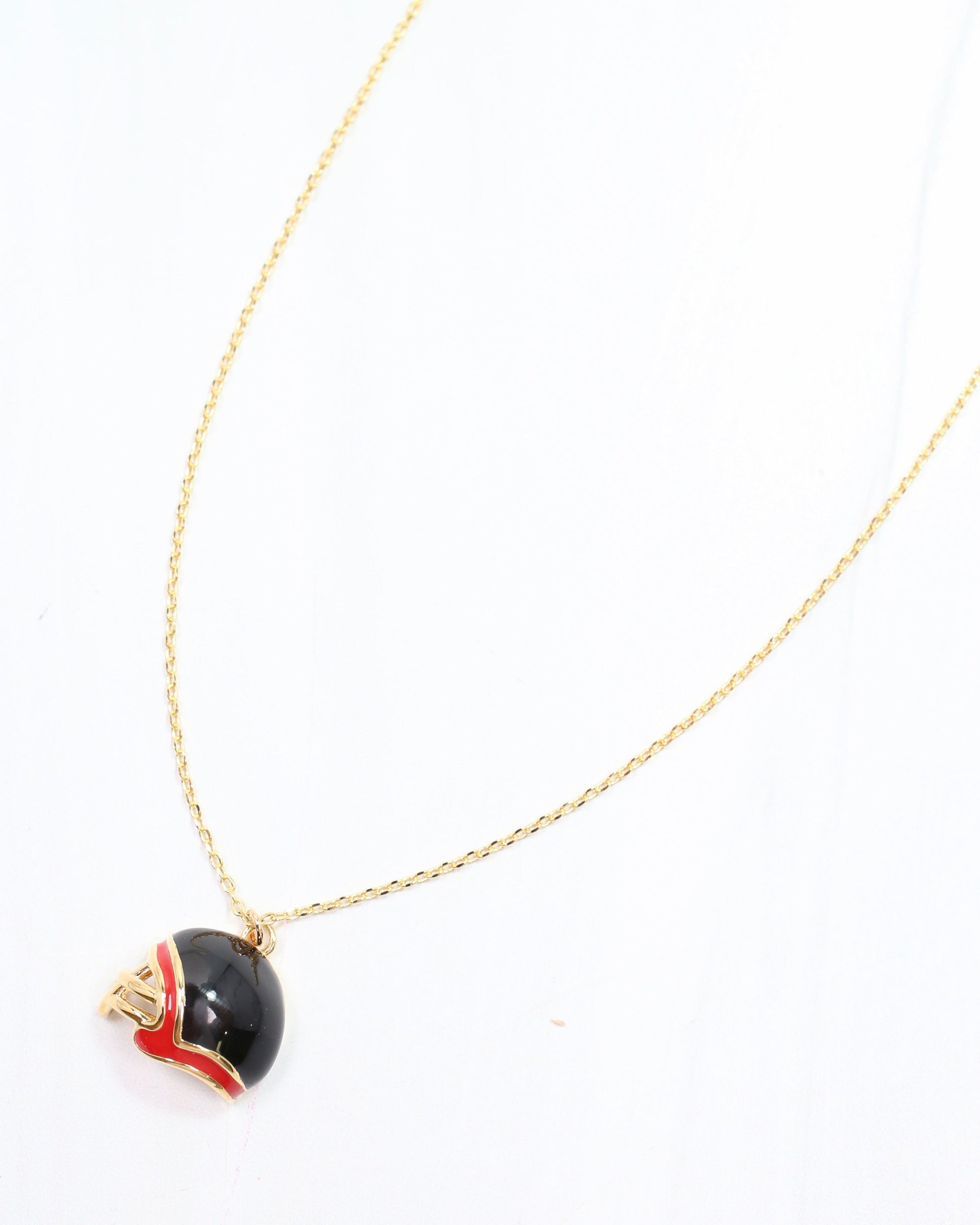 Show off your team pride with this playful Enamel Helmet Necklace in vibrant Red and Black. Featuring a colorful enamel helmet pendant with shiny gold trim, it hangs from a gold-dipped chain that adds a touch of sparkle. Perfect for game days or everyday fun, this charming necklace is a simple and stylish way to celebrate your favorite team.