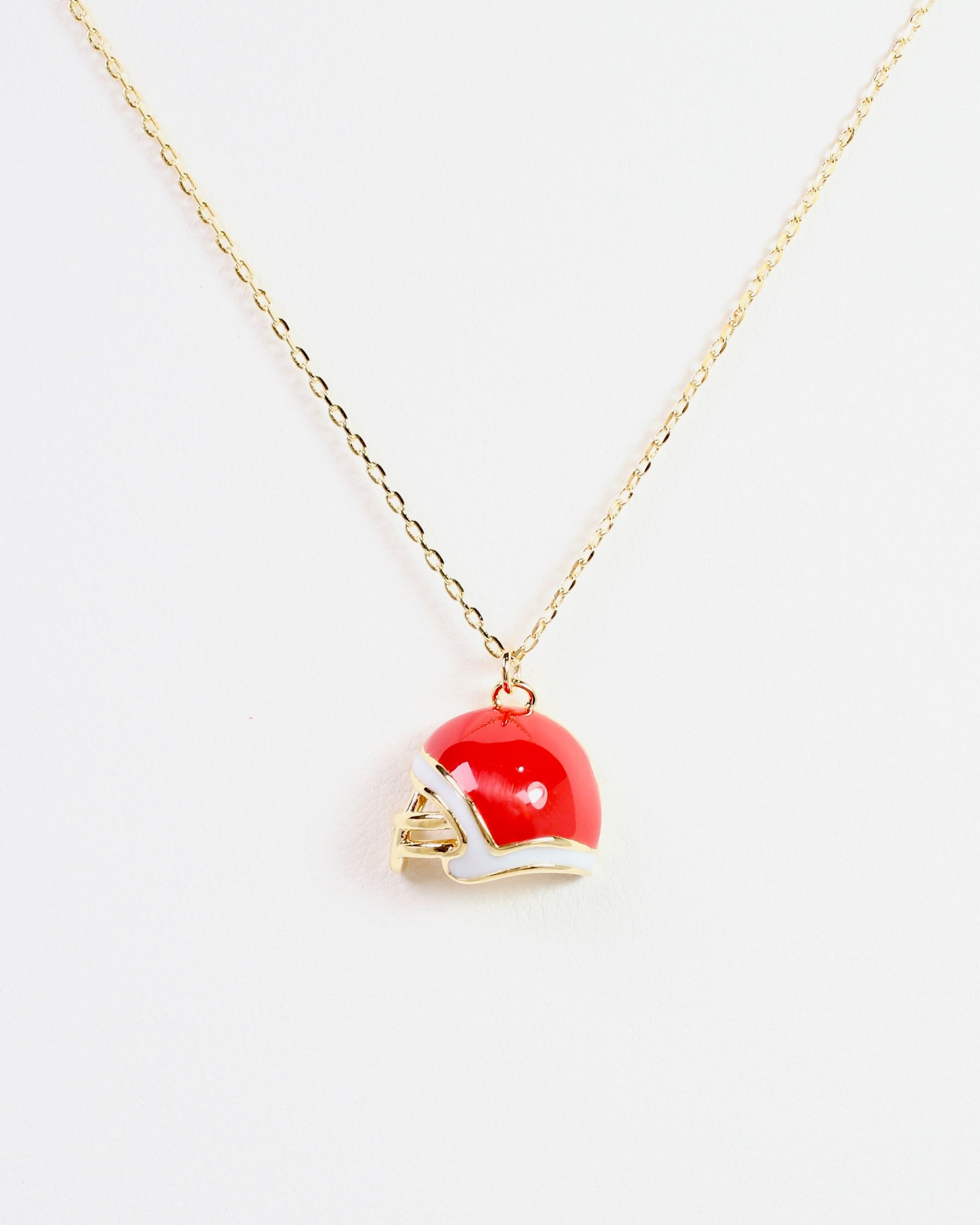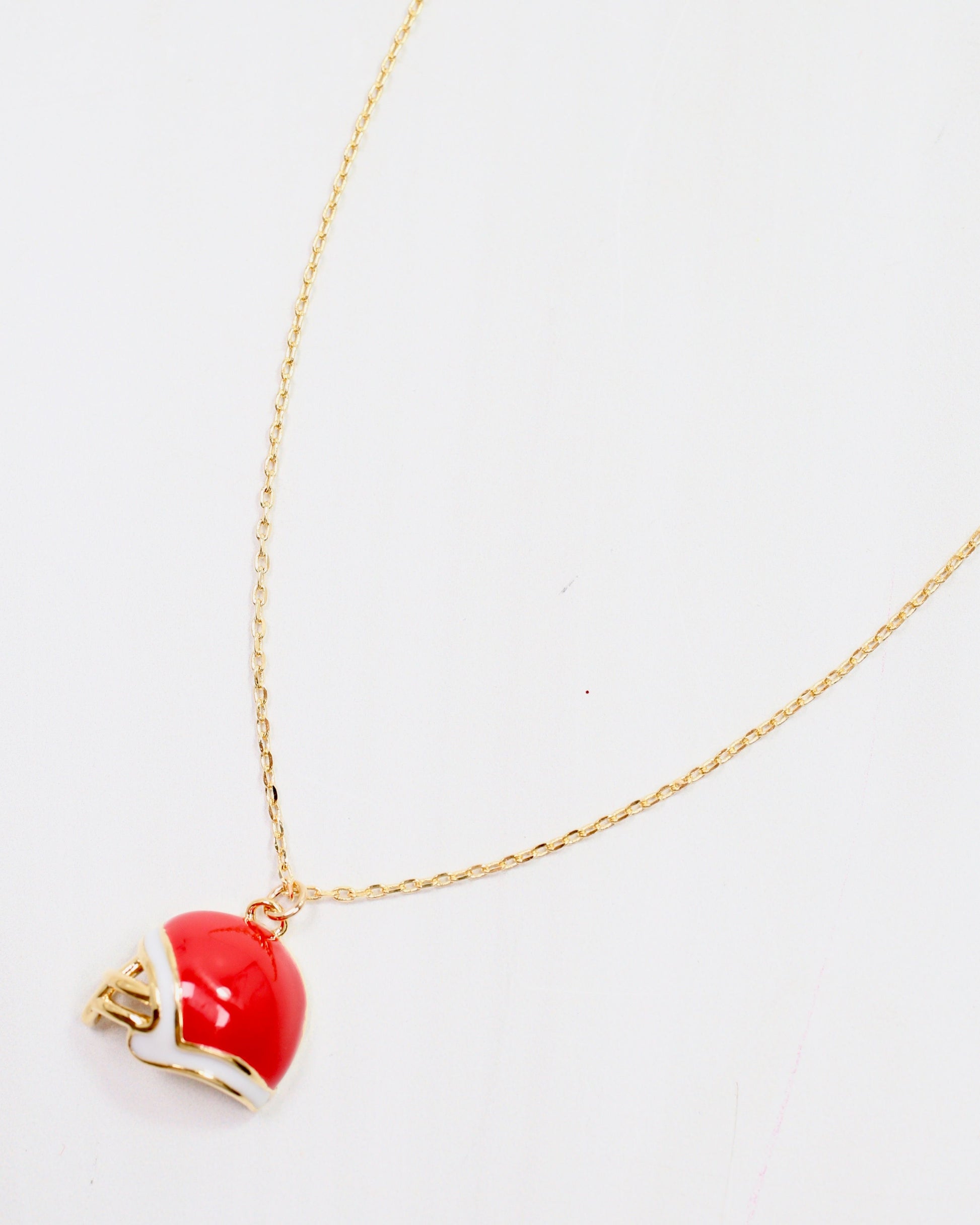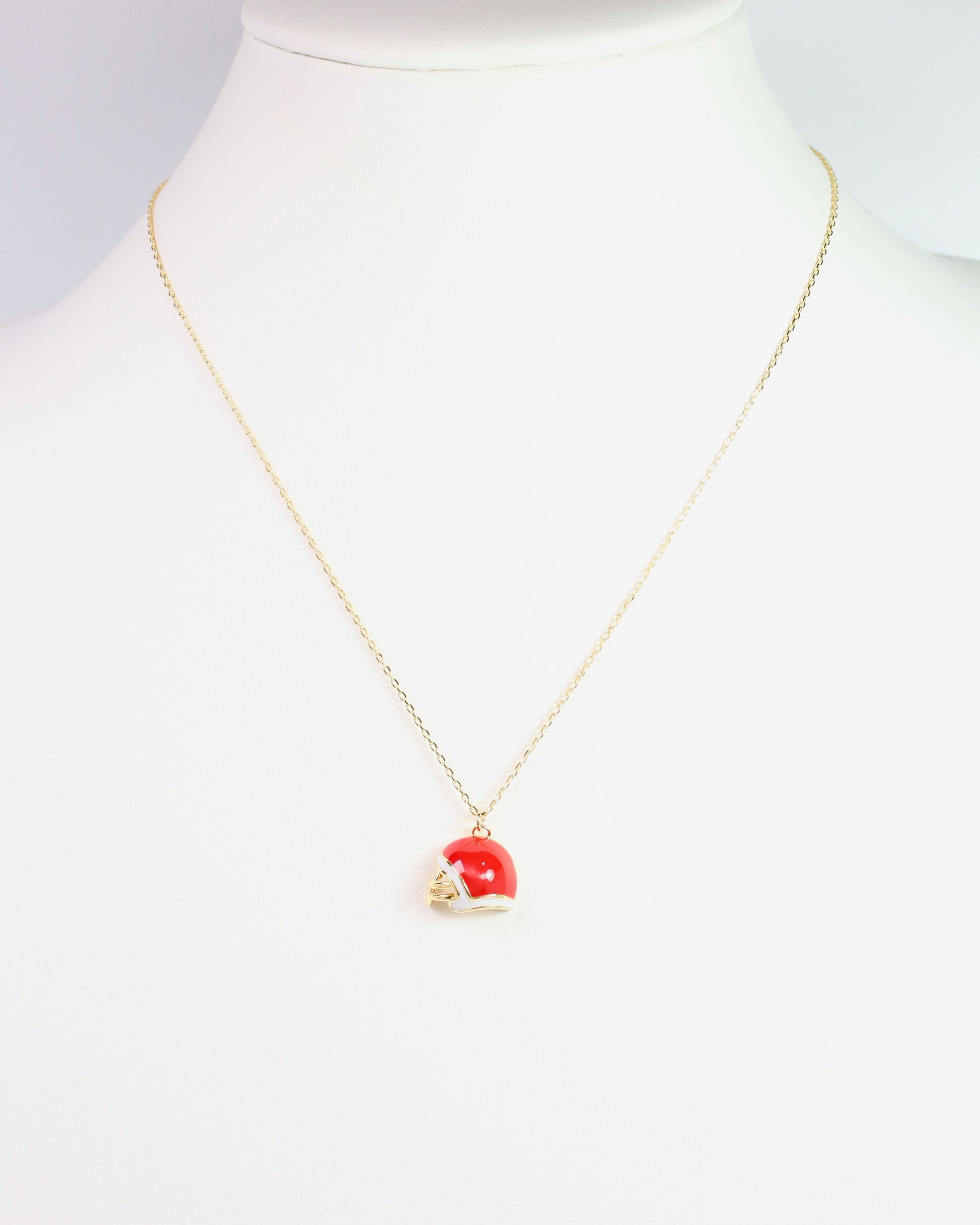 Show off your team pride with this playful Enamel Helmet Necklace in vibrant red and white. Featuring a colorful enamel helmet pendant with shiny gold trim, it hangs from a gold-dipped chain that adds a touch of sparkle. Perfect for game days or everyday fun, this charming necklace is a simple and stylish way to celebrate your favorite team.