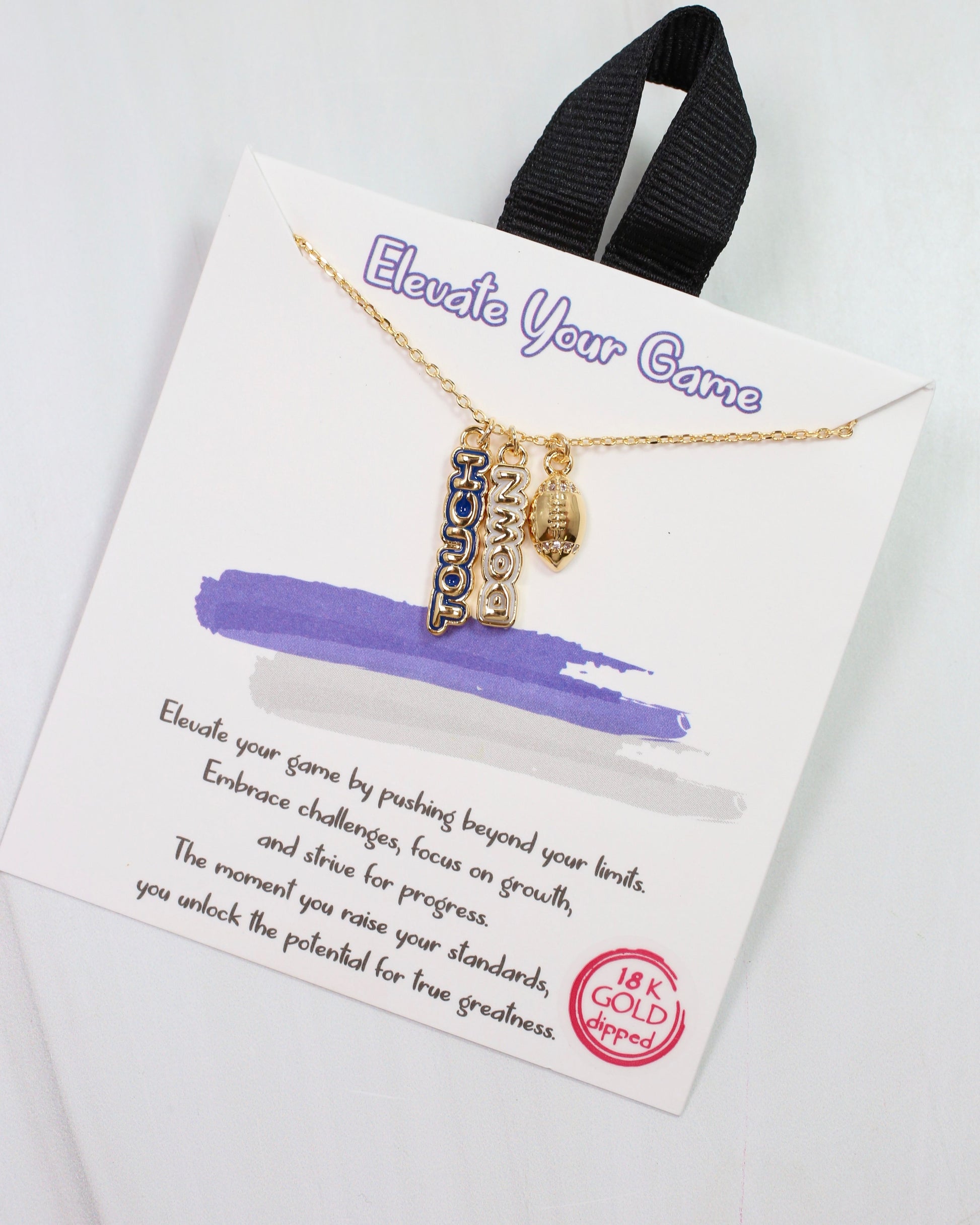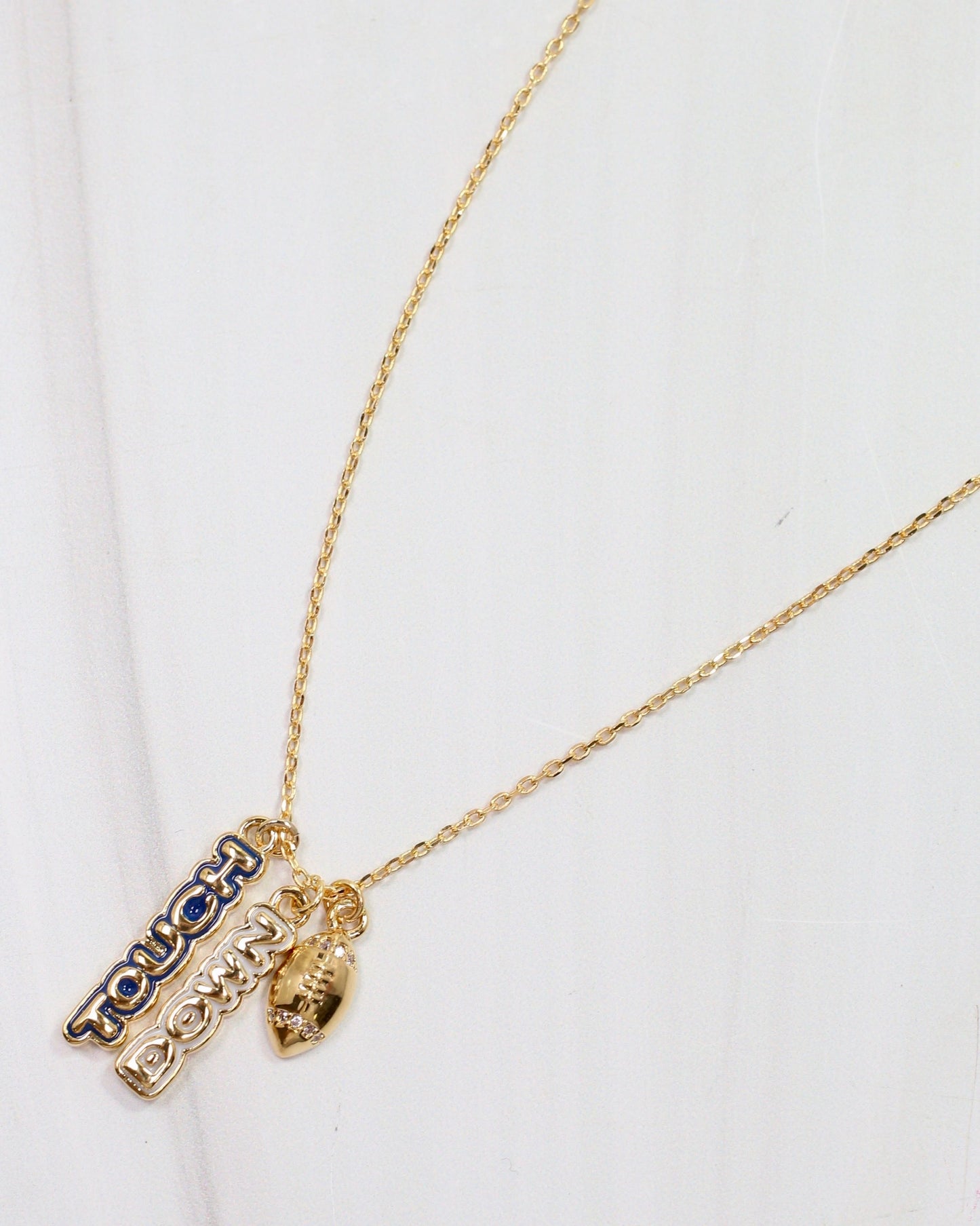 Celebrate your team spirit with this playful Enamel Touch Down Necklace! Featuring a vibrant Blue and white enamel charm alongside a sparkling gold football adorned with CZ stones, all hanging from an 18K gold-dipped chain. It's the perfect accessory to show off your love for the game with a fun, stylish twist.