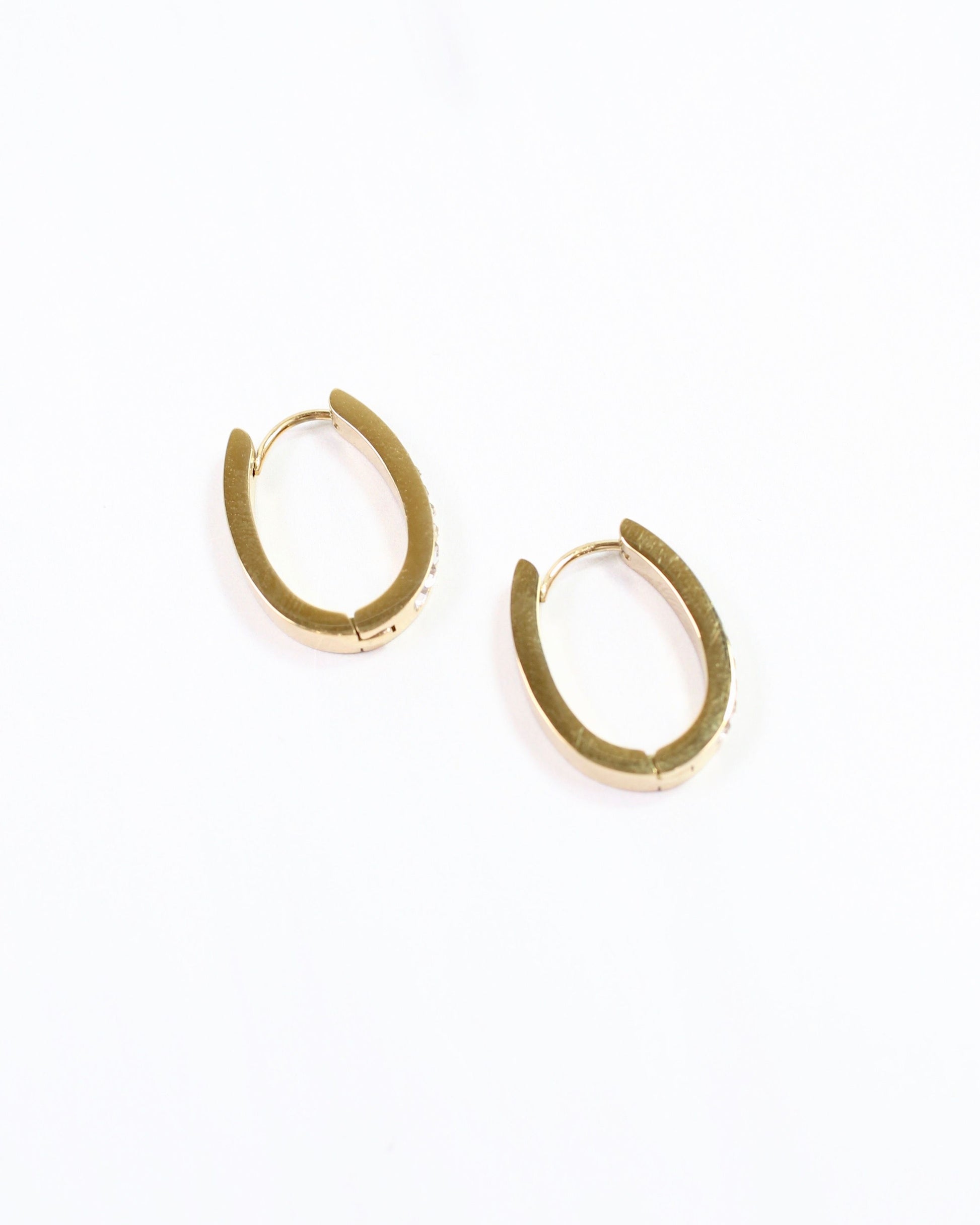 Elevate your everyday style with the Englewood CZ Hoop Earring in Gold. These elegant gold hinged oval hoops feature a sparkling line of cubic zirconia down the center, adding a refined shimmer to any outfit. Designed for comfort and versatility, they transition effortlessly from day to night, making them a chic staple for your accessory collection.