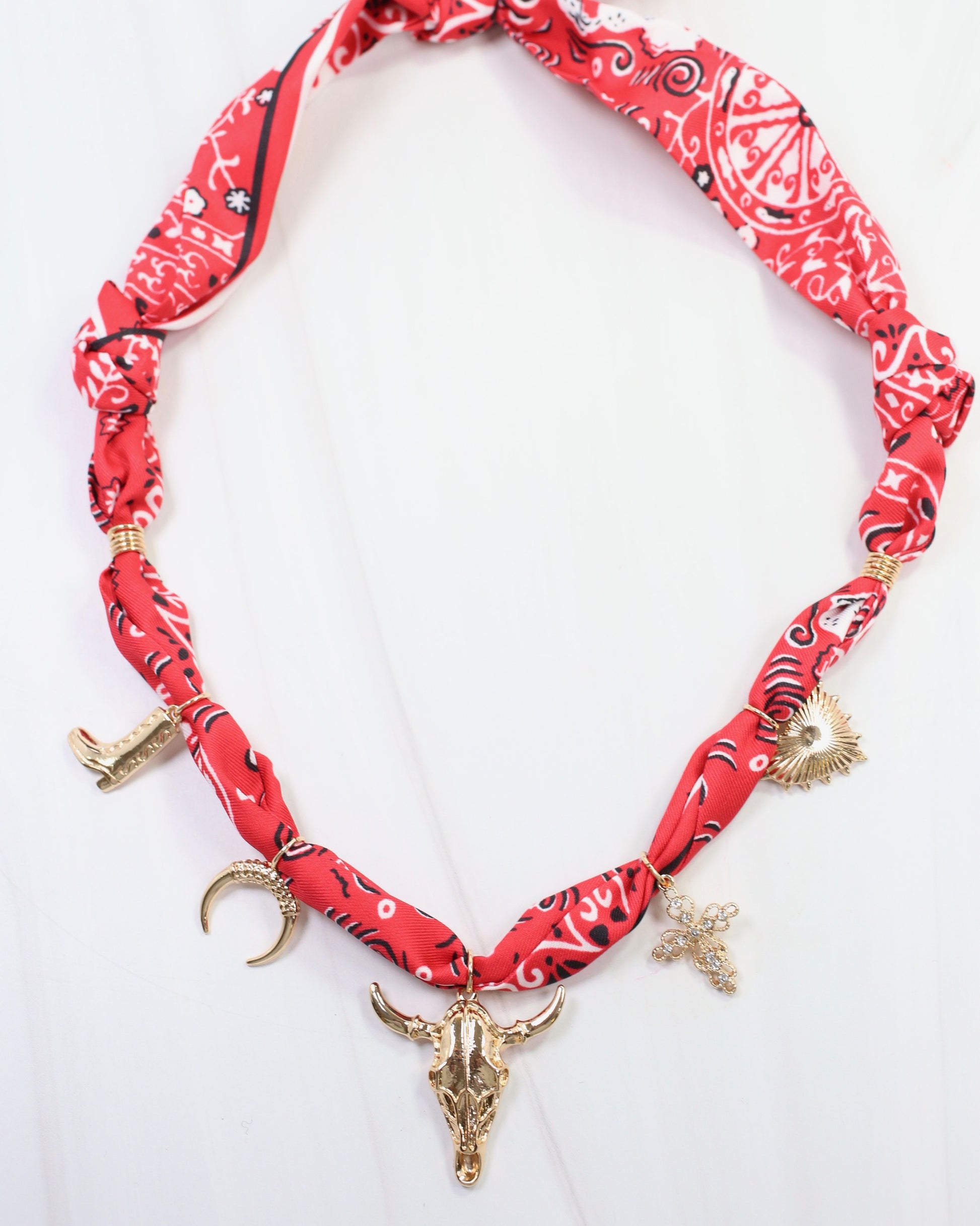 Make a striking statement with the Escondido Western Charm Scarf Necklace in Red. Featuring a vibrant red scarf paired with a charming western-inspired pendant, this necklace brings a playful and trendy flair to any outfit. Lightweight and versatile, it’s the perfect accessory to brighten up your style with a fun, fashionable edge.