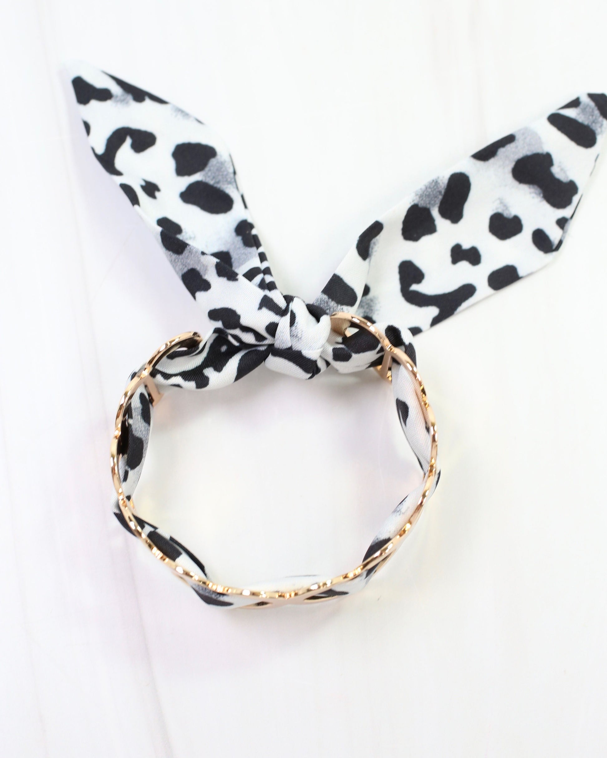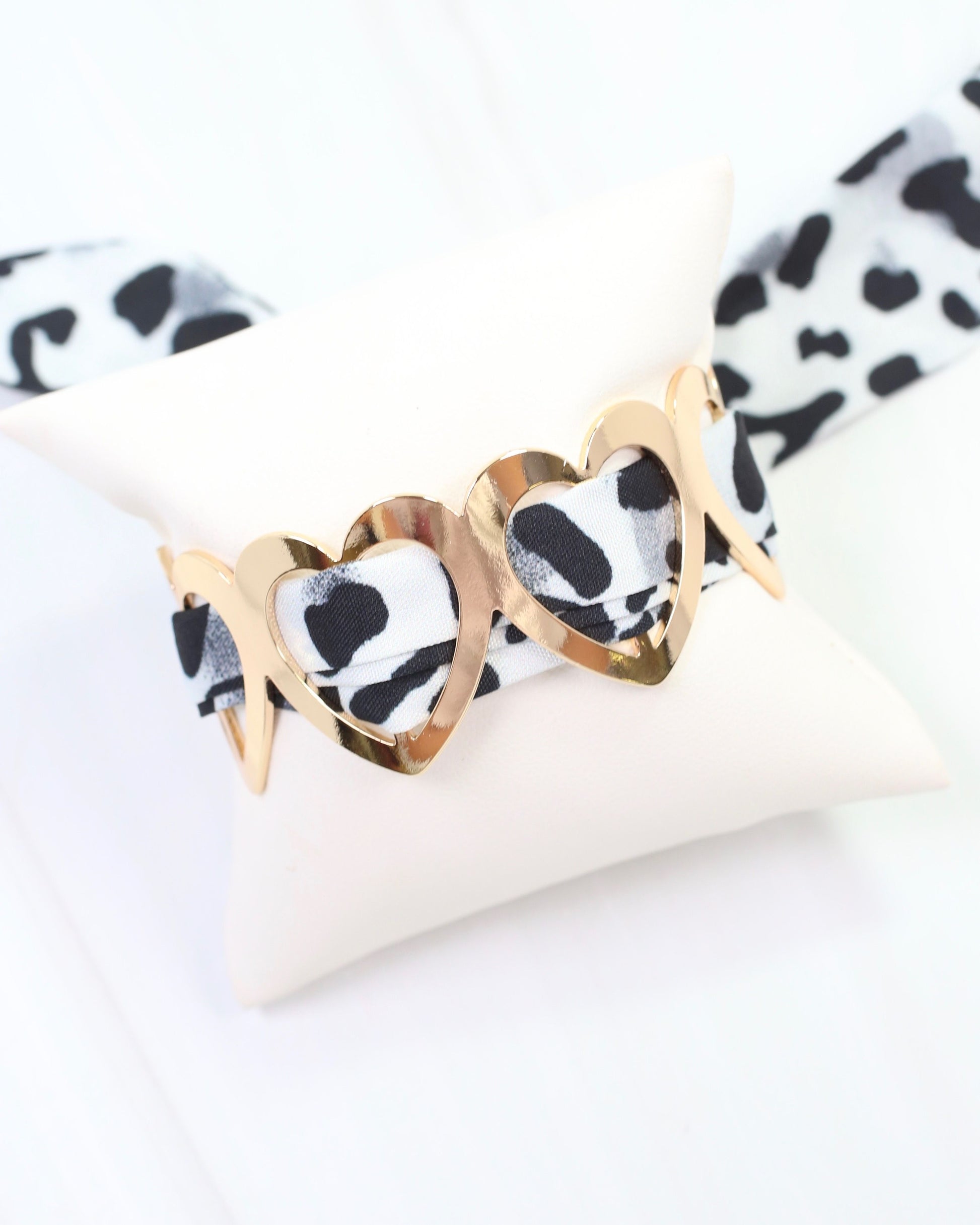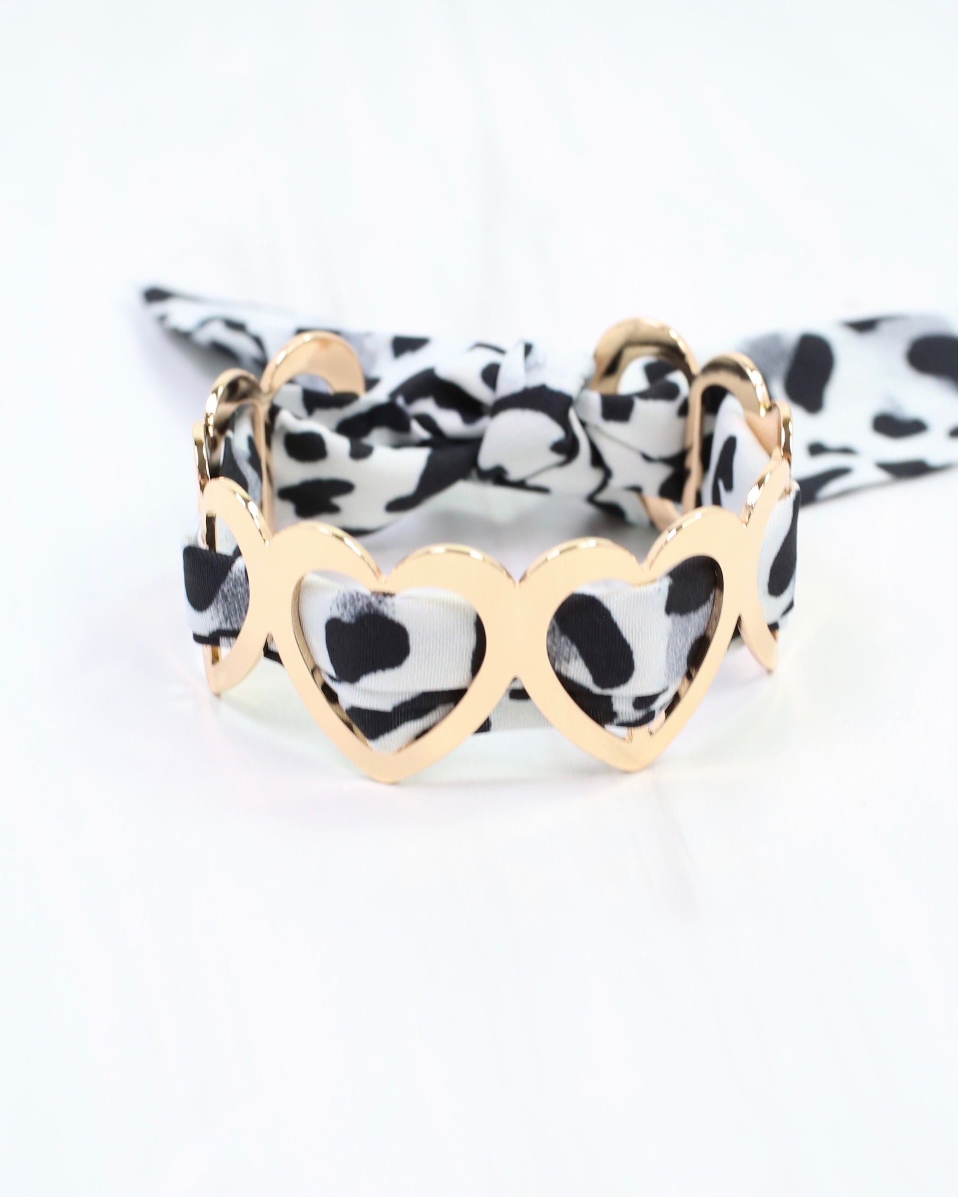 Add a playful yet chic touch to your outfit with the Evanston Heart Scarf Bracelet in Gray Leopard. This stylish accessory combines a soft scarf featuring a trendy gray leopard print with a delicate heart detail, perfect for elevating your look with effortless flair. Ideal for those who love to mix fashion and fun, it wraps comfortably around your wrist, making a bold statement wherever you go.