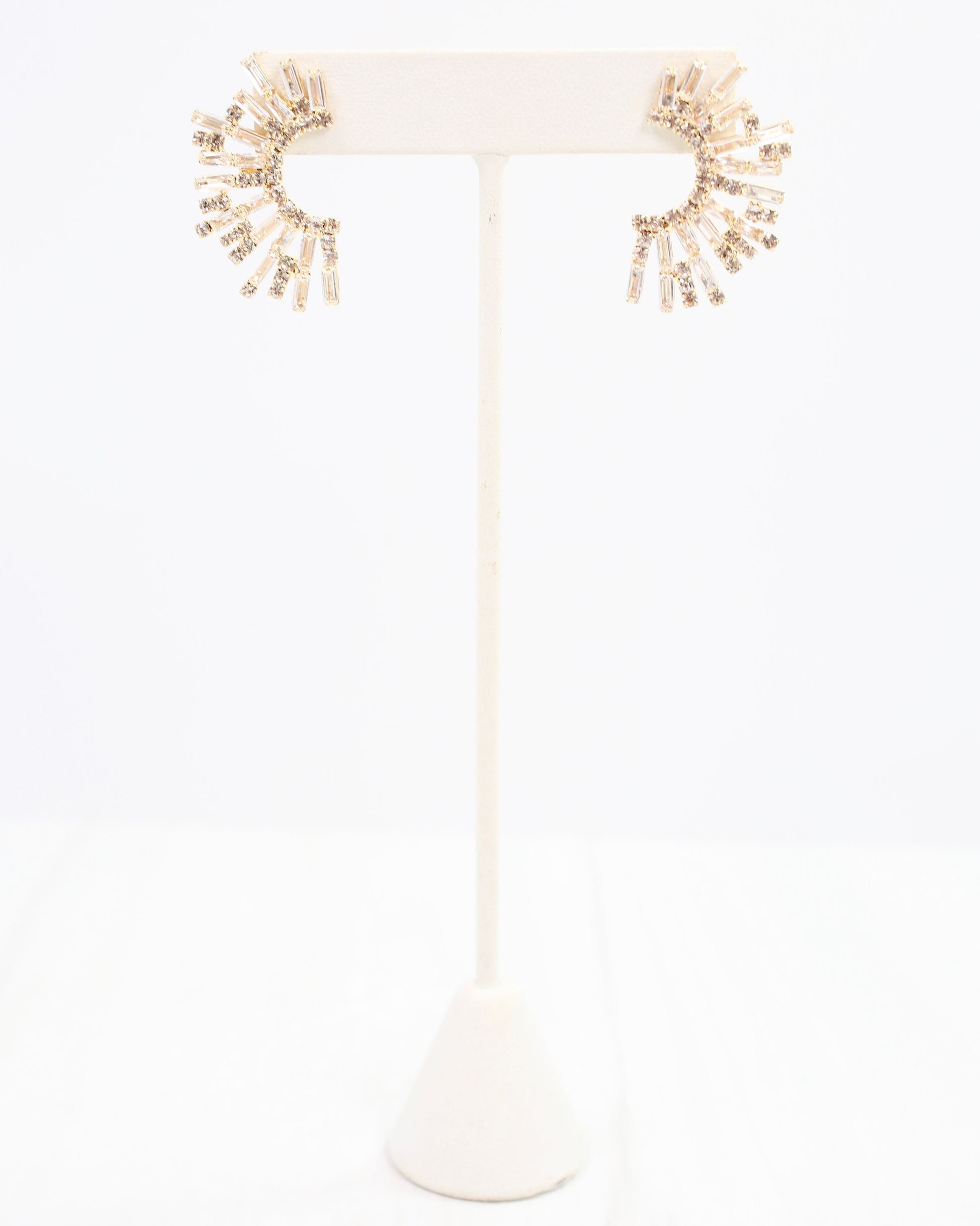 Shine bright like a diamond with our Fallon CZ Earring set in gold. The semi-circular shape with baguette and round cut crystals will bring a radiant sparkle to any outfit. Get ready to turn heads and be the center of attention with these statement earrings!