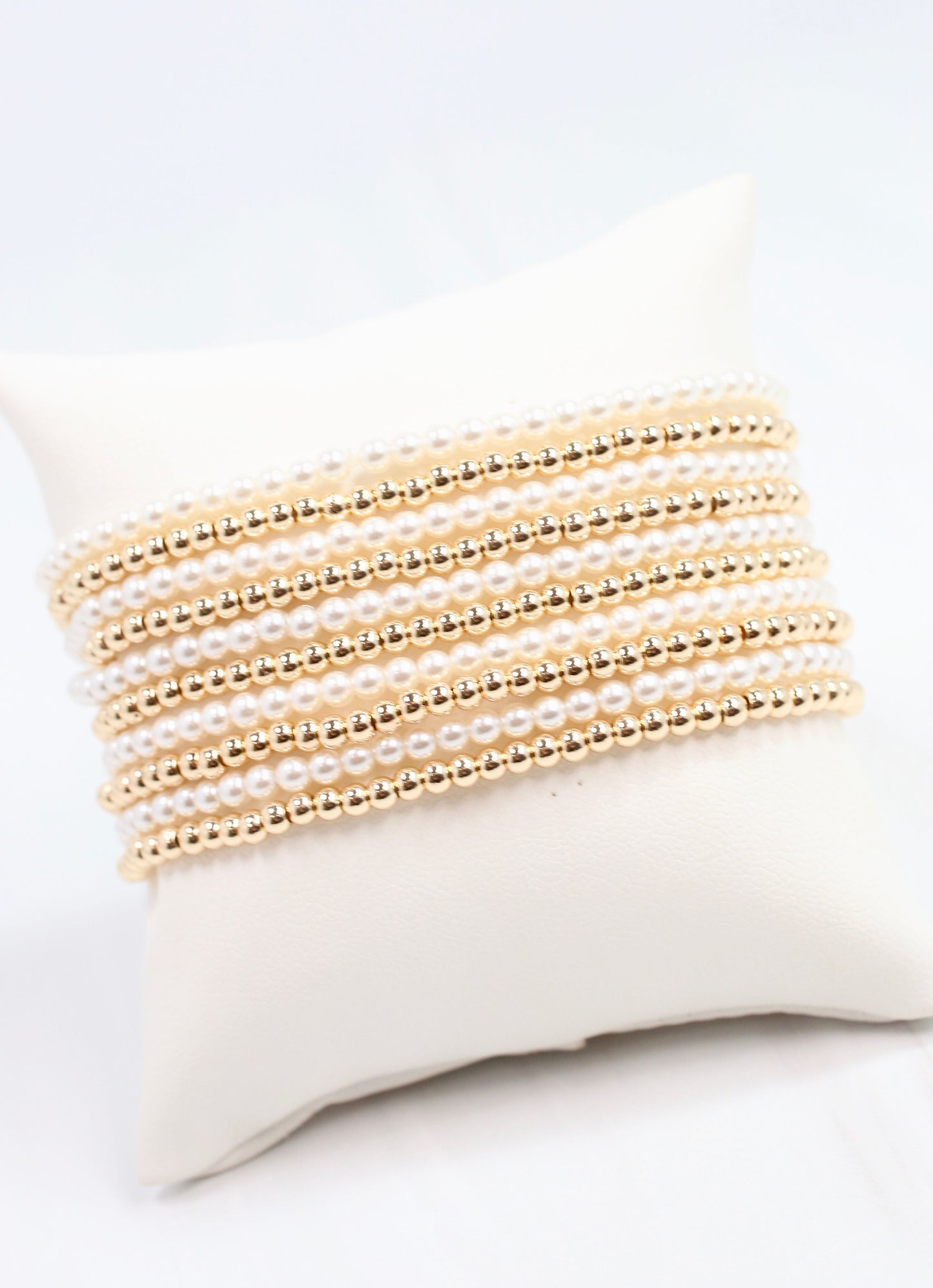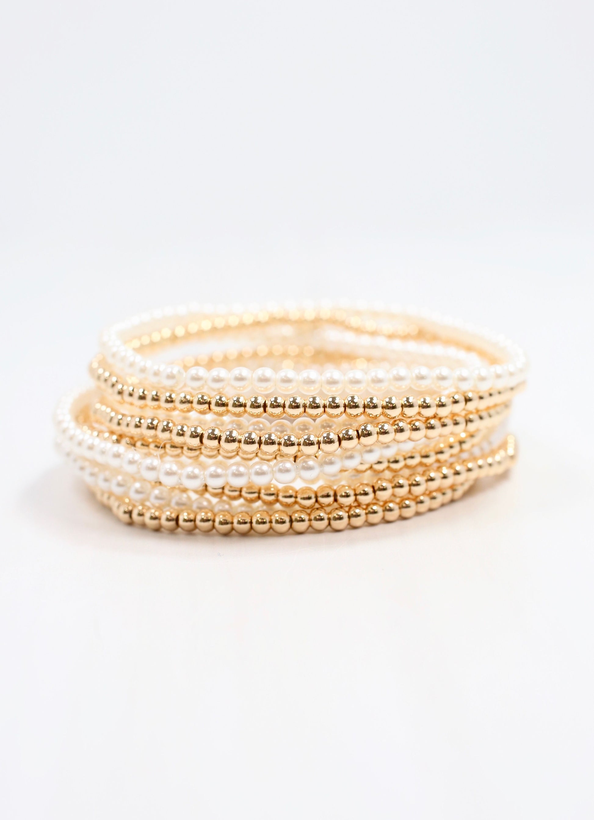 This bracelet set includes ten strands that make a fabulous stacked look. There are five gold beaded strands and five pearl strands. Stretches to fit most wrists.