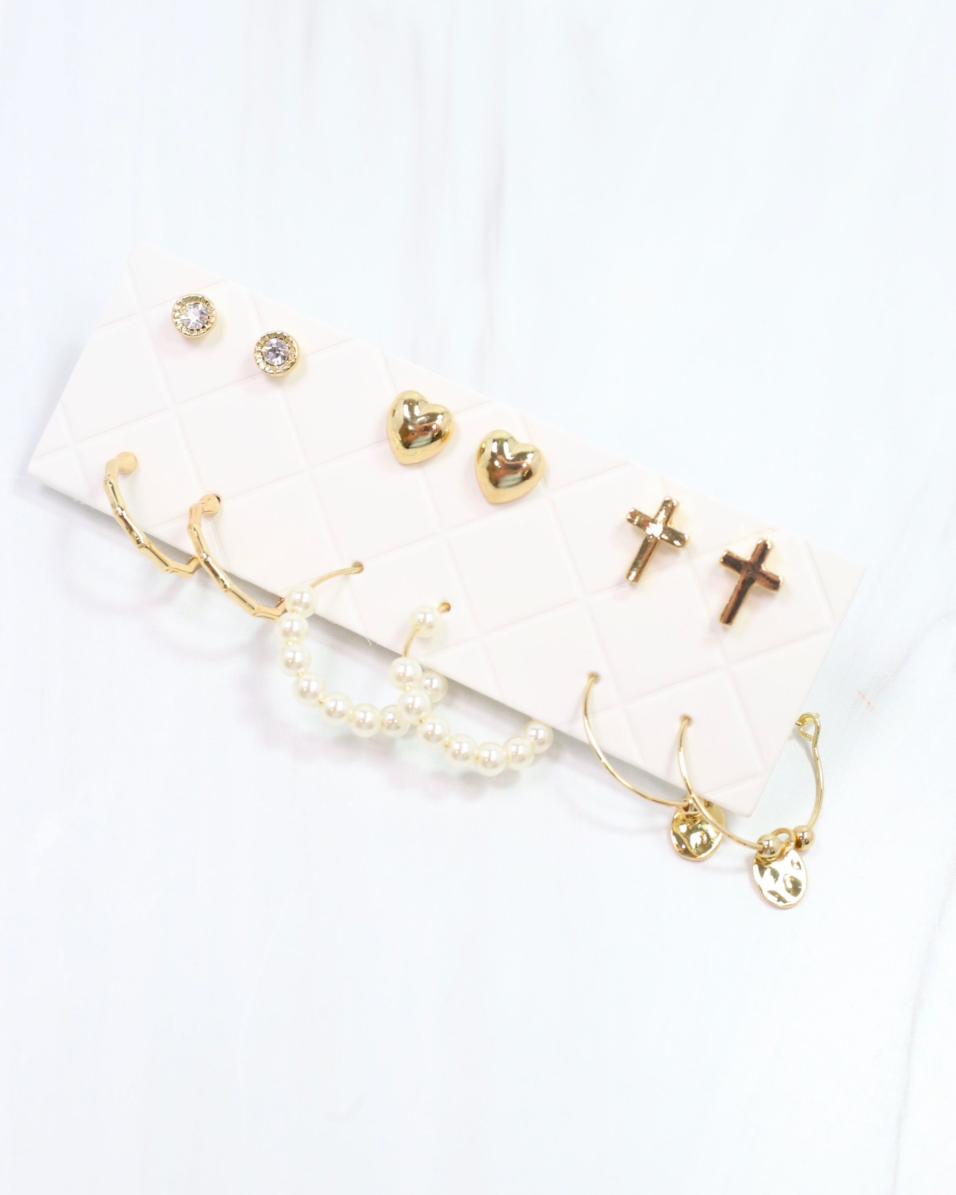 Add a touch of sparkle and charm with the Finley Earring Set in Gold! This playful collection includes six earrings: three studs—a dazzling cz, a cute heart, and a stylish cross—and three hoops featuring gold bamboo, classic pearl, and a gold hoop with a fun disc detail. Mix and match to create endless looks that brighten your day with effortless style.