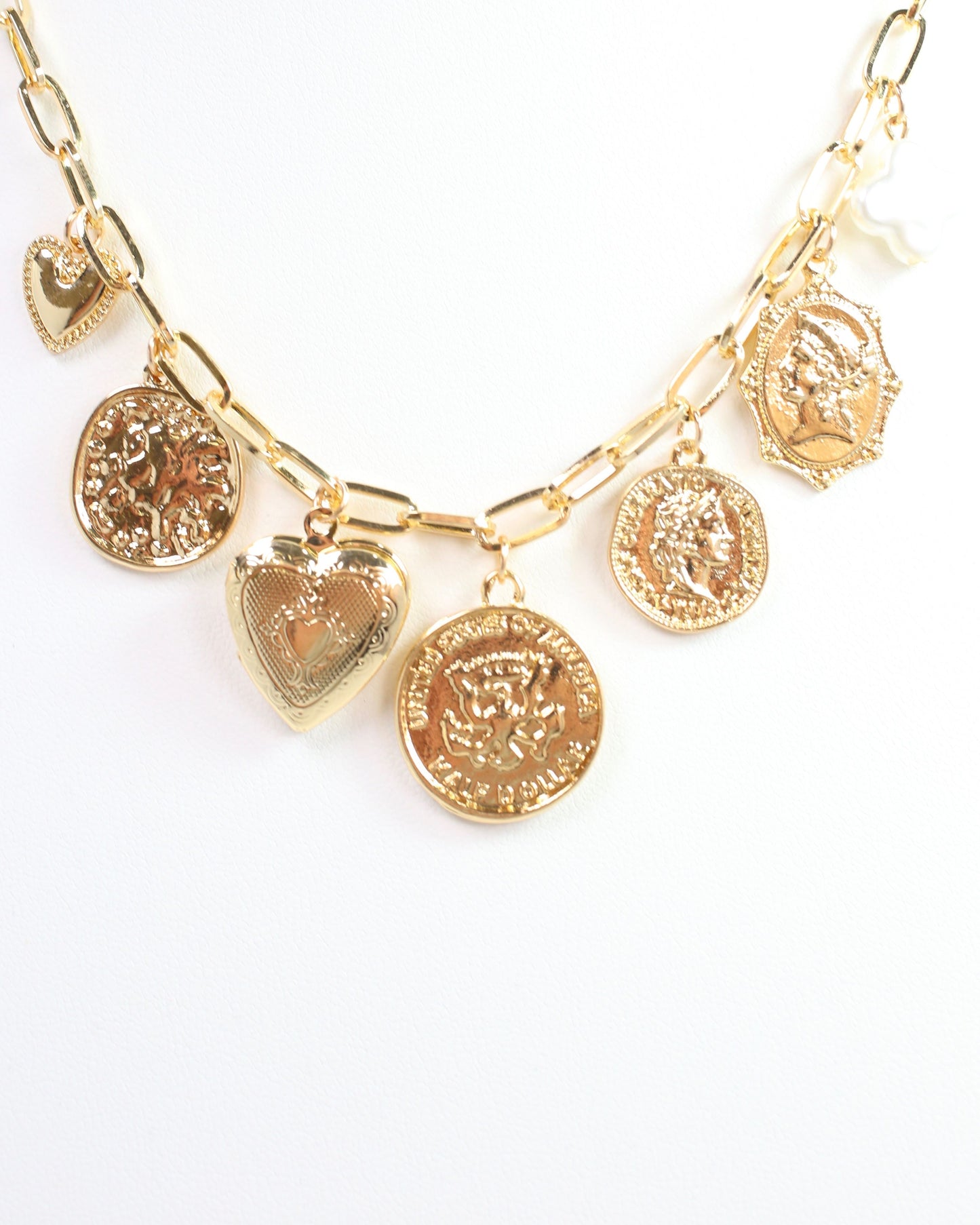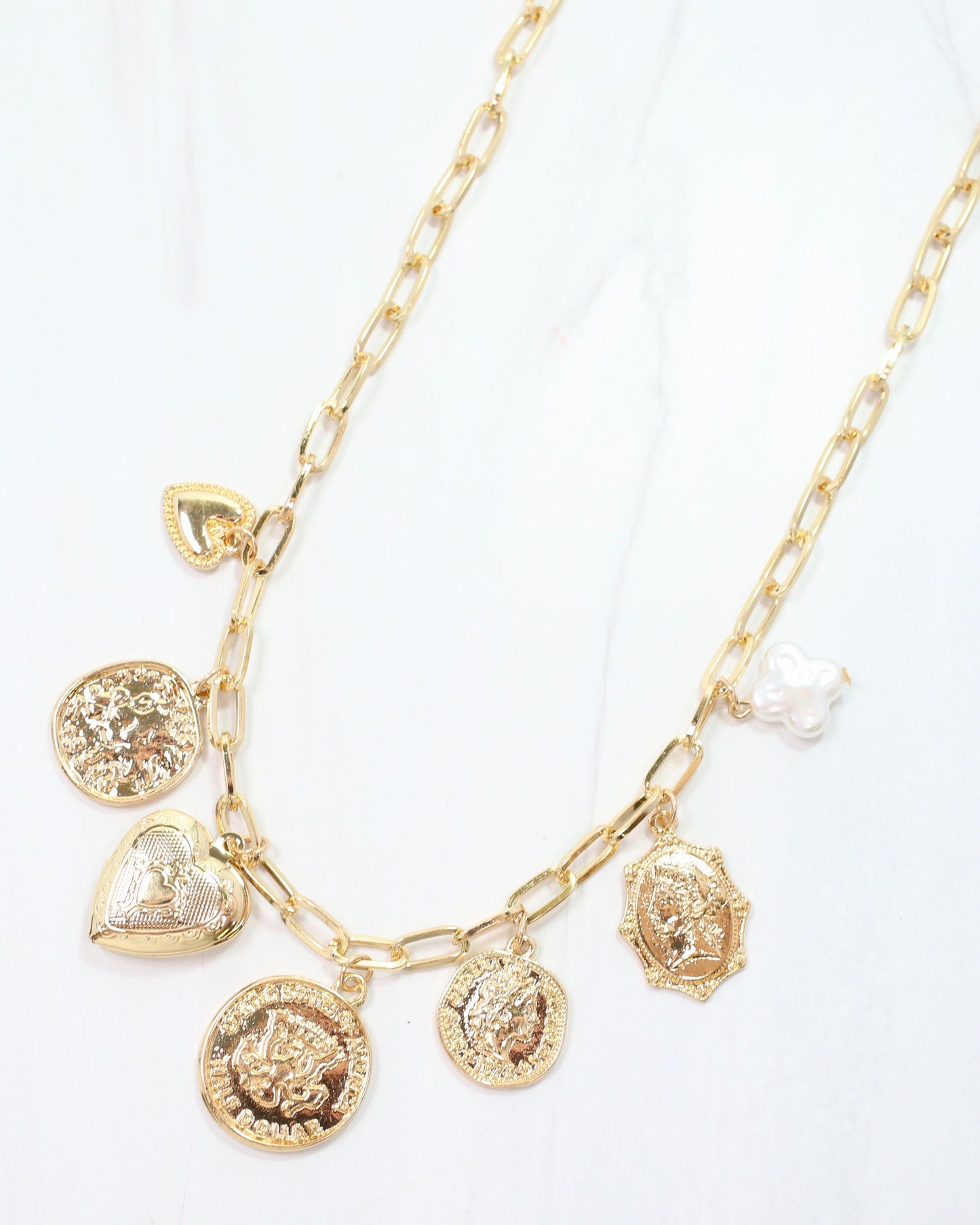 Add a touch of charm to your look with our Four Seasons Coin Charm Necklace in shiny gold finish. Featuring a working locket and vintage-looking coins paired with locket, heart, and pearl clover charms, it's the perfect accessory for all seasons. Embrace the trend with this awesome piece!