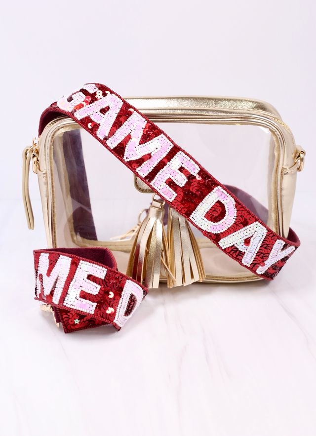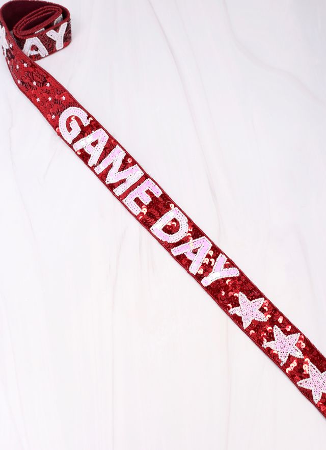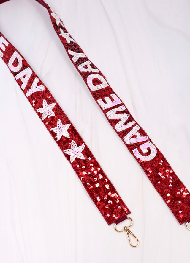 This stunning purse strap is covered in sequins with a beaded trim. "GAME DAY" is repeated on the strap with sequin filled stars. It is definitely an eye-catching accessory for the big game! This strap easily clips onto any purse or clear bag that has removable strap compatibility.