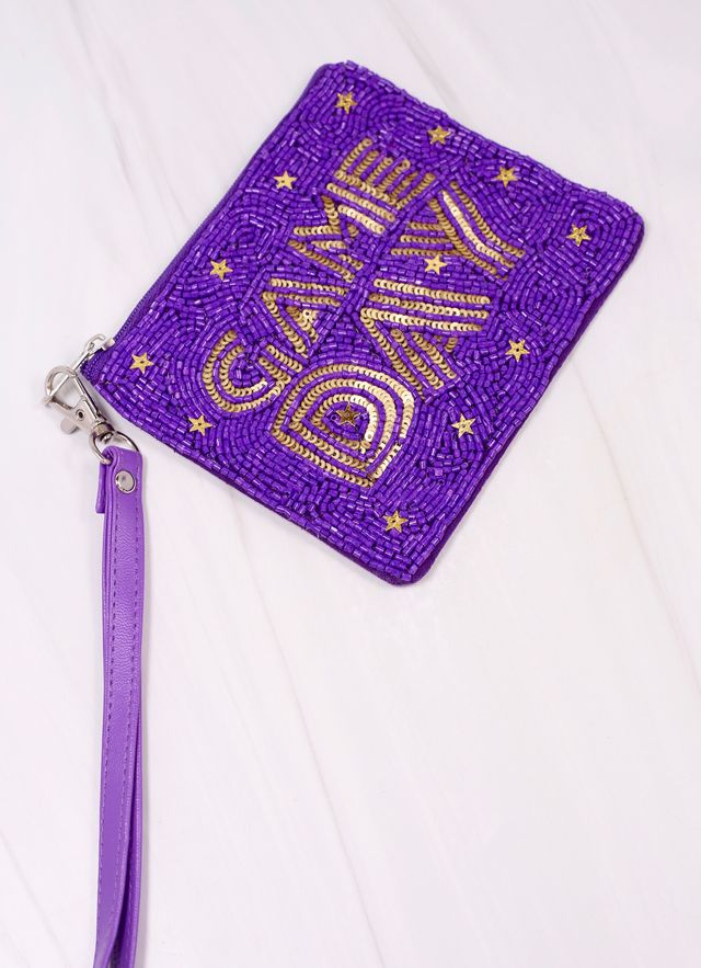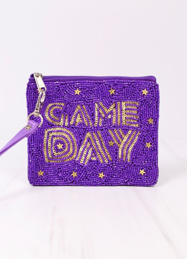 Shine bright with this beaded pouch! It has "Game Day" outlined in sequins and has sequin star accents as well. It also comes with a removable wristlet strap that can easily attach to keys. This pouch would be so cute thrown in a clear bag for an eye-catching look!