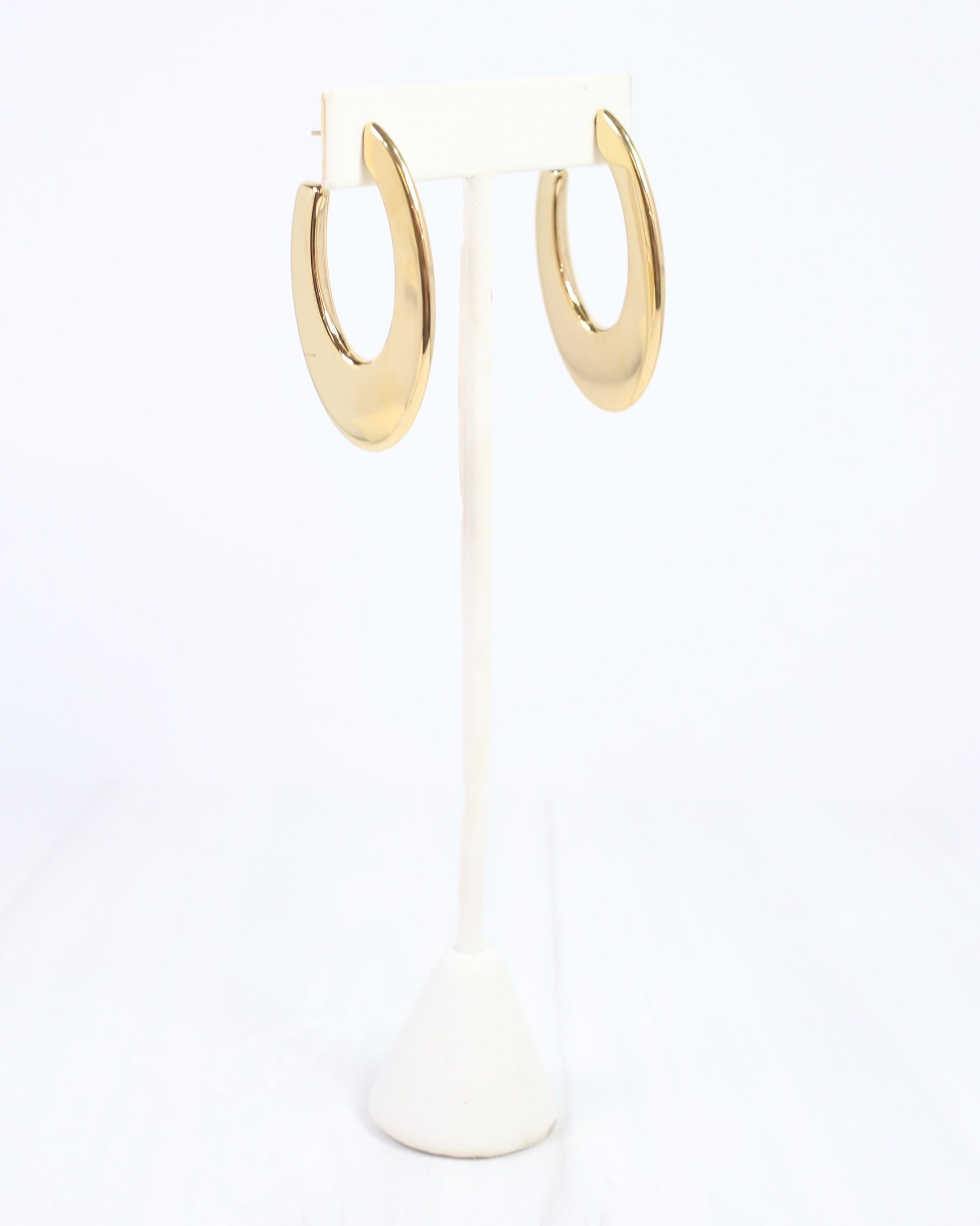The Georgetown Hoop Earring Gold features a wide, flat oval design in shiny brass, combining a posh and stylish look with modern simplicity.