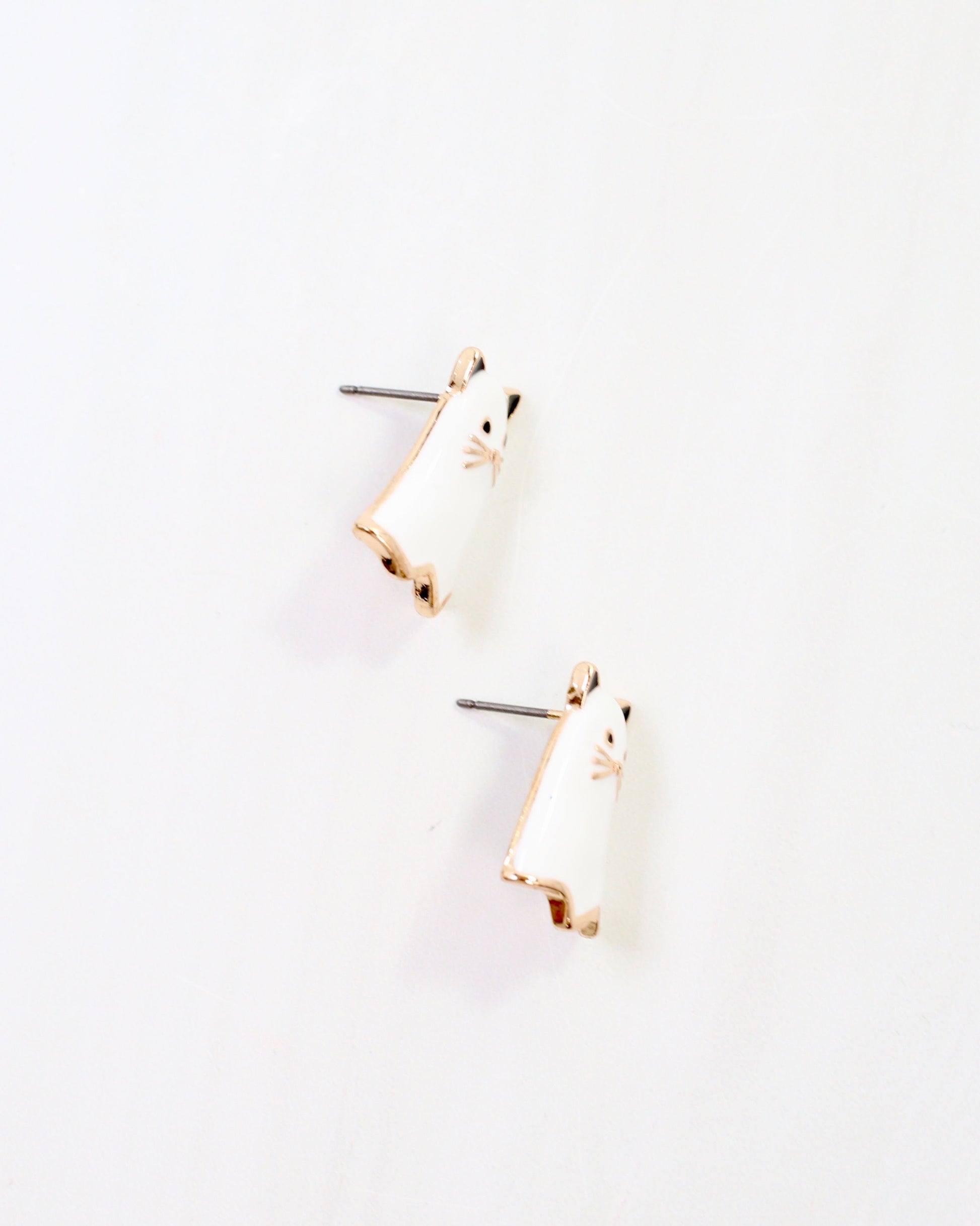 Add a playful, stylish touch to your Halloween look with these Ghouly Ghost Cat Studs in white enamel. Featuring delicate ears, whiskers, and a charming kitty nose, these earrings blend spooky fun with fashionable flair. Perfect for those who love subtle seasonal accessories that stand out.