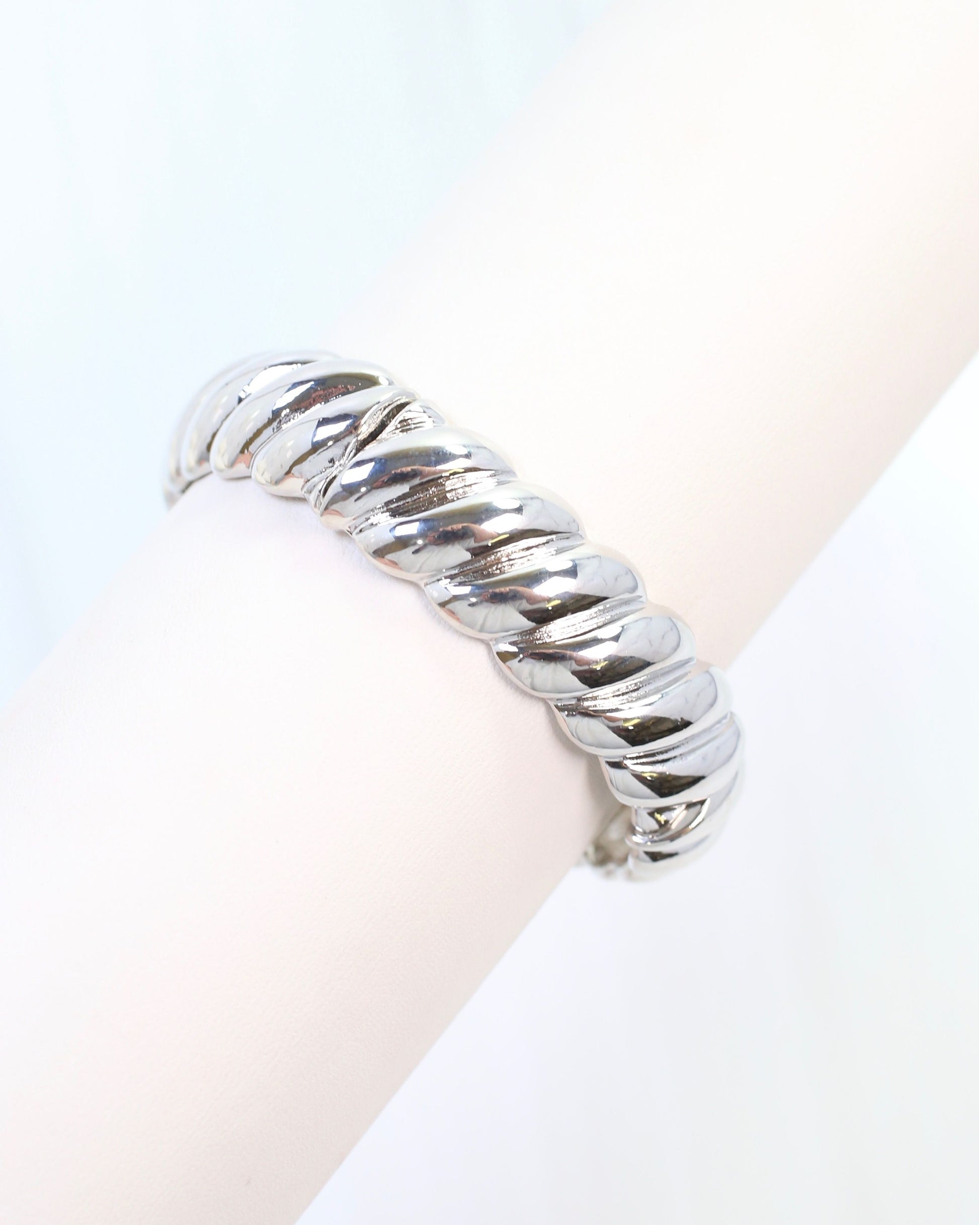 Elevate you next outfit with this classic, metal bracelet with a twisted design. It wears like a bangle and stretches to fit most wrists. It is a great simple statement on it's own but can also be worn in a fuller stack as well.