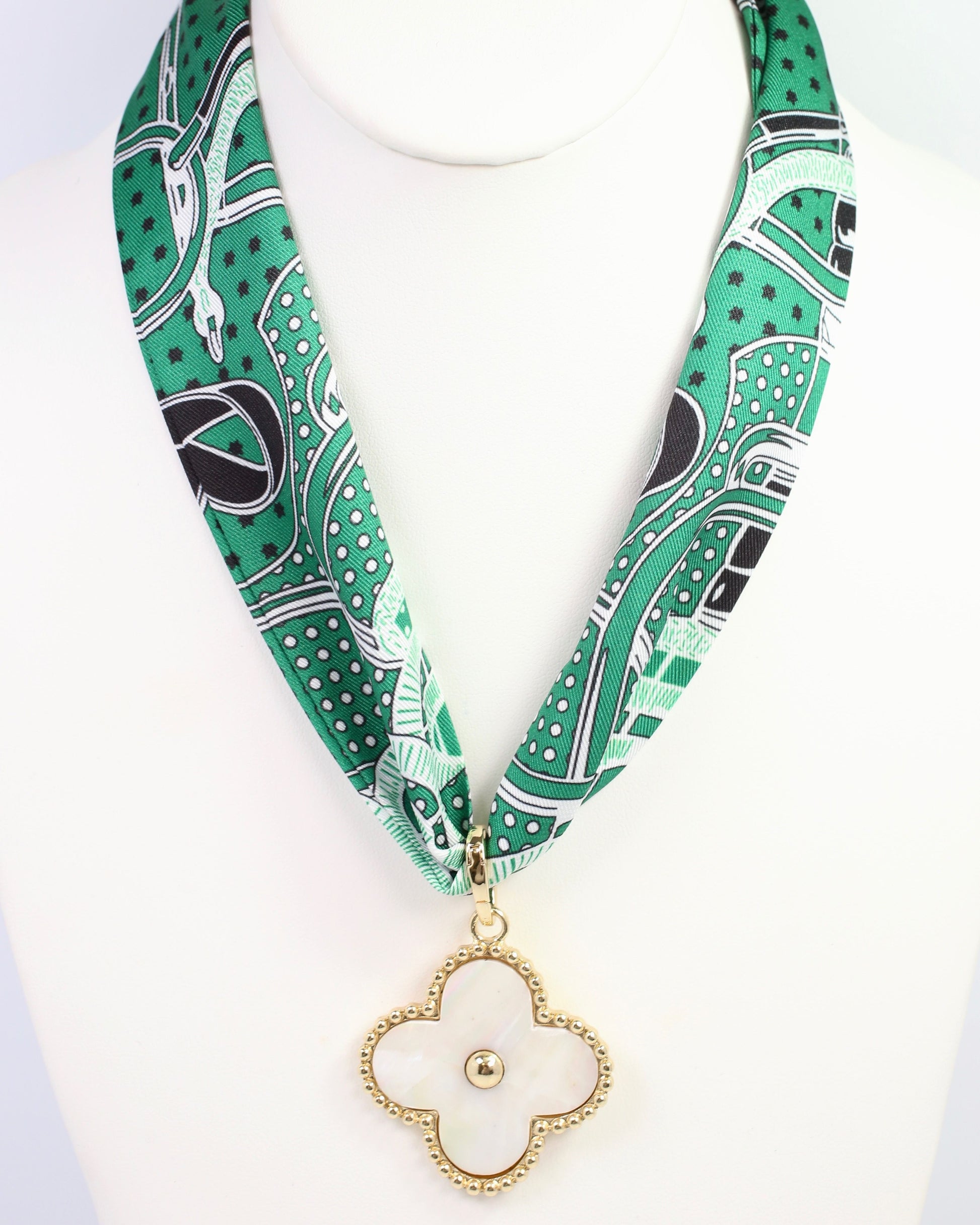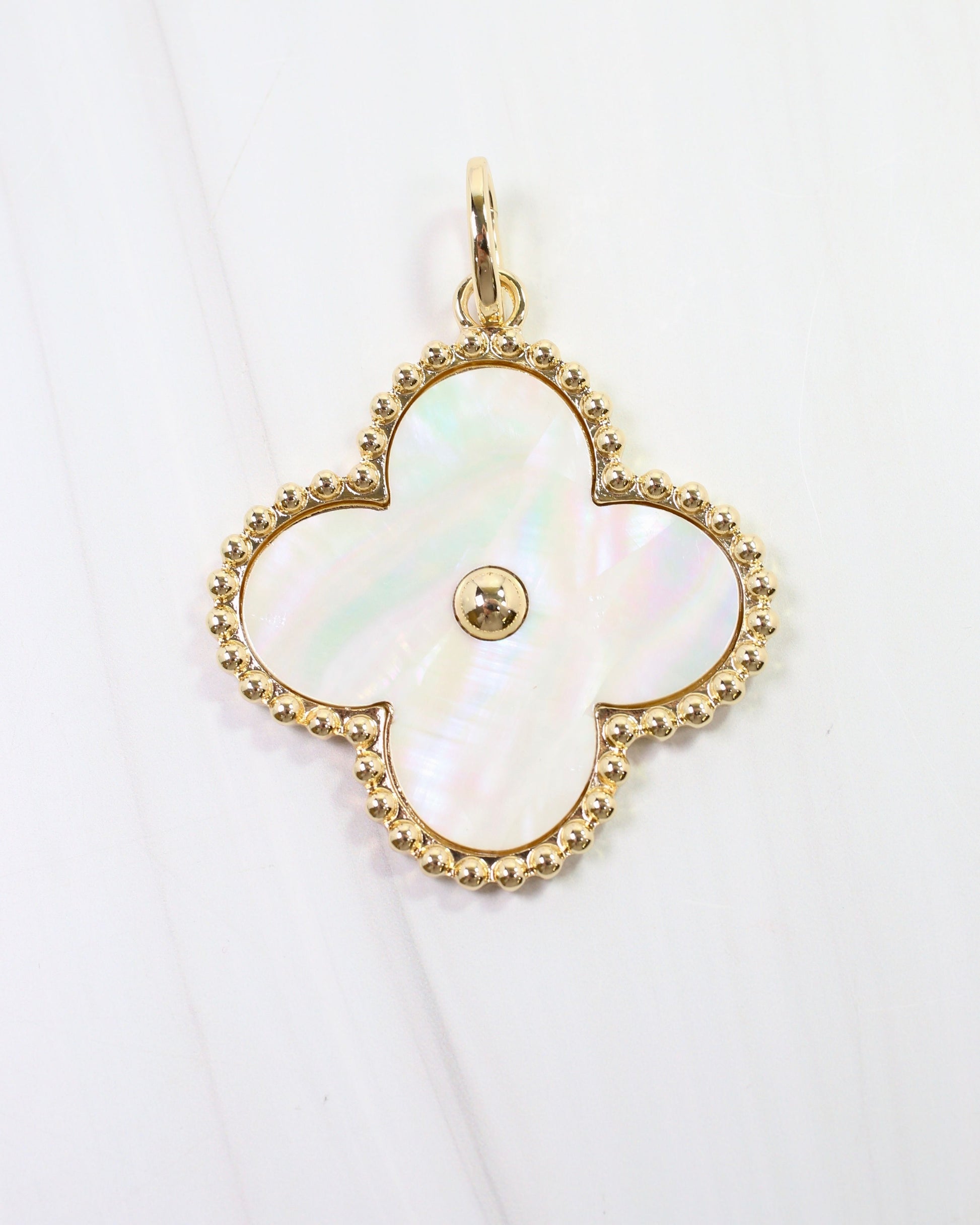 The Gina Clover Charm Mother Of Pearl features a radiant clover shape with a gleaming mother of pearl finish, accented by a gold ball trim and a charming gold ball at its center. This fashionable and fun charm adds a playful yet elegant touch to any accessory collection.
