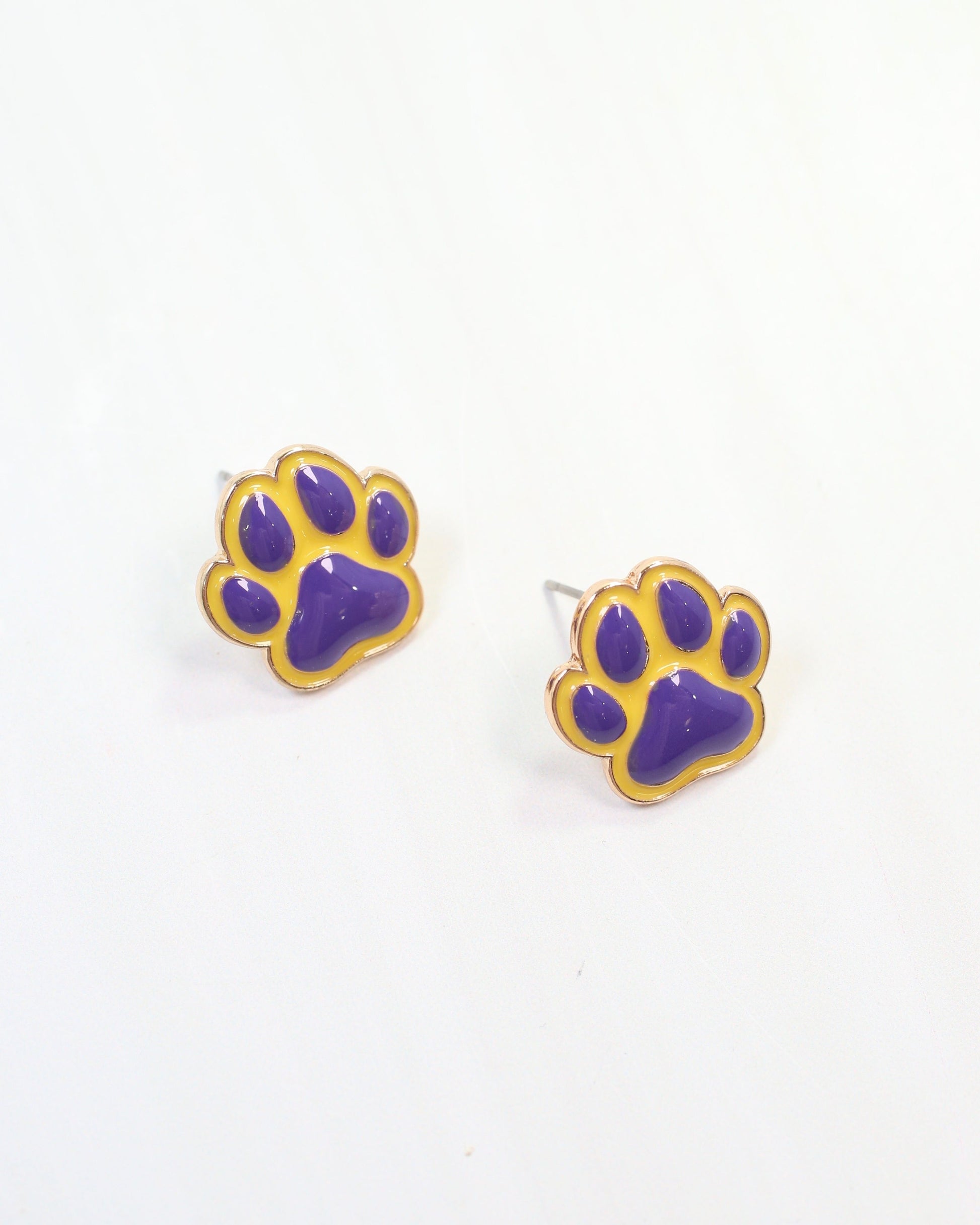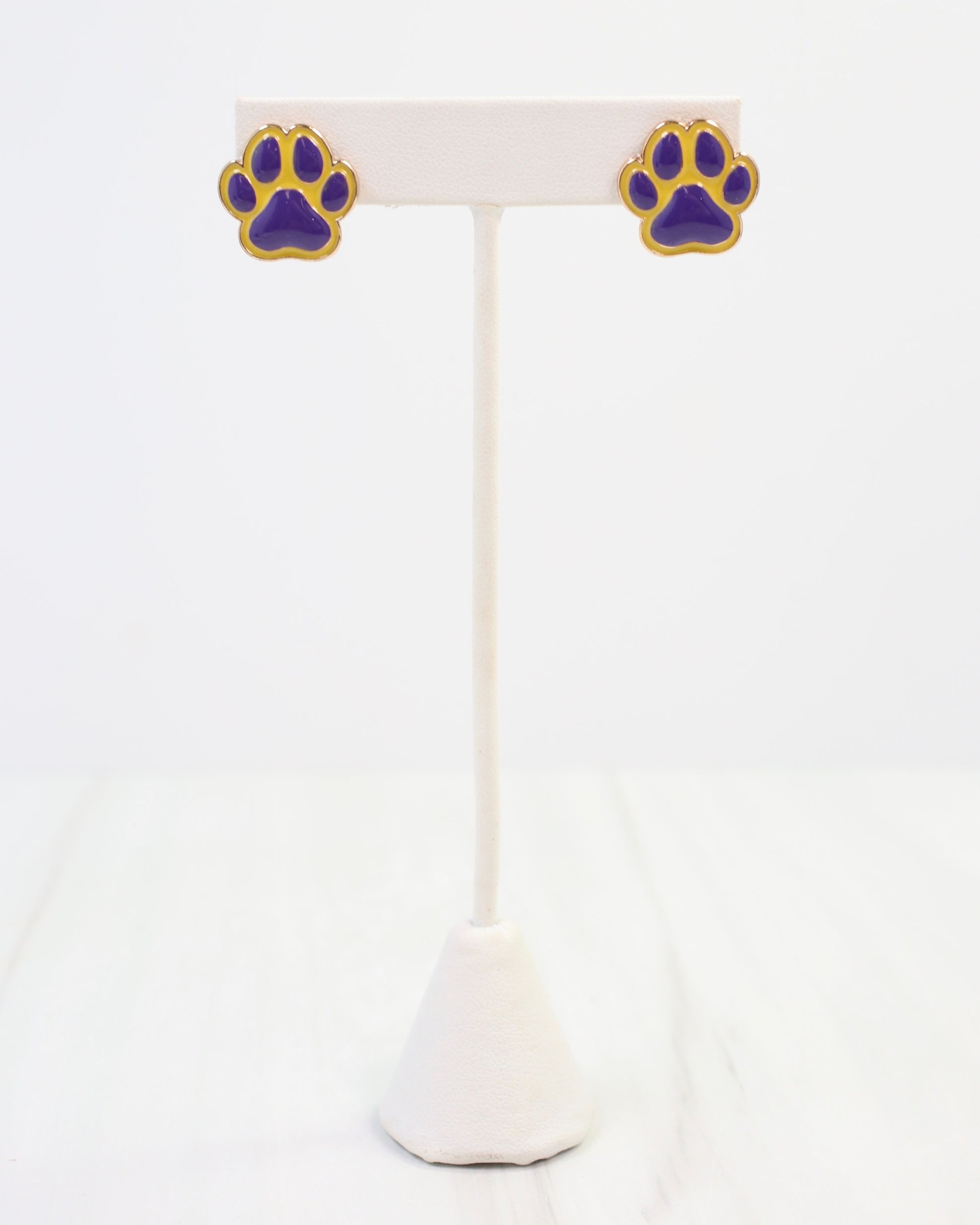 Show off your team spirit with the Go For It Paw Earring in Purple and Gold. This vibrant stud features a purple paw print set against a rich gold enamel background. A fashionable way to display your pride wherever you go.