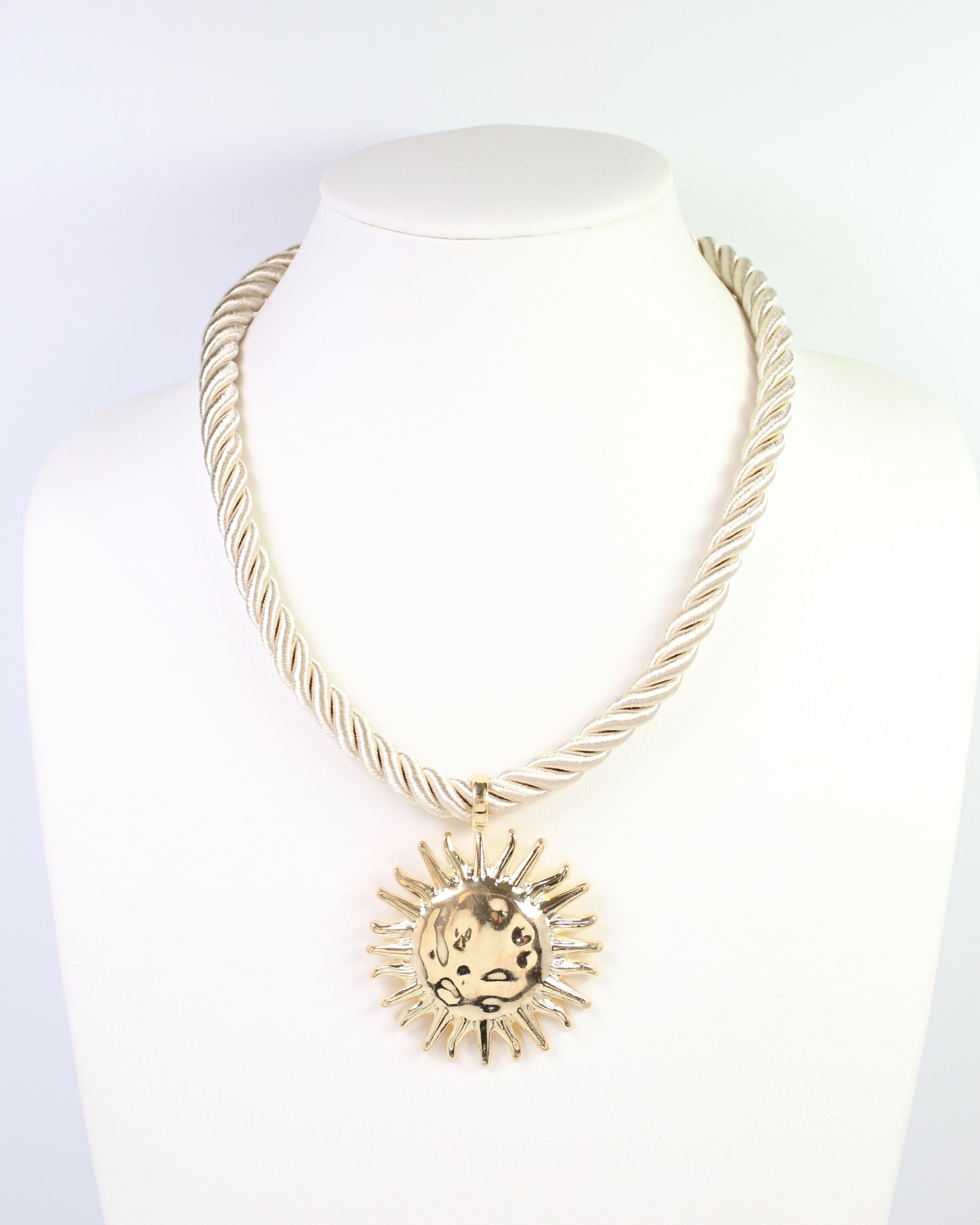 The Grand Haven Sun Cord Necklace in gold radiates warmth and positivity. A medium-sized sun charm hangs gracefully from a sleek cord, creating a cheerful focal point that works beautifully on its own or layered with other pieces. This versatile accessory brings sunshine-inspired style to any outfit.