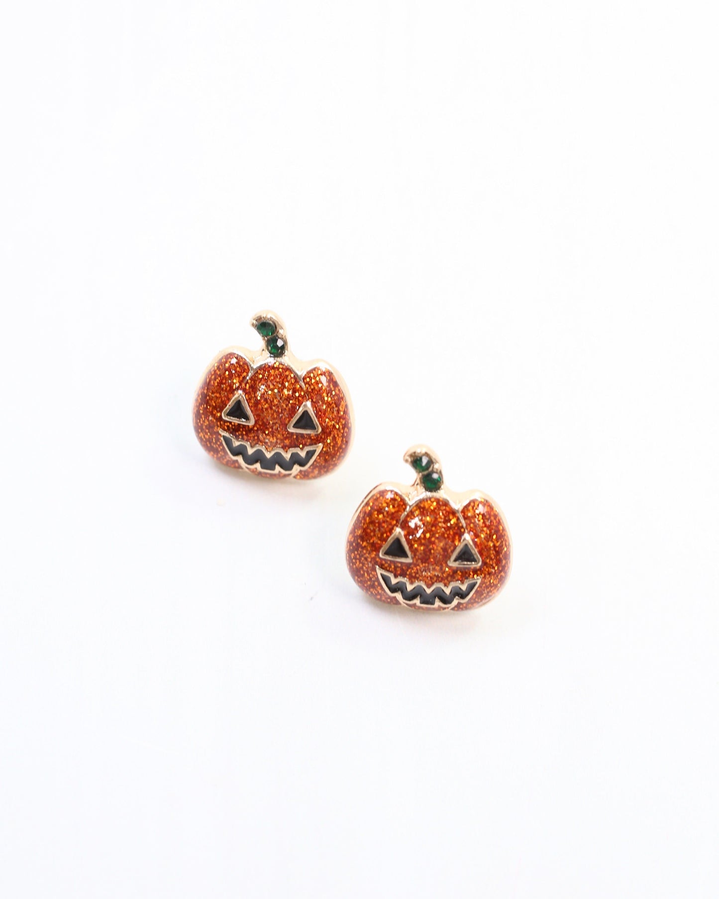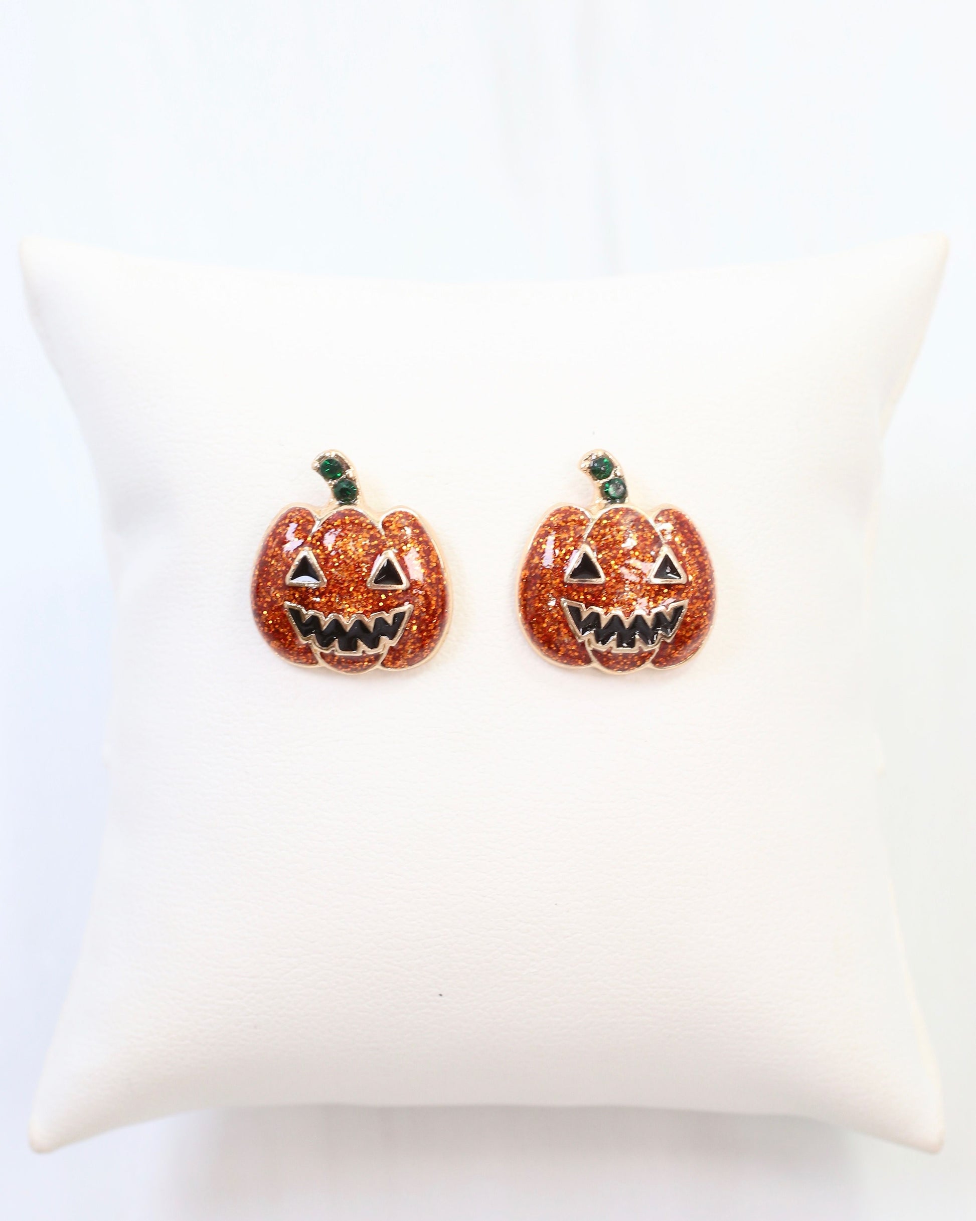 These glittery orange Jack O Lantern earrings feature a black enamel smiling face and green stone stems, perfect for adding a stylish Halloween touch.