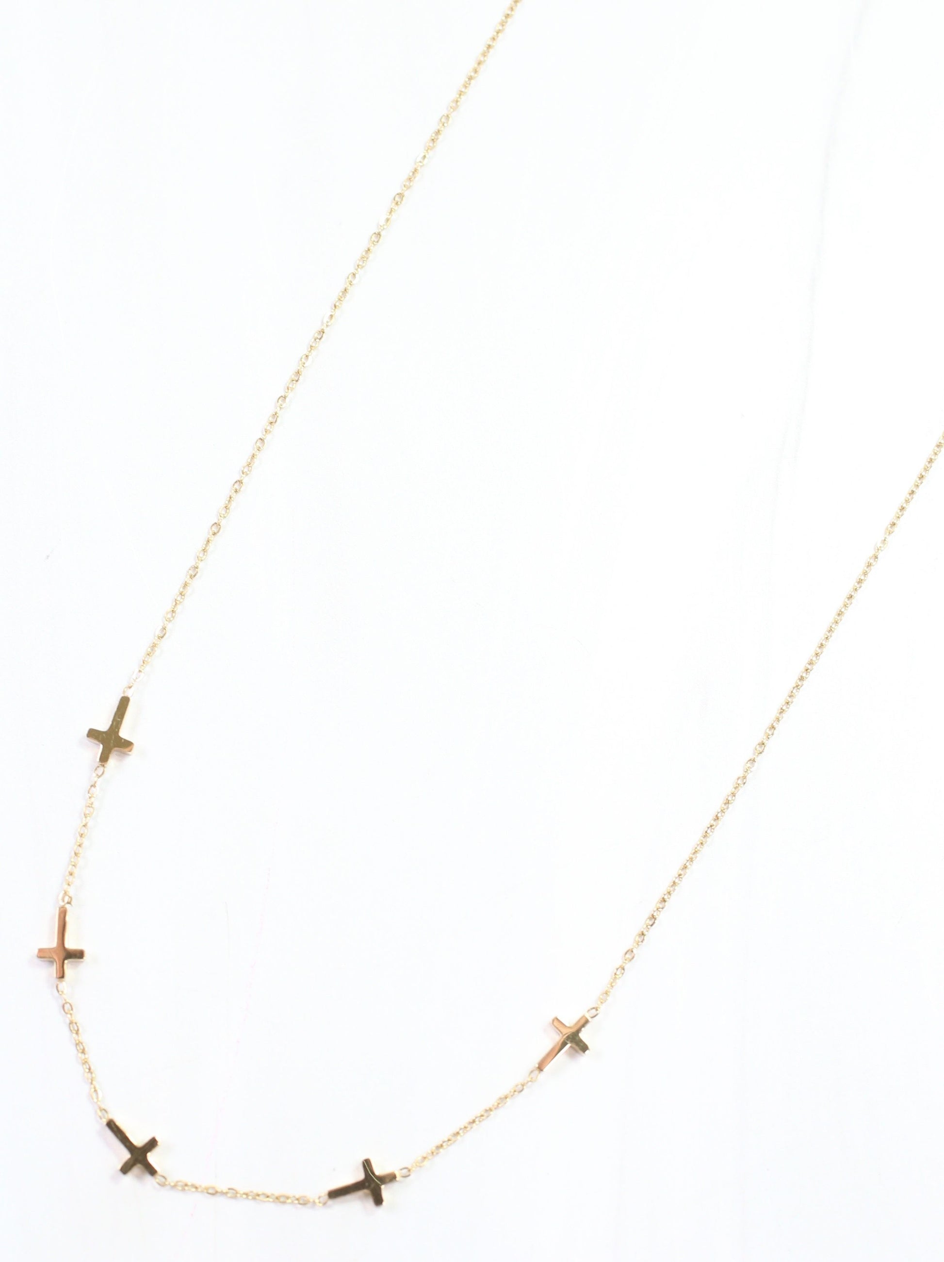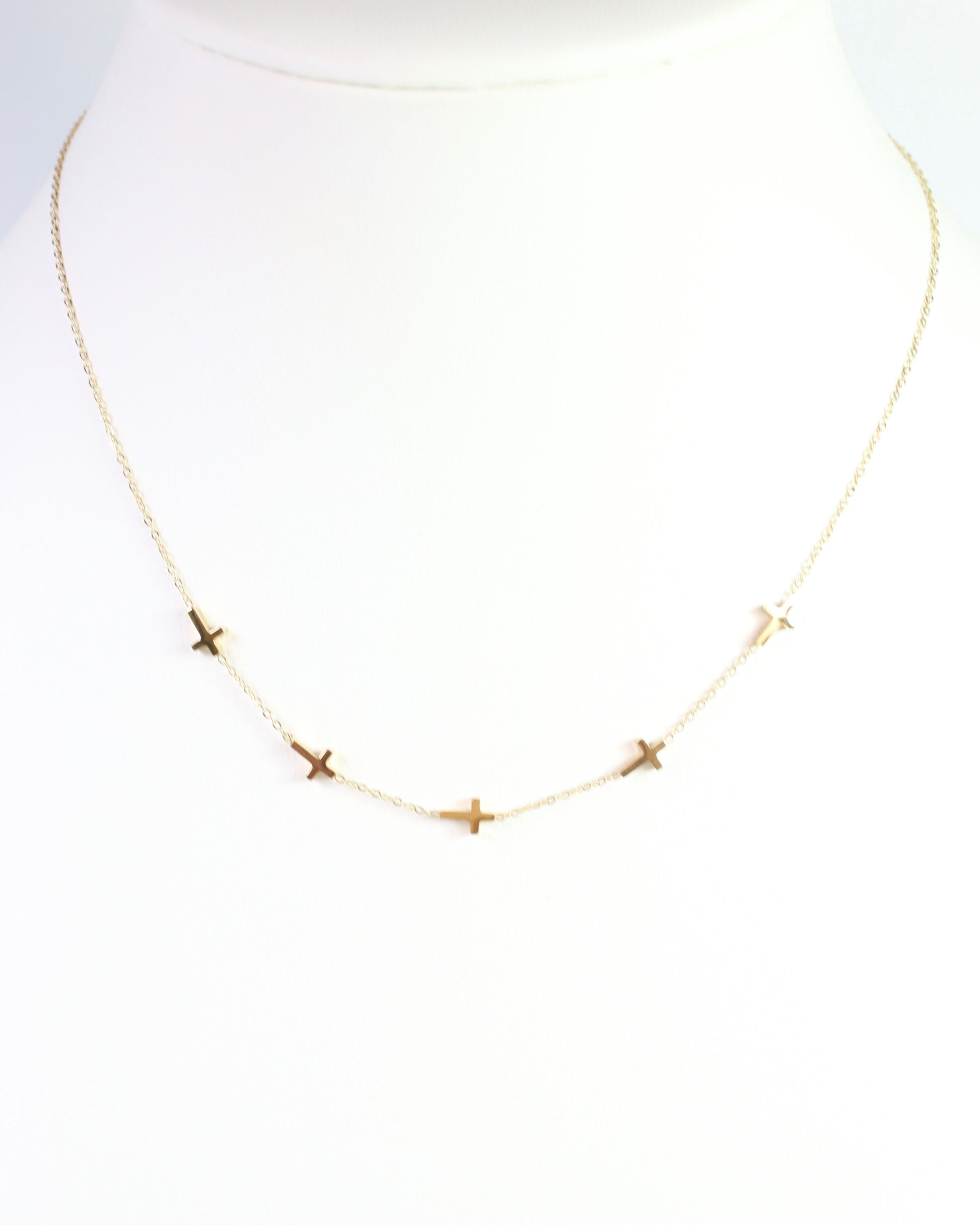 The Gunnison Cross Necklace in gold combines delicate design with timeless style. Featuring a fine gold chain adorned with petite, shiny stationary crosses, this necklace adds a subtle yet fashionable touch to any outfit.