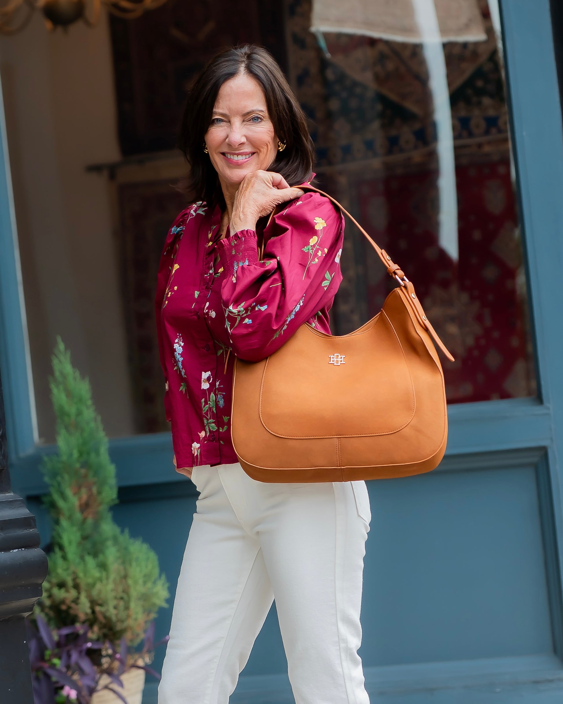 The Hadlee Hobo Bag in Saddle features a soft faux suede construction with an unstructured silhouette and gold stud shoulder strap. Magnetic closure, interior zippered pocket, and interior side pockets provide convenient storage. Lightweight and comfortable for everyday wear.