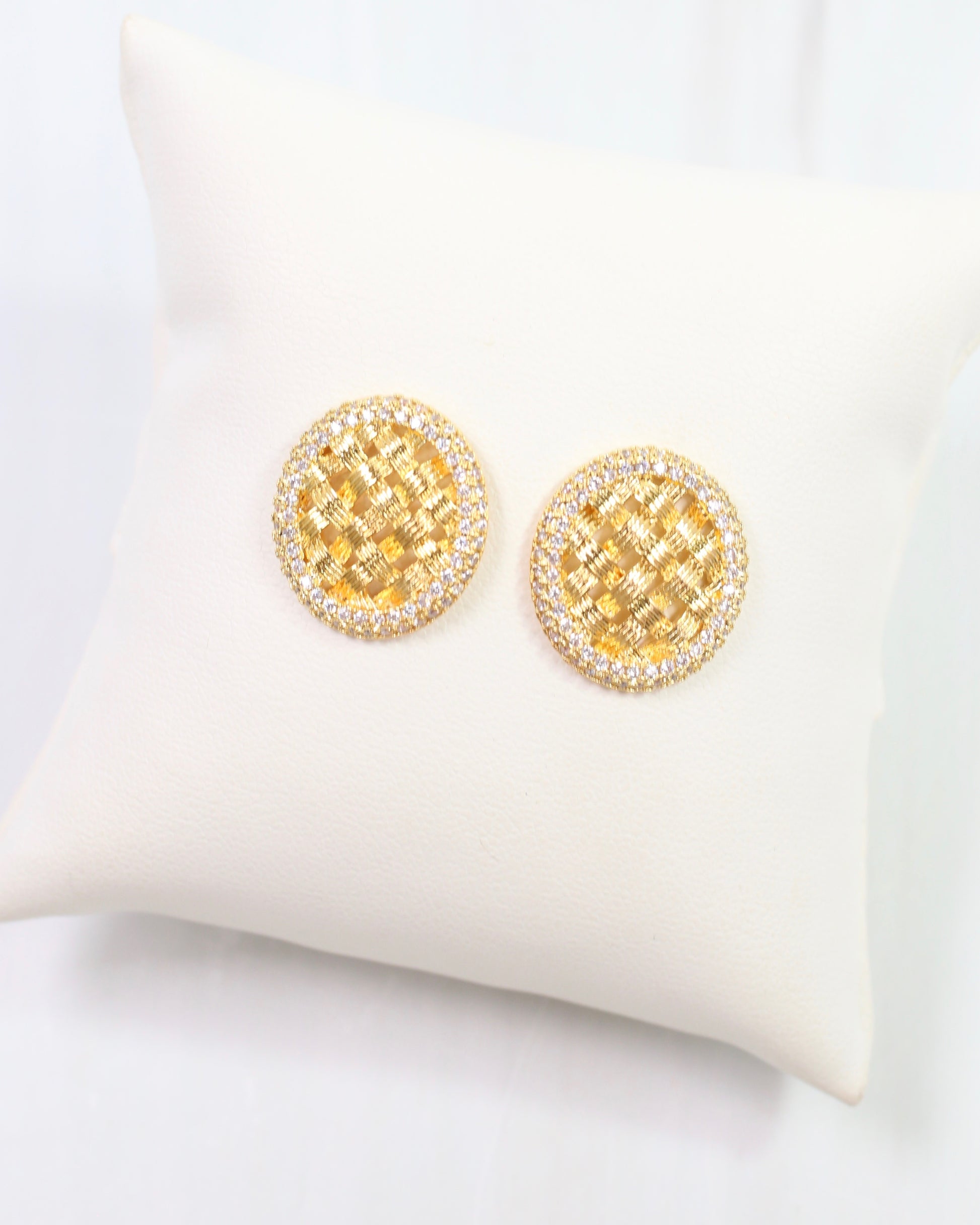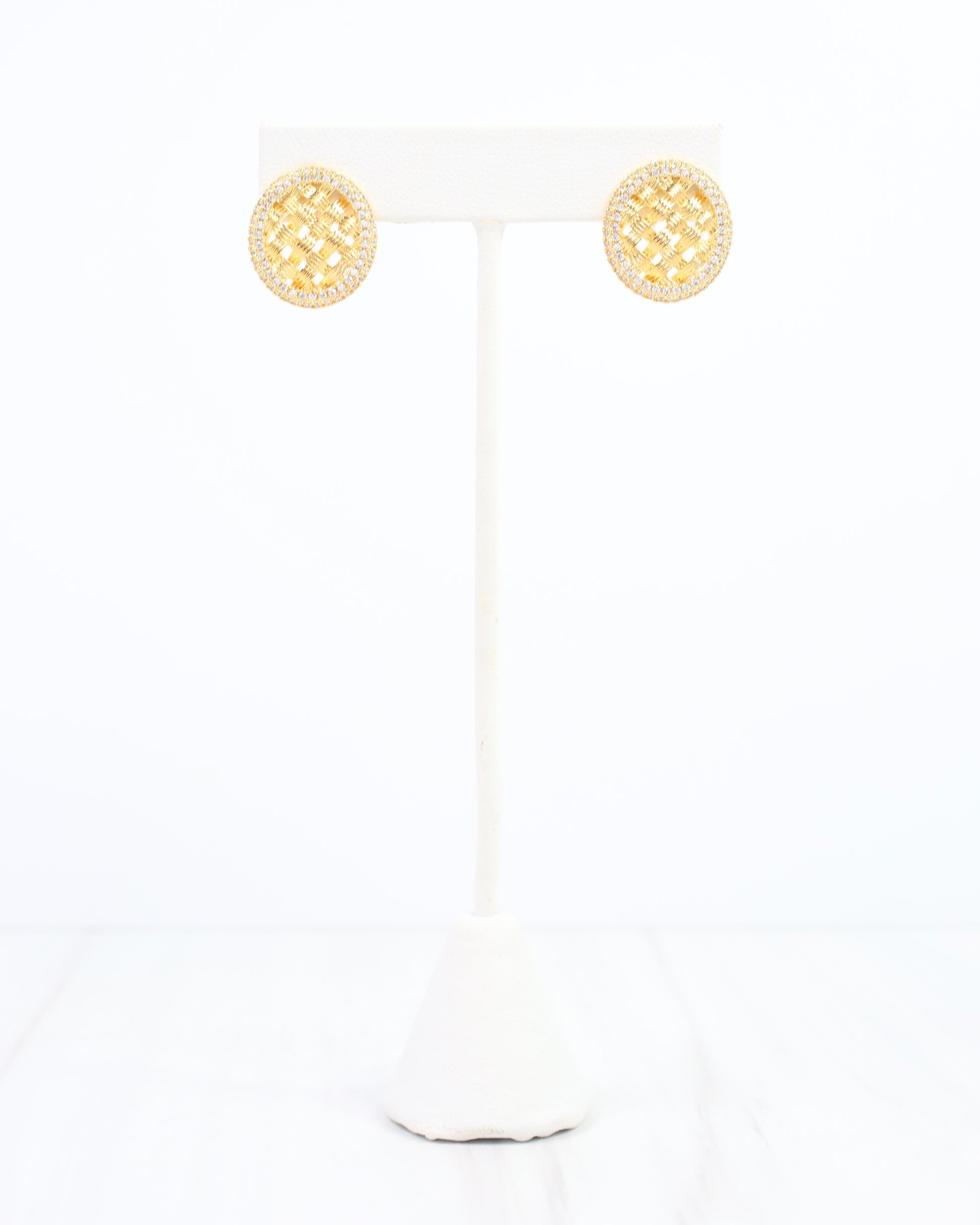 Add a touch of sparkle with the Hadley CZ Lined Stud Earrings in Gold. These playful, gold basketweave textured round studs feature a delicate CZ pave edge that catches the light just right. Perfectly sized for everyday glamour, they bring a subtle shine that’s classy without overdoing it. Ideal for brightening any outfit with just the right amount of sparkle!