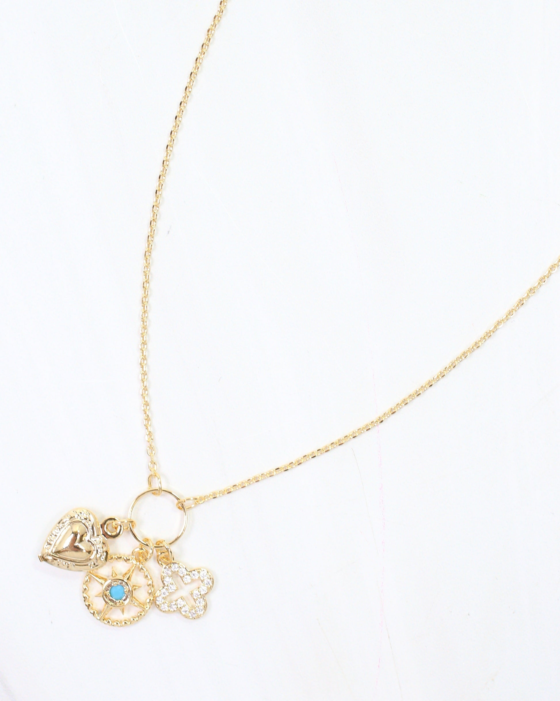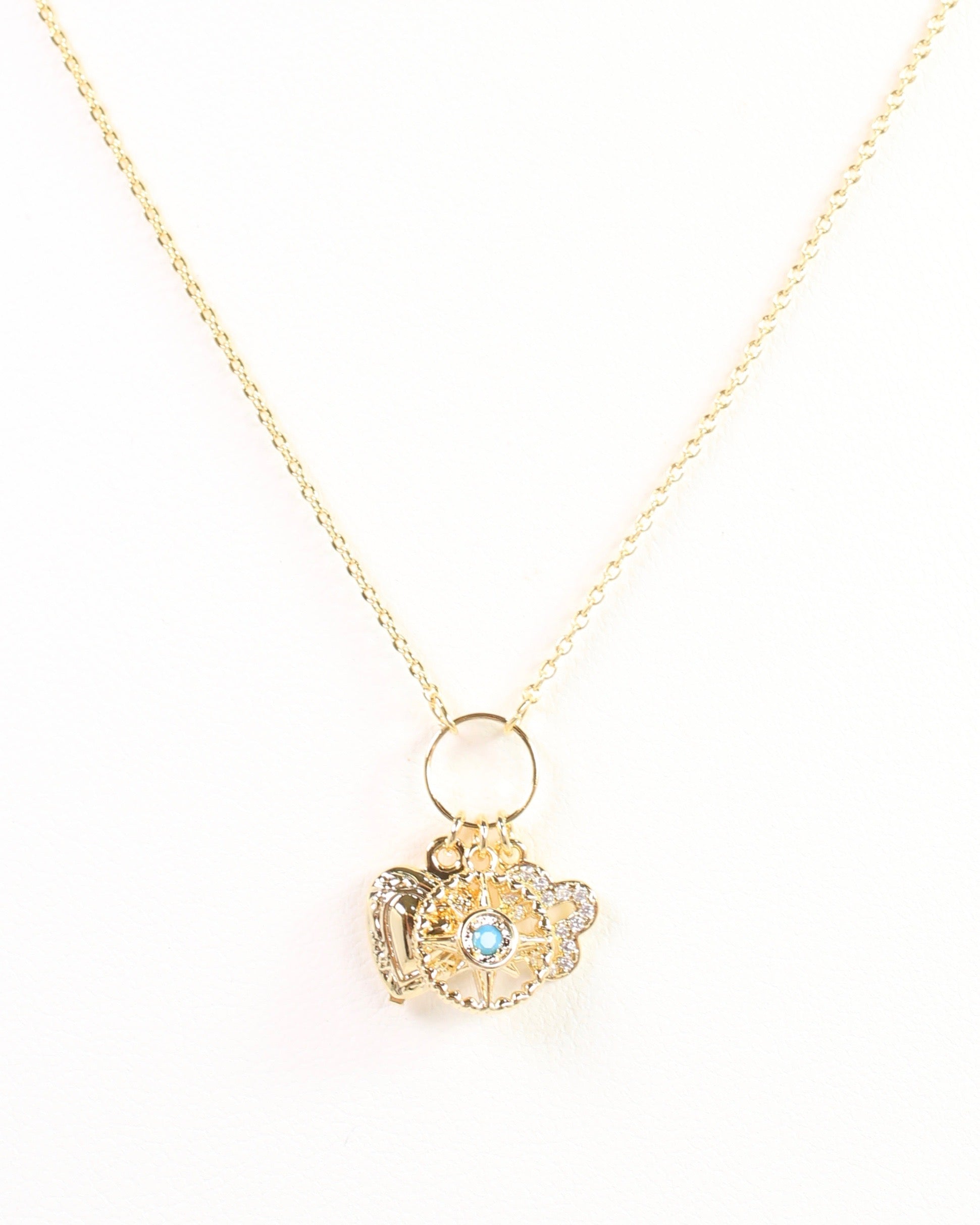 Delight in the prettiest petite charm necklace that’s pure charm! This dainty gold piece features a mini locket, a vibrant turquoise compass, and a lucky clover—together creating the cutest combo that adds a touch of whimsy and wanderlust to any outfit. Perfect for layering or wearing solo to brighten your day with a playful sparkle.