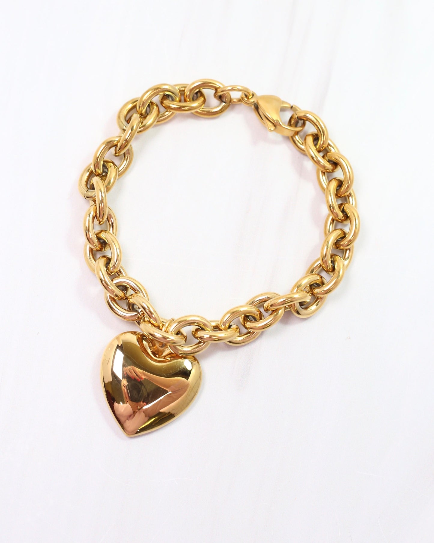 Add a touch of sparkle with the Hartley Heart Charm Bracelet in Gold! This shiny gold circular link bracelet features a charming puff heart that brings a playful yet classy vibe to any outfit. Crafted from stainless steel, it’s water resistant and ready to shine with you all day long. Perfect for adding a little love to your look!